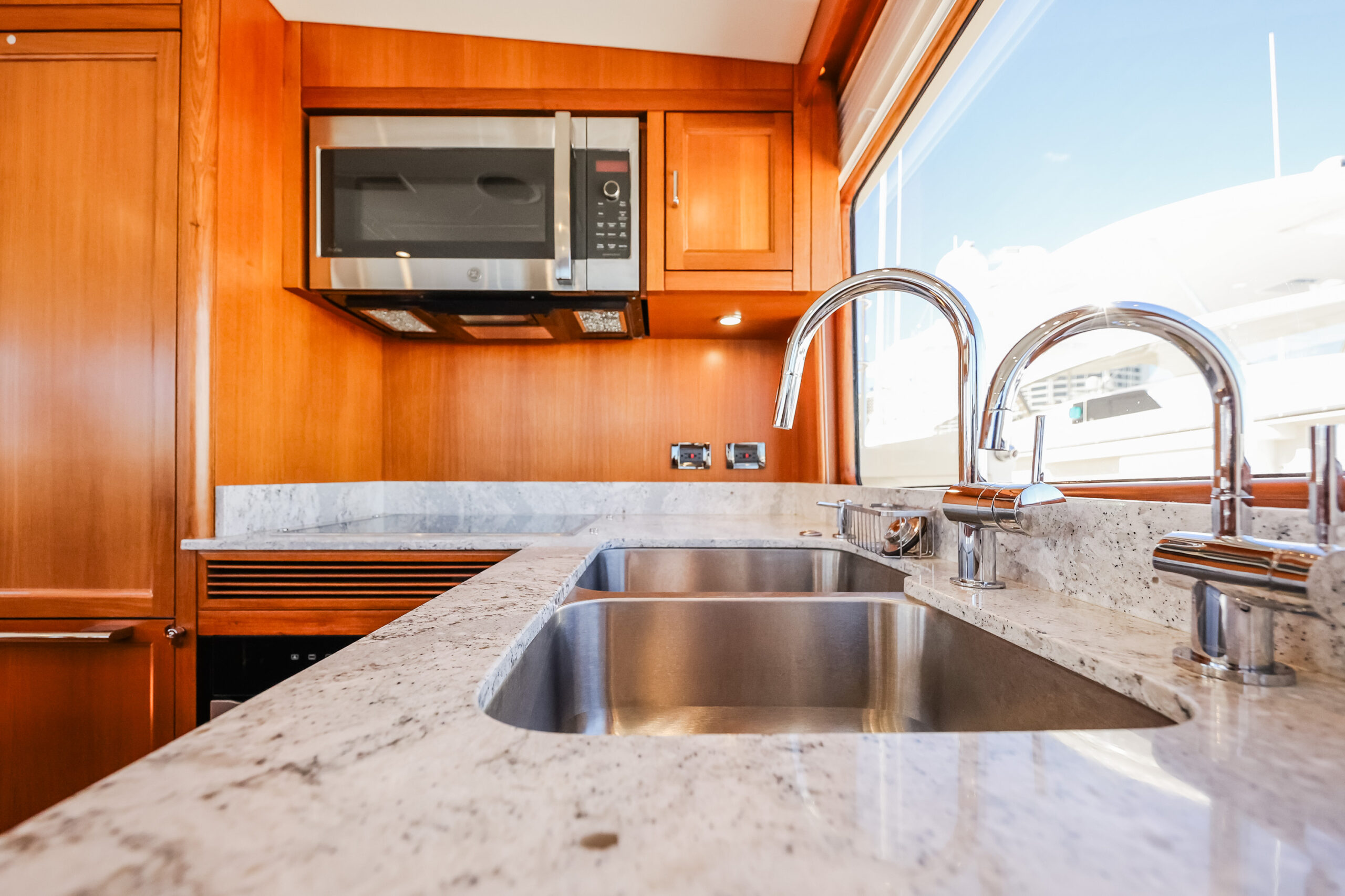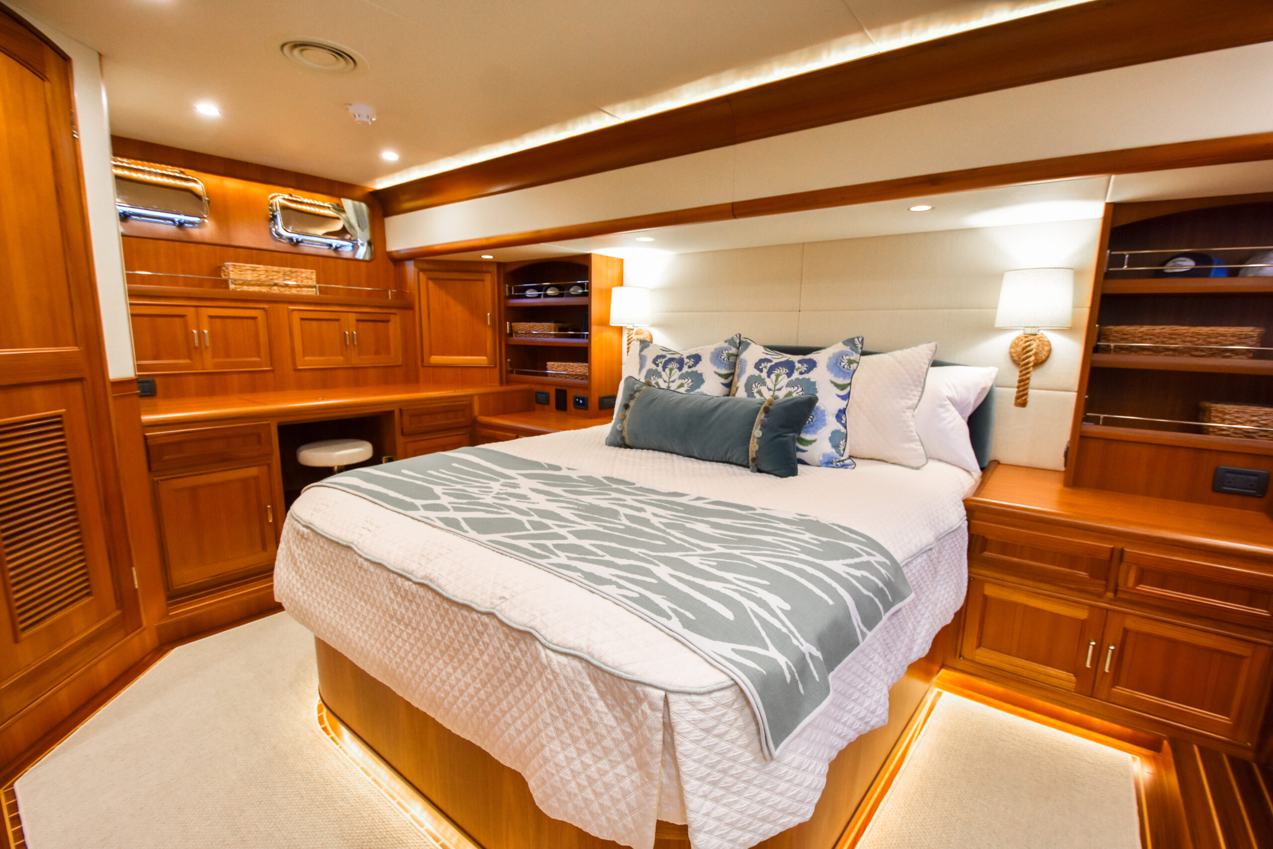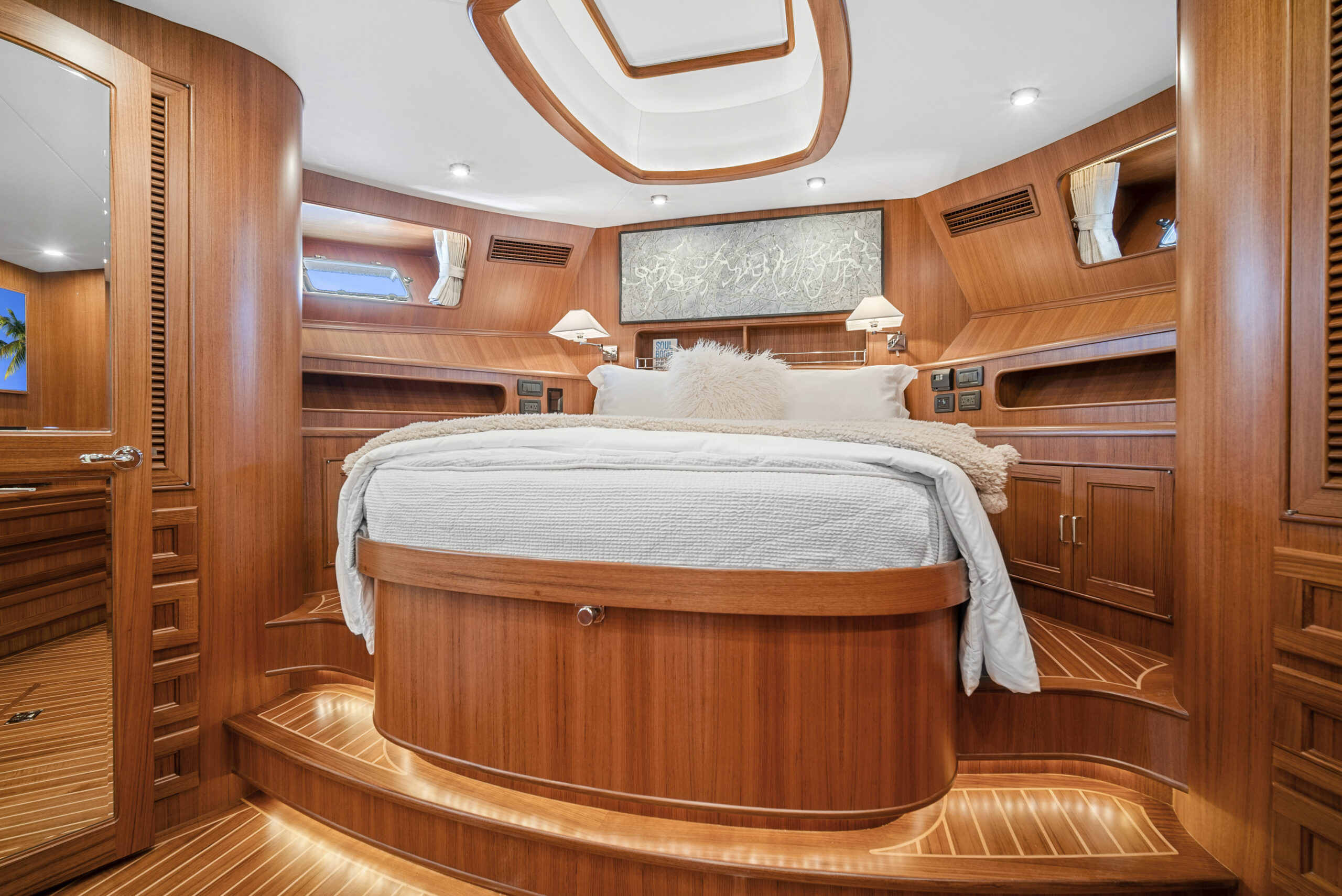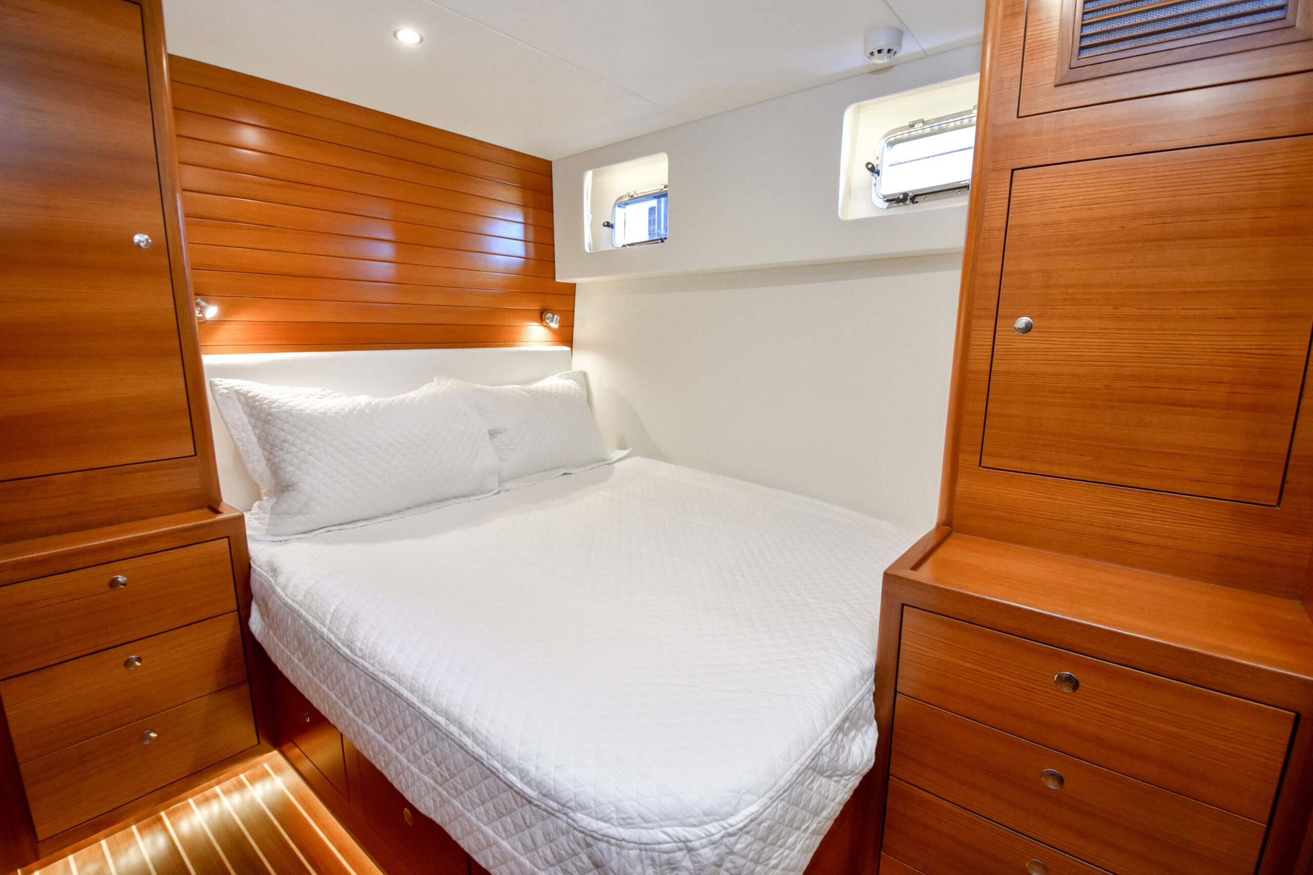 Despite these various trade-offs for the sake of seaworthiness, safety, and structural integrity, the Fleming Yacht is more than spacious enough and capable of exhibiting a luxury modern yacht interior. The semi-custom nature of the Fleming Yacht from the factory helps bring design and layout visions to life as you work with Fleming and Burr in the creation of your dream yacht. An extent of this flexibility can also be achieved for preowned Fleming Yachts with the guidance of Burr’s fabricators, carpenters, and interior designers to retrofit a pre-existing arrangement or decor to meet your goals.