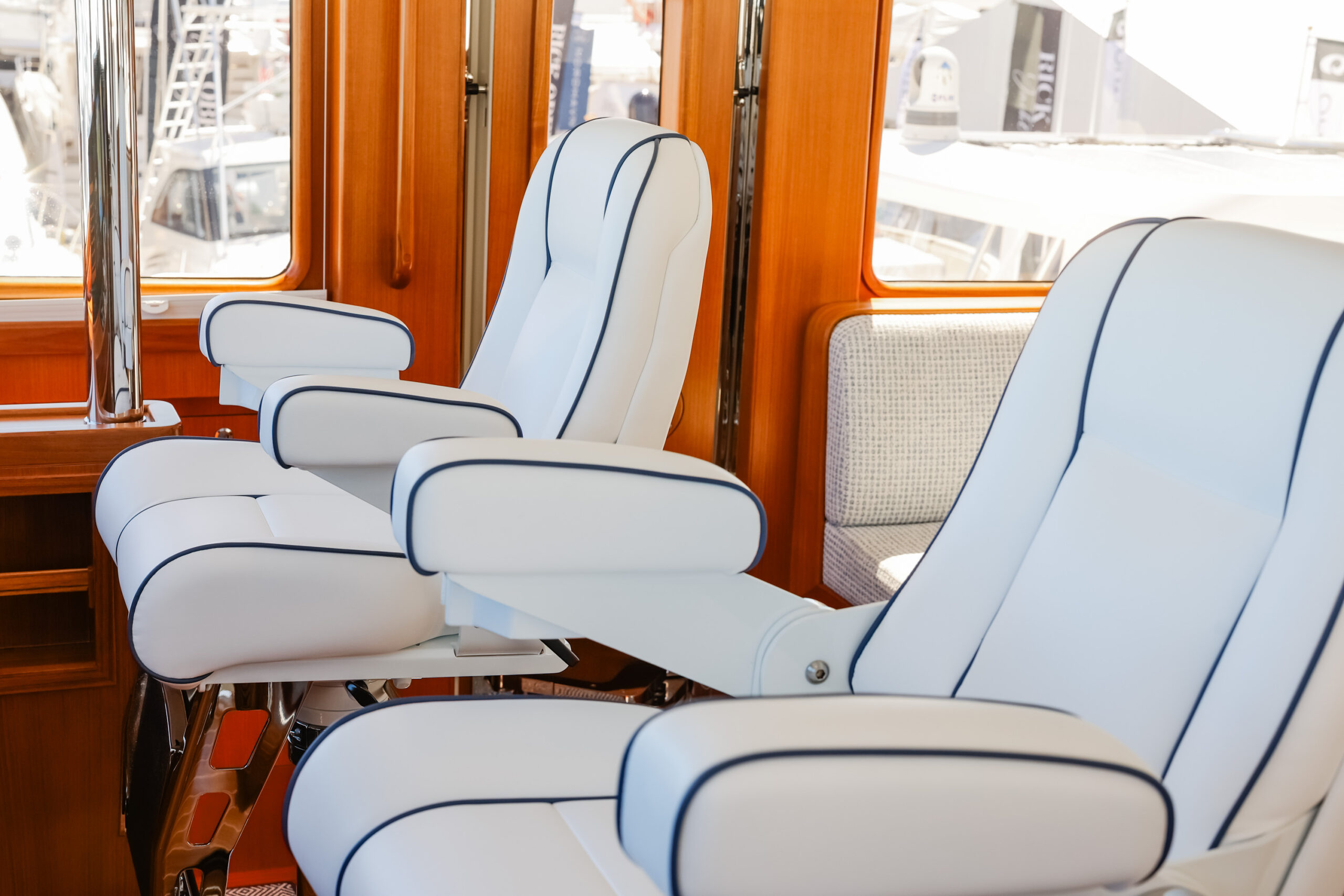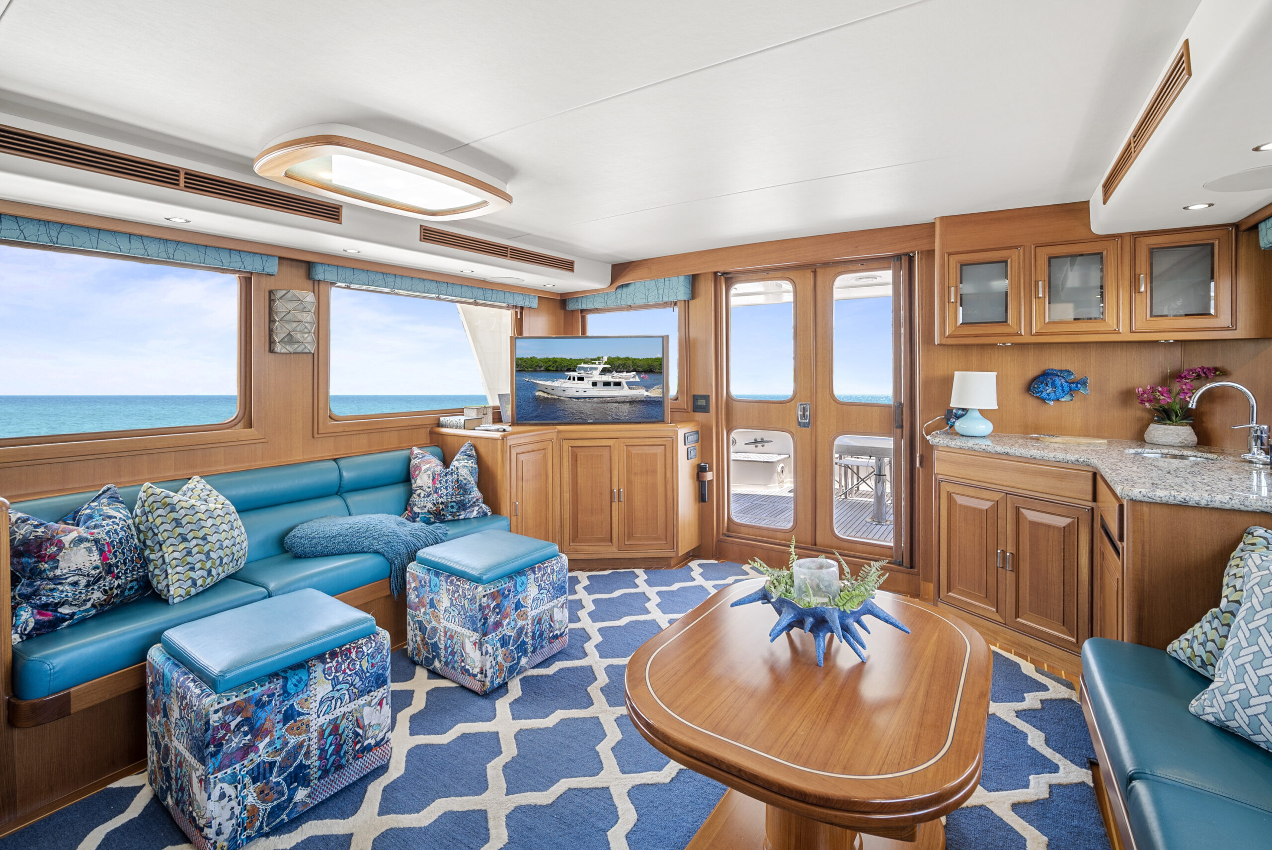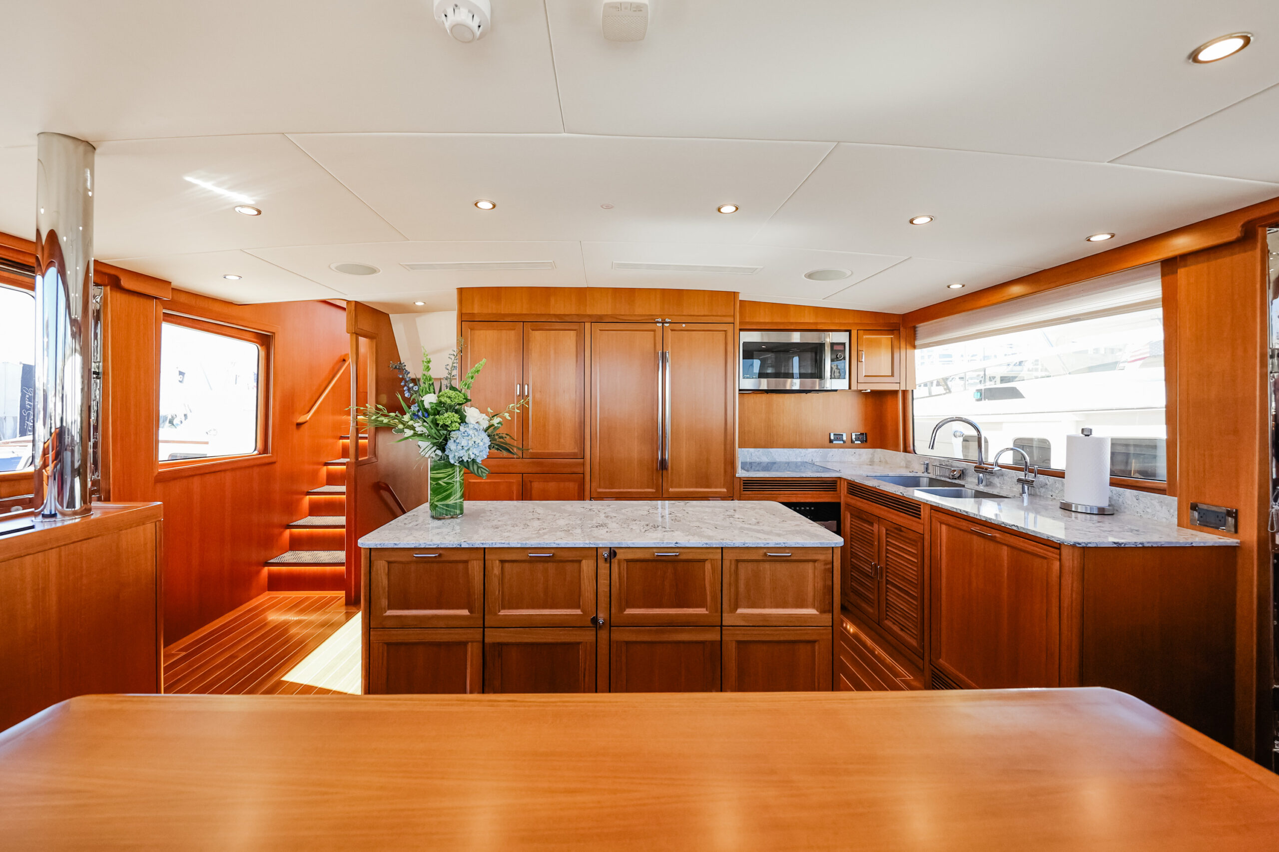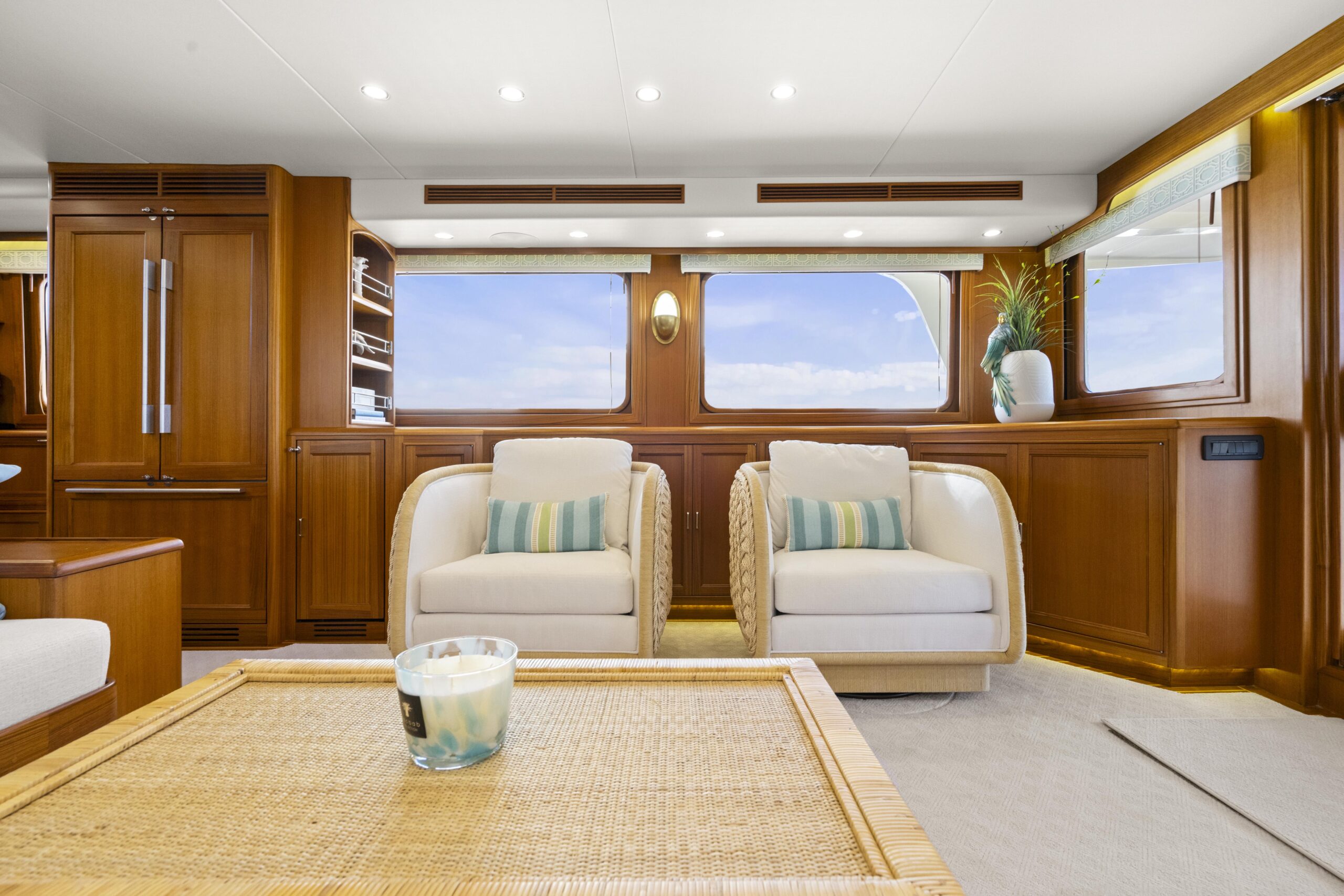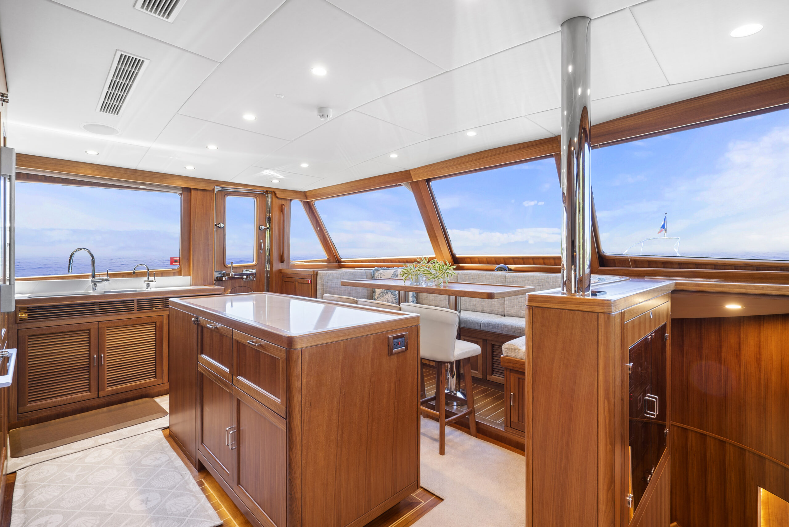 While current iterations of the Fleming line-up continue to respect the classic perfection achieved with these mainstay exterior lines, what of the interior design space? Much like an antique house or classic car, the exterior canvas is preferred to exude the timelessness and legacy of the subject. Meanwhile, the interior is trying to mostly match that same essence, yet aims to make trade-offs for comfort, livability, contemporary convenience, and modern advancements. Of course, modern yacht design of the Fleming Yacht utilizes the latest in marine equipment, onboard systems, navigation electronics, entertainment, and appliances. With all this modern yacht technology incorporated within the ultimate cruising yacht, it can make sense to lean stronger towards a more modern luxury yacht interior design to match the aesthetic. The Fleming can take on a diverse range of interior designs, whether modern or otherwise, and the team of experts at Burr Yacht Sales are available to help make your new or used Fleming yacht truly yours.