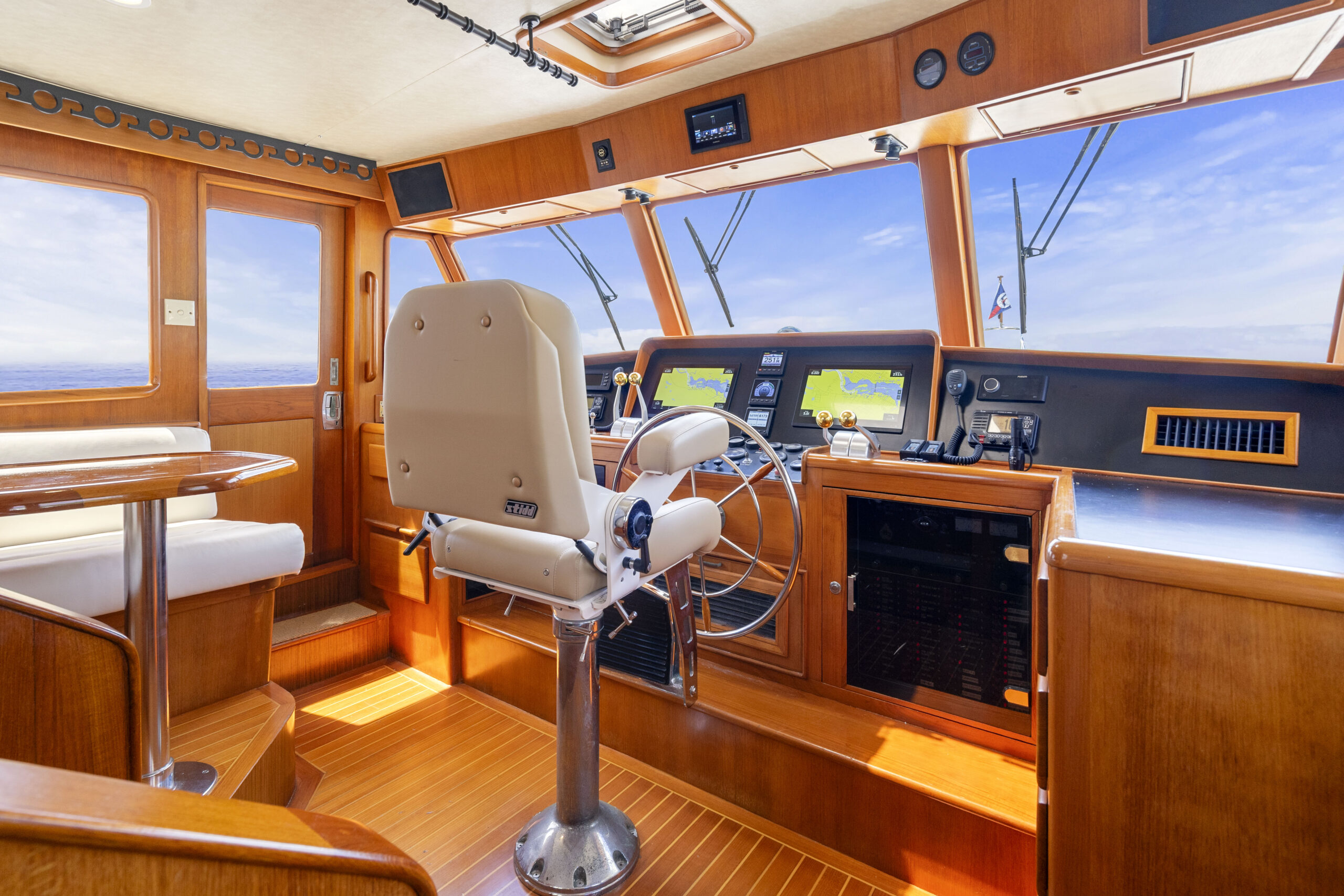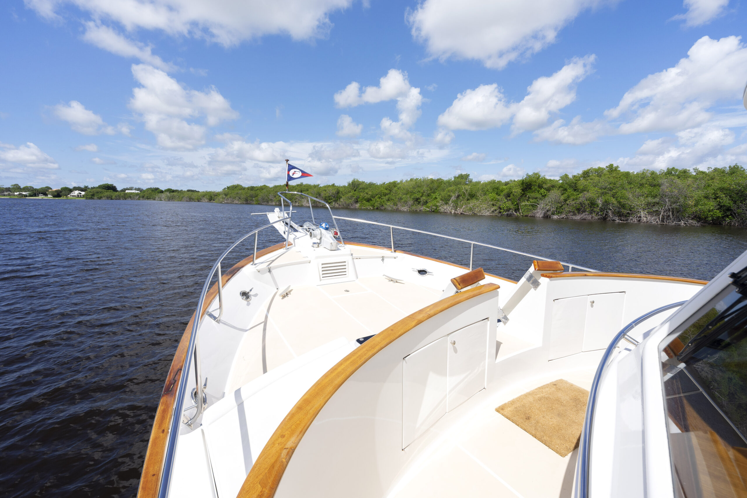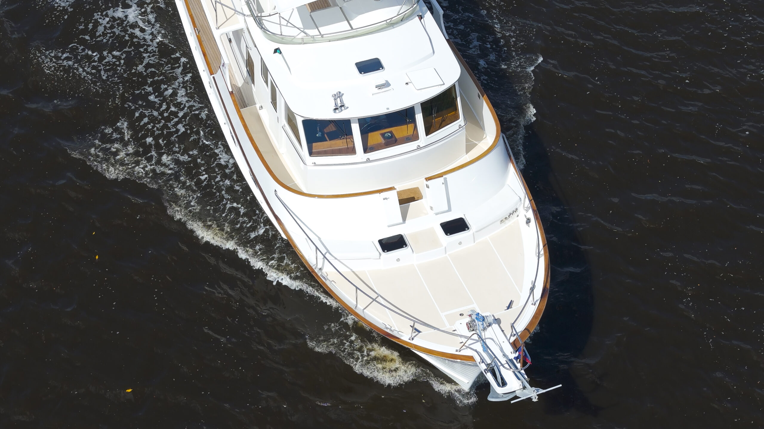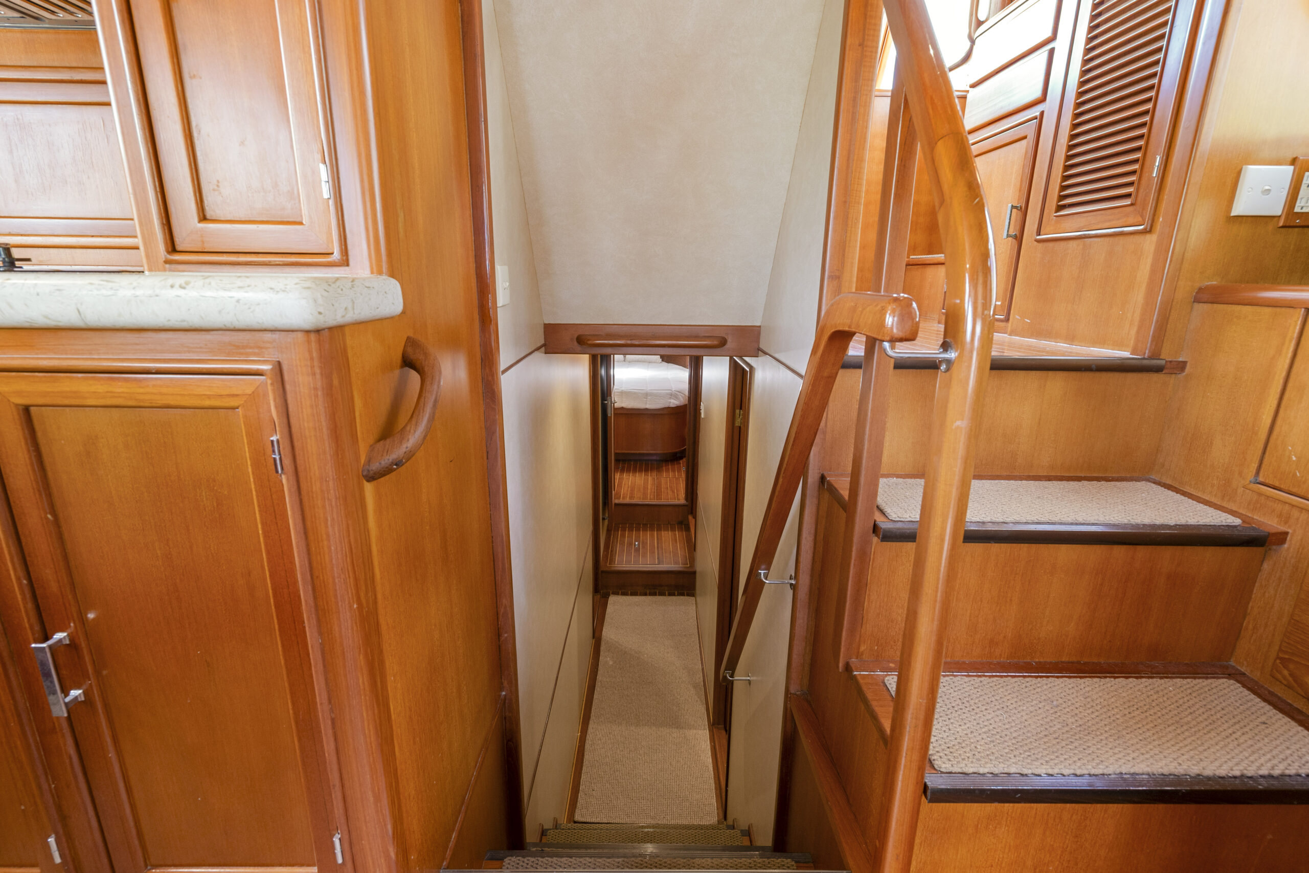 Following the five short steps straight down from the salon will lead you to the central passage of the accommodations. This traditional layout has been a signature mainstay in the Fleming 55 that provides an easy and convenient flow of traffic throughout the boat. This central accommodations passage also makes it possible to appreciate the full length of the vessel from forepeak bulkhead to transom. A manual whale pump is located beneath the accommodation steps from the salon. Once in the passageway you will find upper/lower bunks in the cabin to starboard and a VIP guest stateroom to port with twin berths. Just forward of the starboard side cabin in the passageway is the guest head. The en-suite master stateroom tops off the accommodations at the forward peak of the vessel.