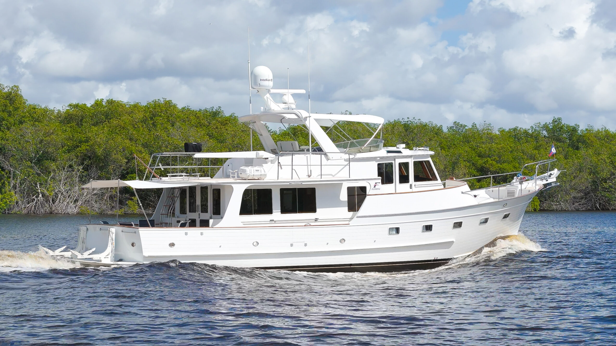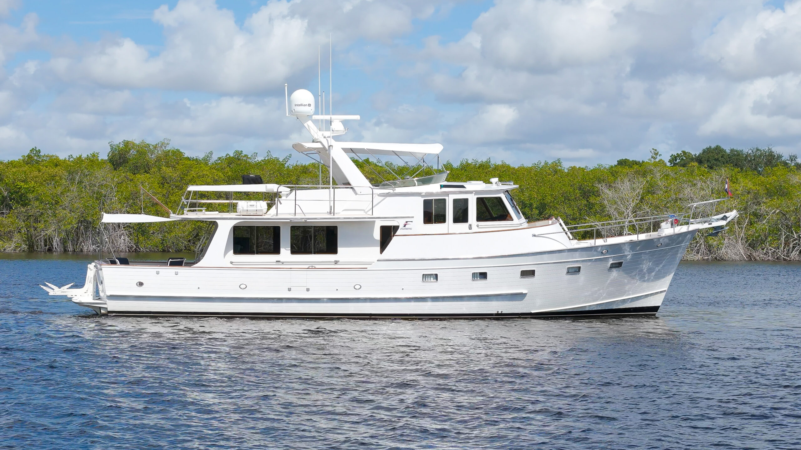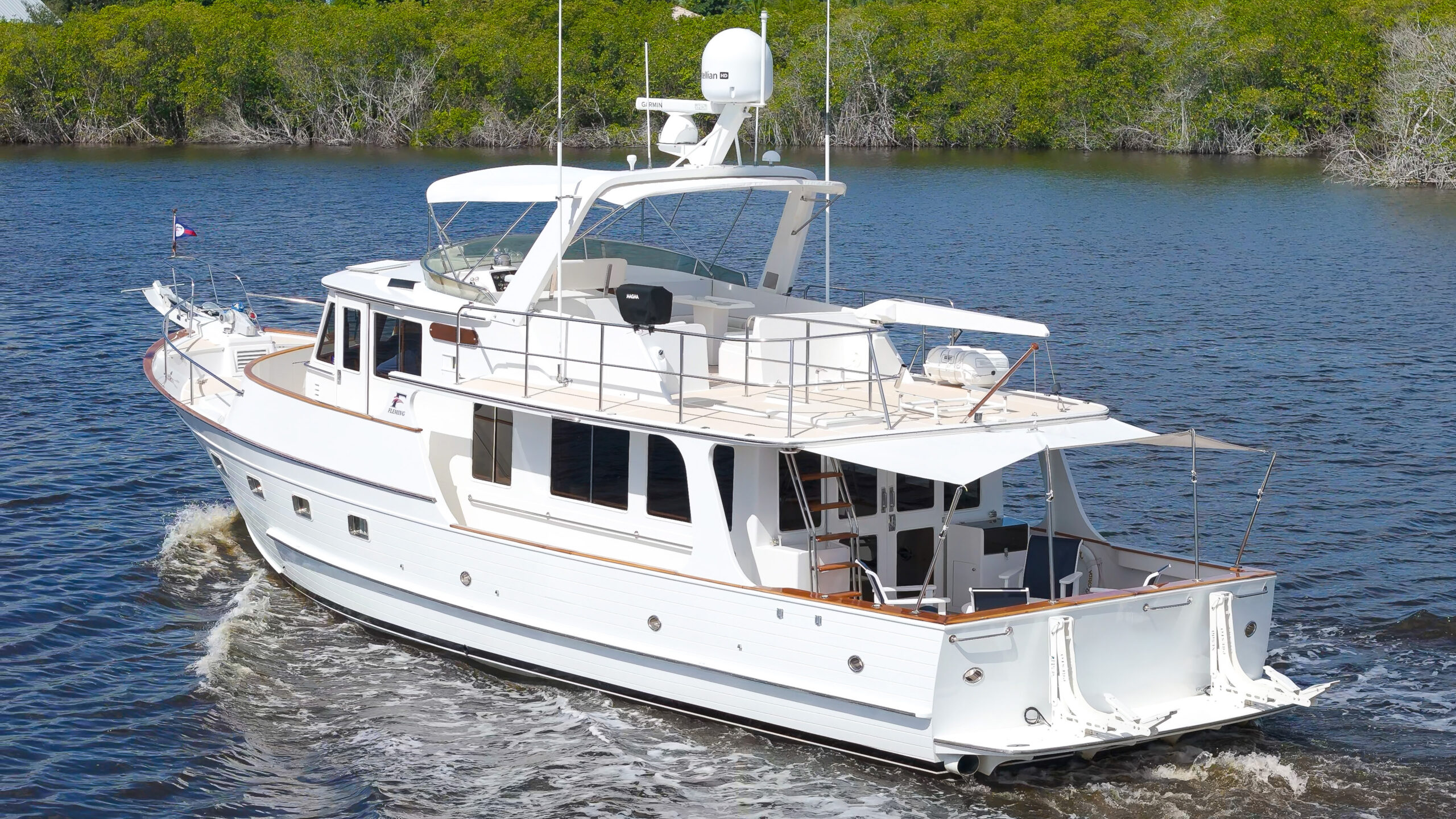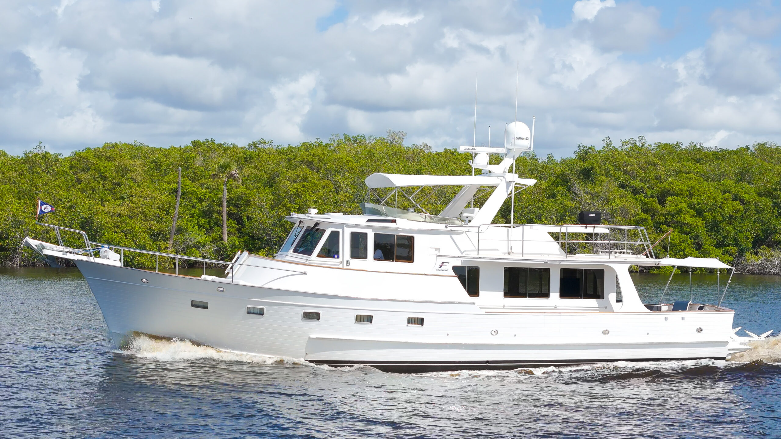 Following the five short steps straight down from the salon will lead you to the central passage of the accommodations. This traditional layout has been a signature mainstay in the Fleming 55 that provides an easy and convenient flow of traffic throughout the boat. This central accommodations passage also makes it possible to appreciate the full length of the vessel from forepeak bulkhead to transom. A manual whale pump is located beneath the accommodation steps from the salon. Once in the passageway you will find upper/lower bunks in the cabin to starboard and a VIP guest stateroom to port with twin berths. Just forward of the starboard side cabin in the passageway is the guest head. The en-suite master stateroom tops off the accommodations at the forward peak of the vessel.