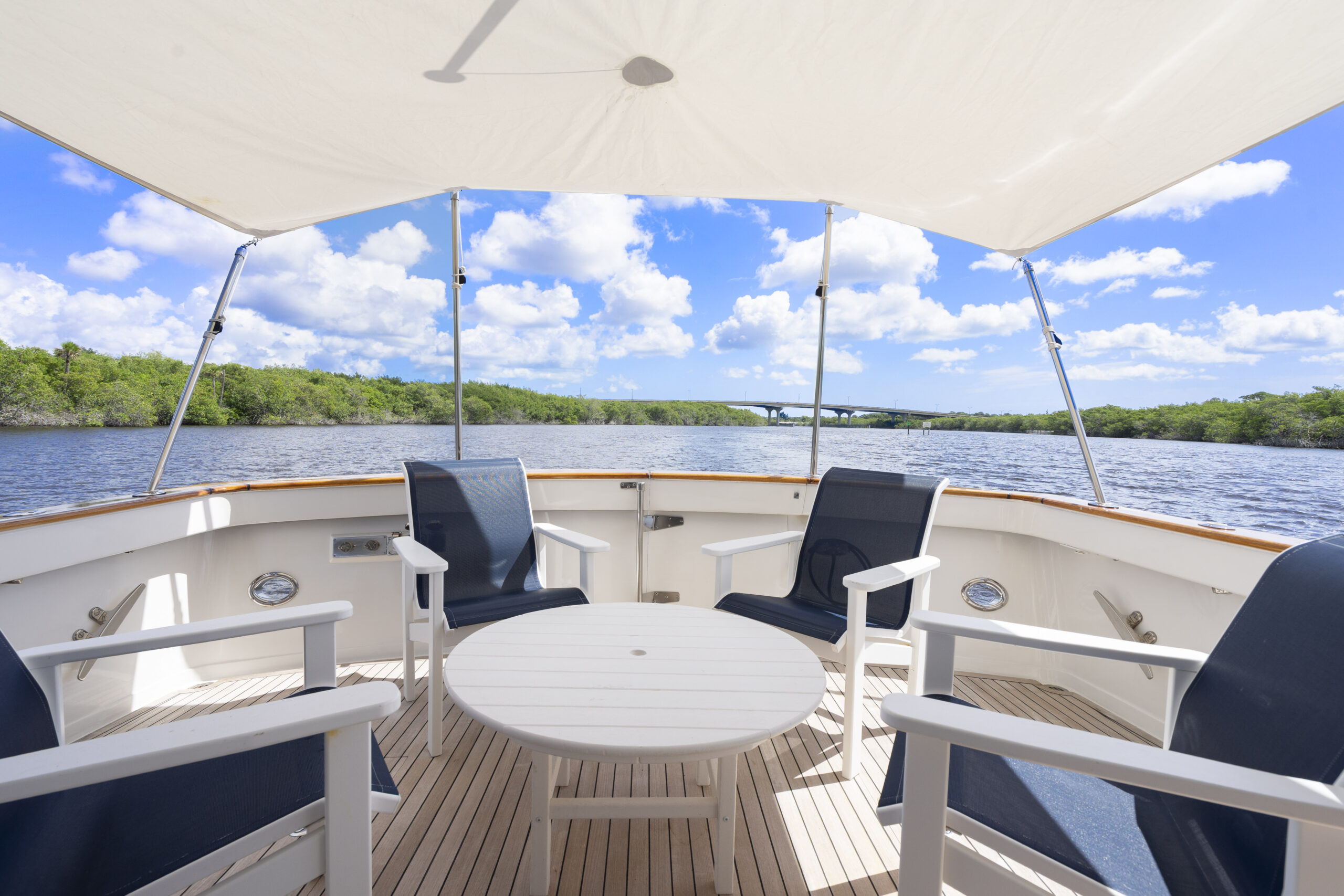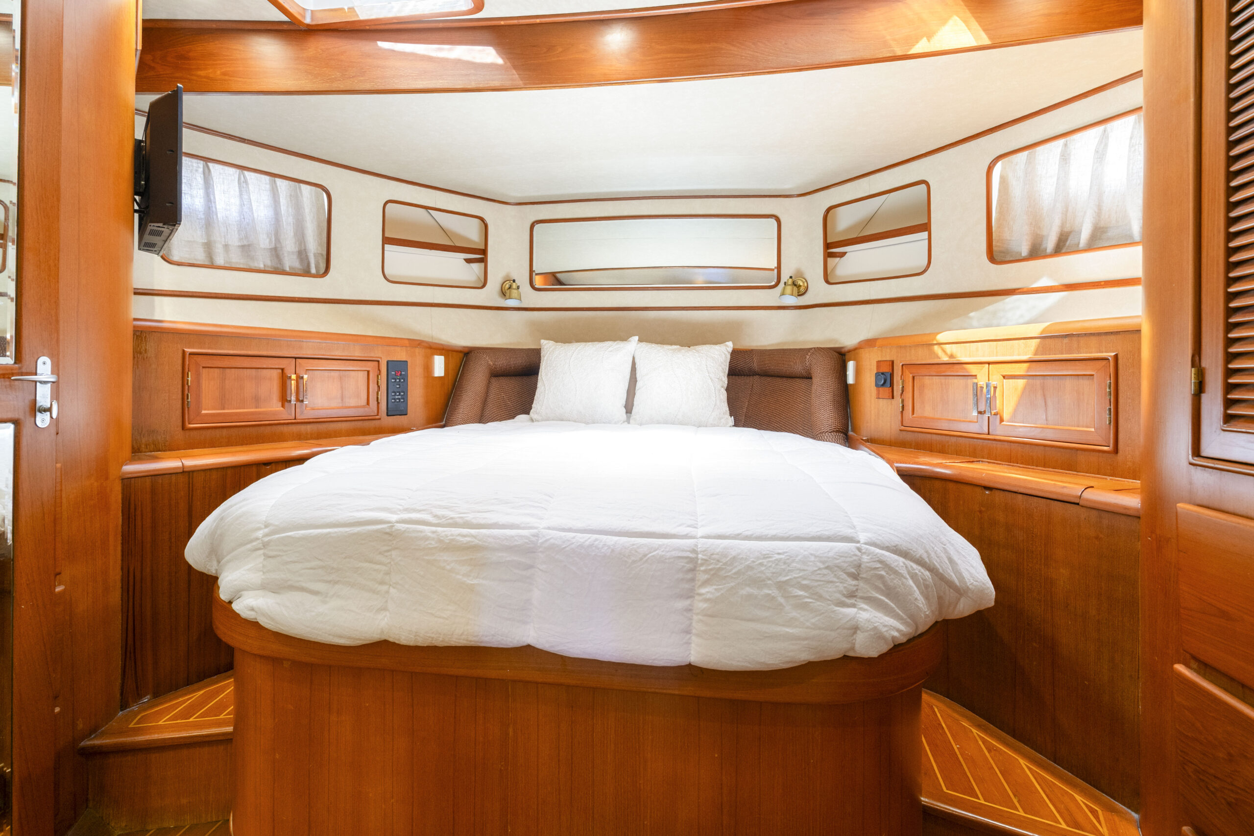 The master stateroom is composed of a queen sized island berth, with a new custom mattress, surrounded by shelves, cabinets, drawers, and his & hers hanging lockers to either side. This island berth arrangement allows for access from either side and the berth can be raised with gas-assisted struts to access a large storage cavity underneath, perfect for storing extra bed linens or keeping valuables out of sight. Over head are two hatches which, along with port holes to each side, provide natural light to the cabin. A wall-mounted HD TV and access to the en-suite master head is found to the port side of the cabin.