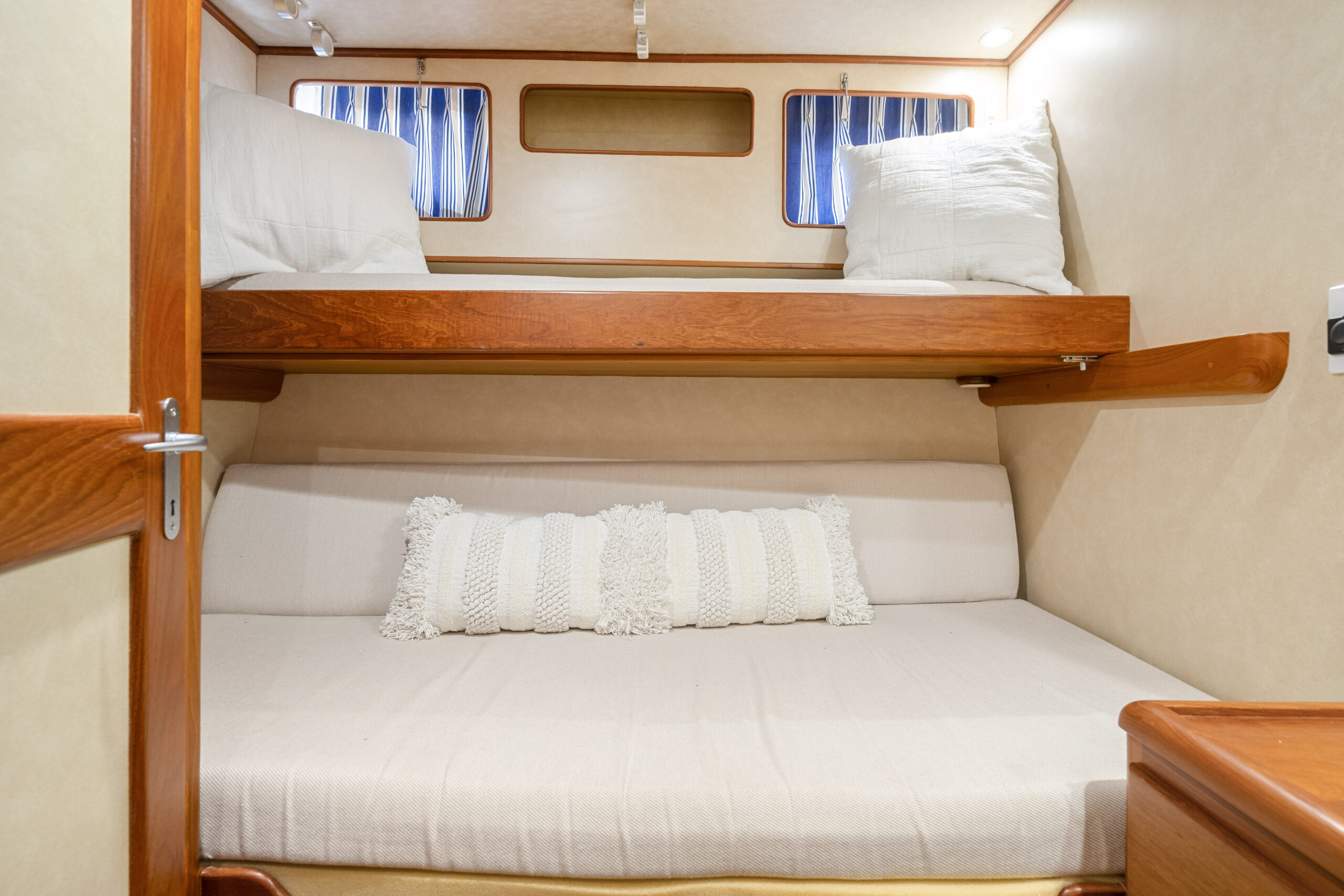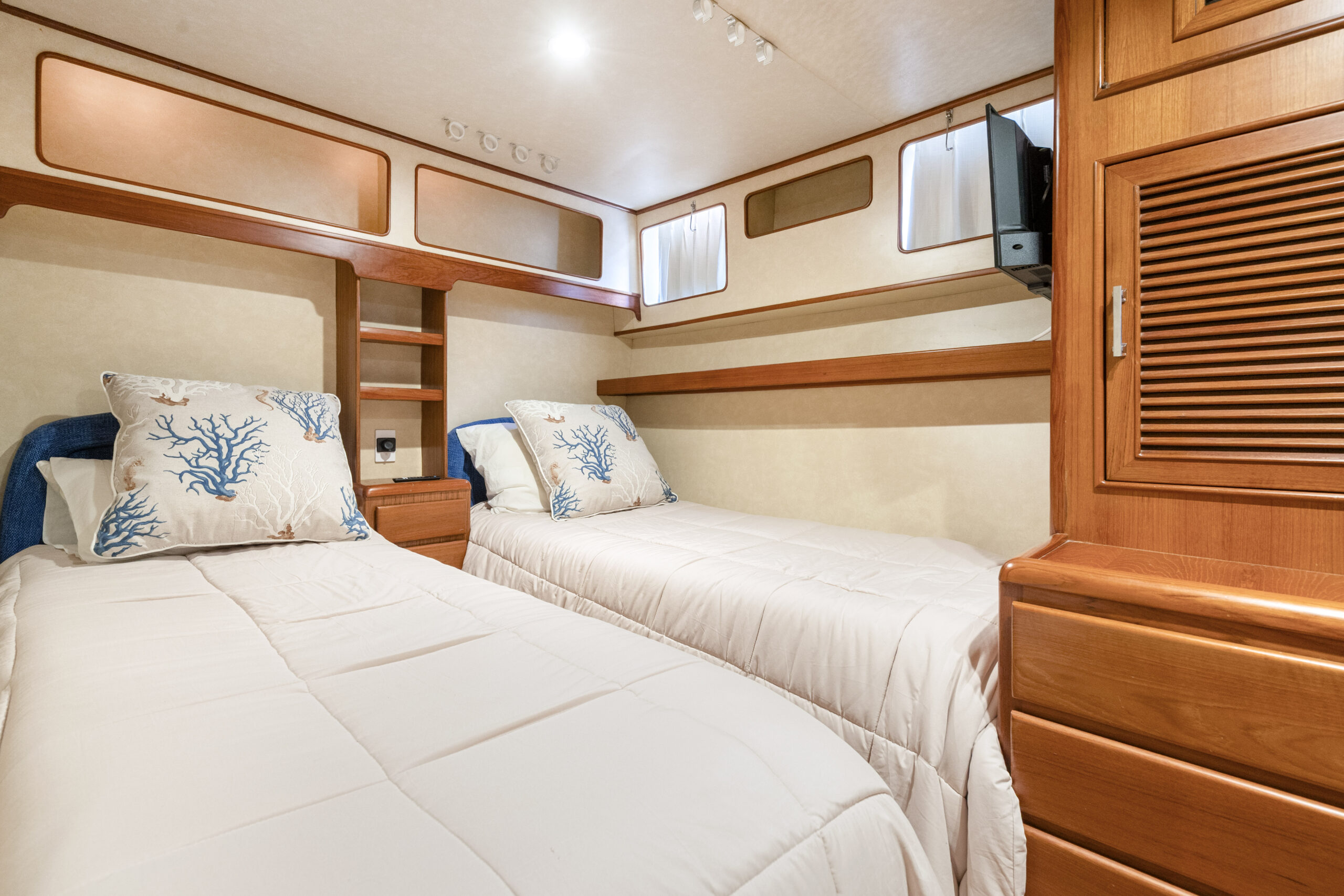 The port stateroom features two twin-sized berths with a nightstand separating them. Storage is provided through a hanging locker, dresser drawers, shelving above, and drawers beneath the berths. A wall-mounted HD TV is found at the foot of the outberth berth. The starboard stateroom features an upper and lower bunk arrangement with ample storage through drawers, shelving, and cabinets.