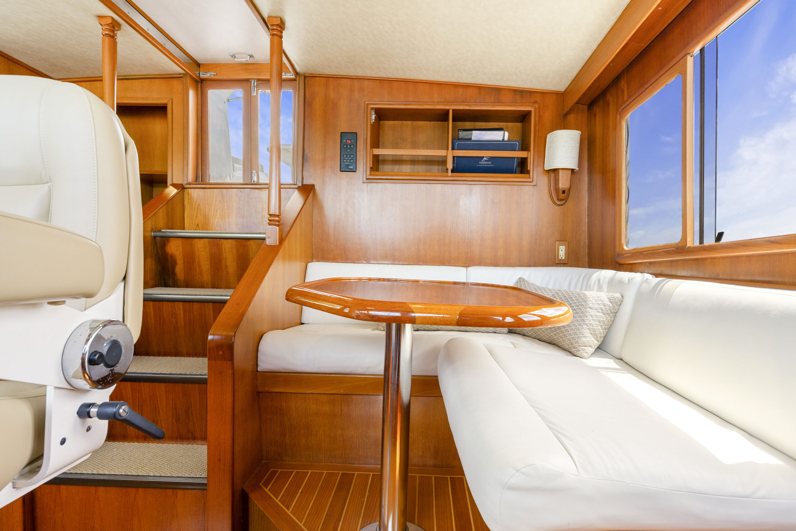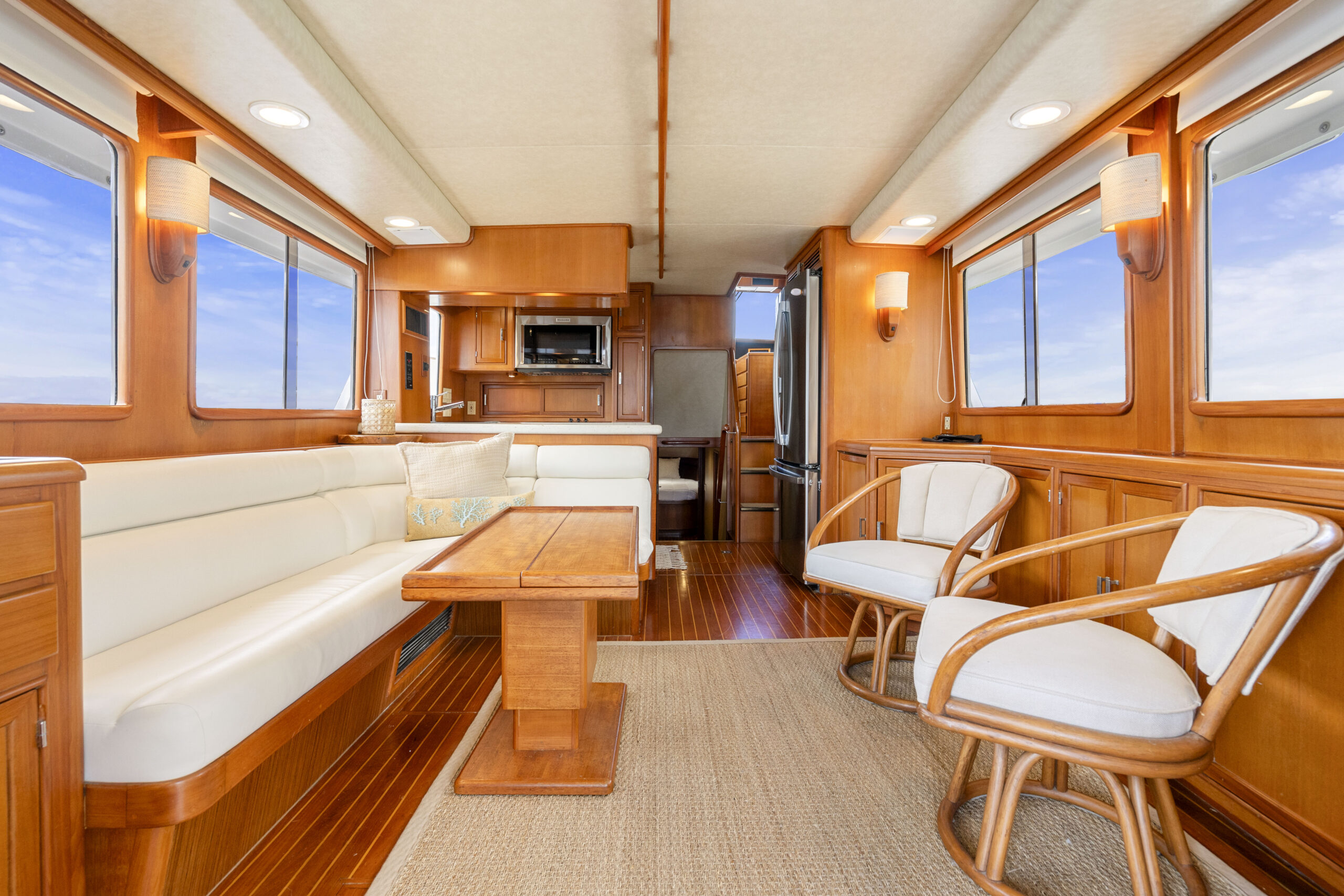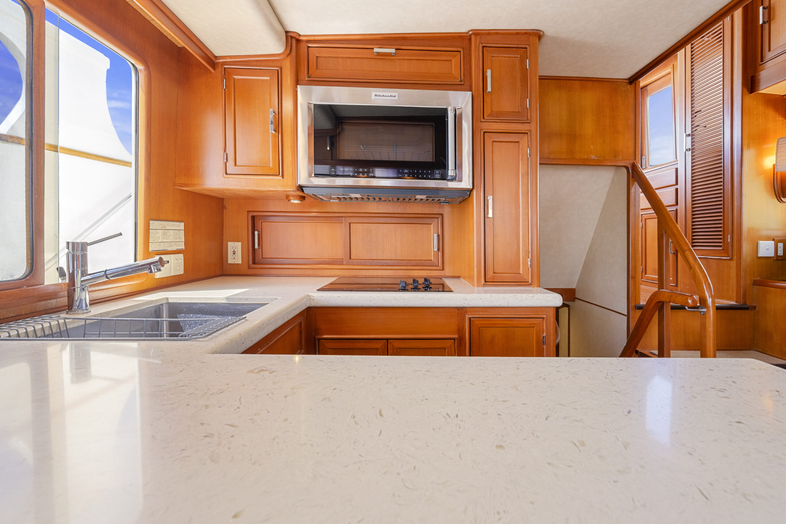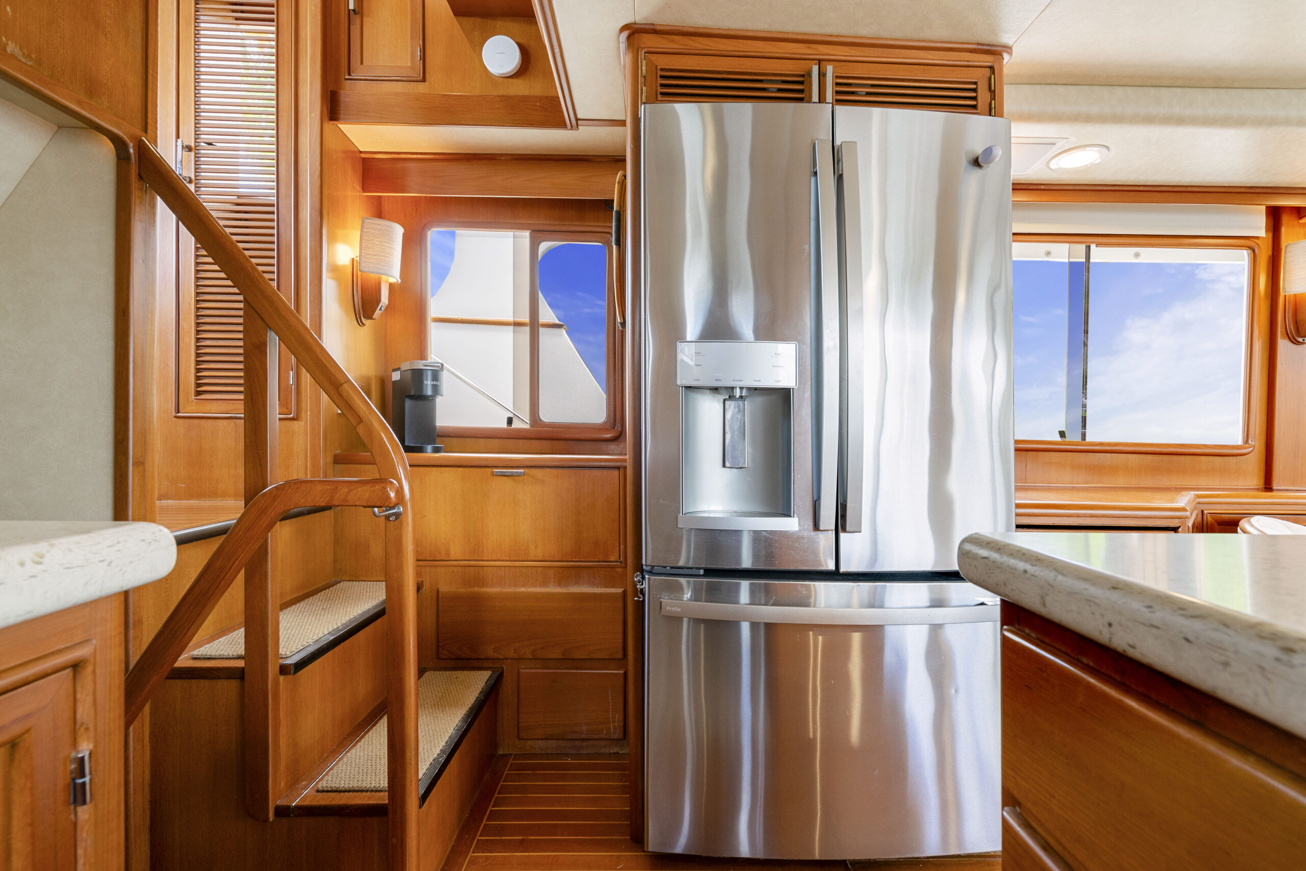 Both the master and guest heads are exceptionally spacious and feature shower stalls with teak flooring, mirrored vanities with sinks, and granite countertops. The ship’s combination washer and dryer unit is located within the guest head’s shower stall behind cabinet doors.