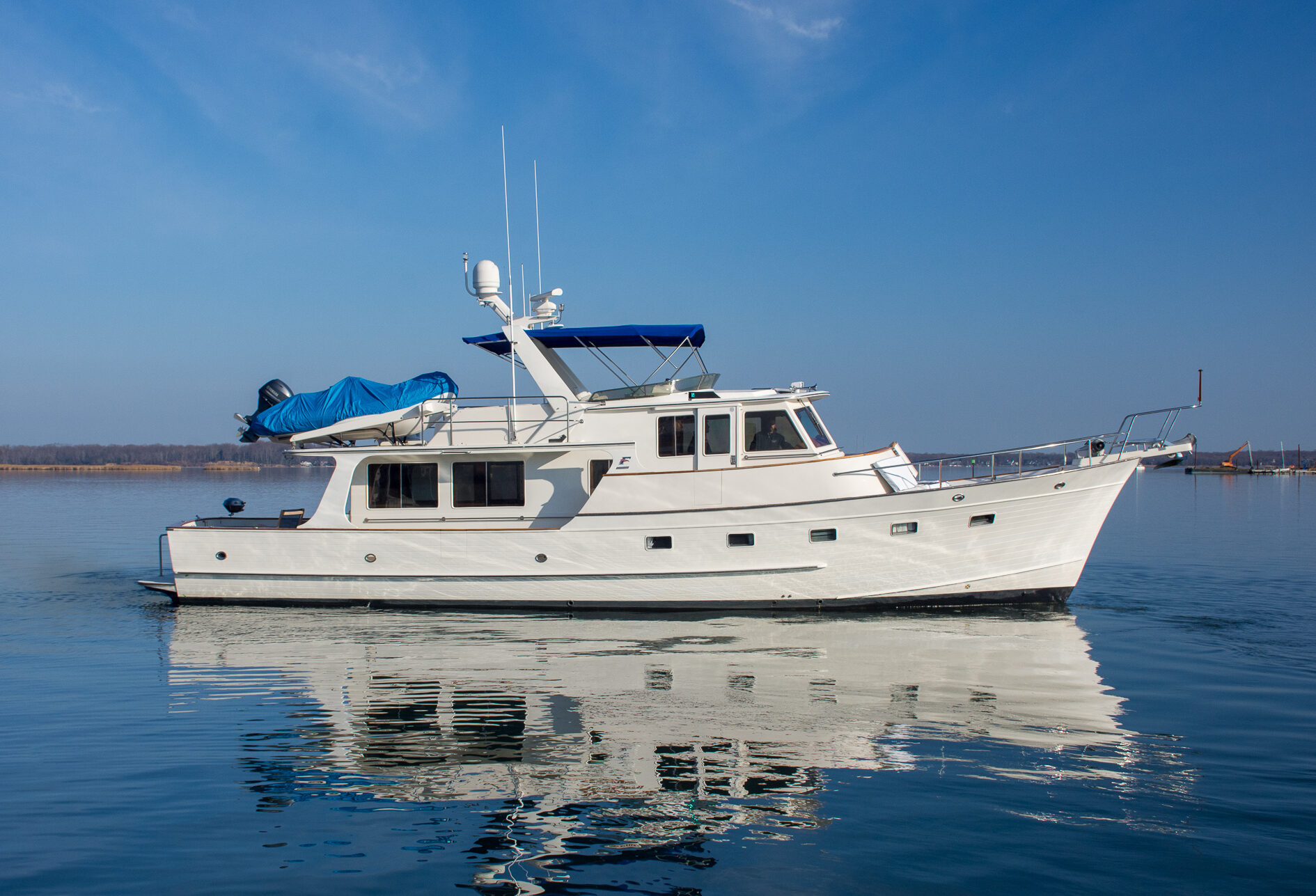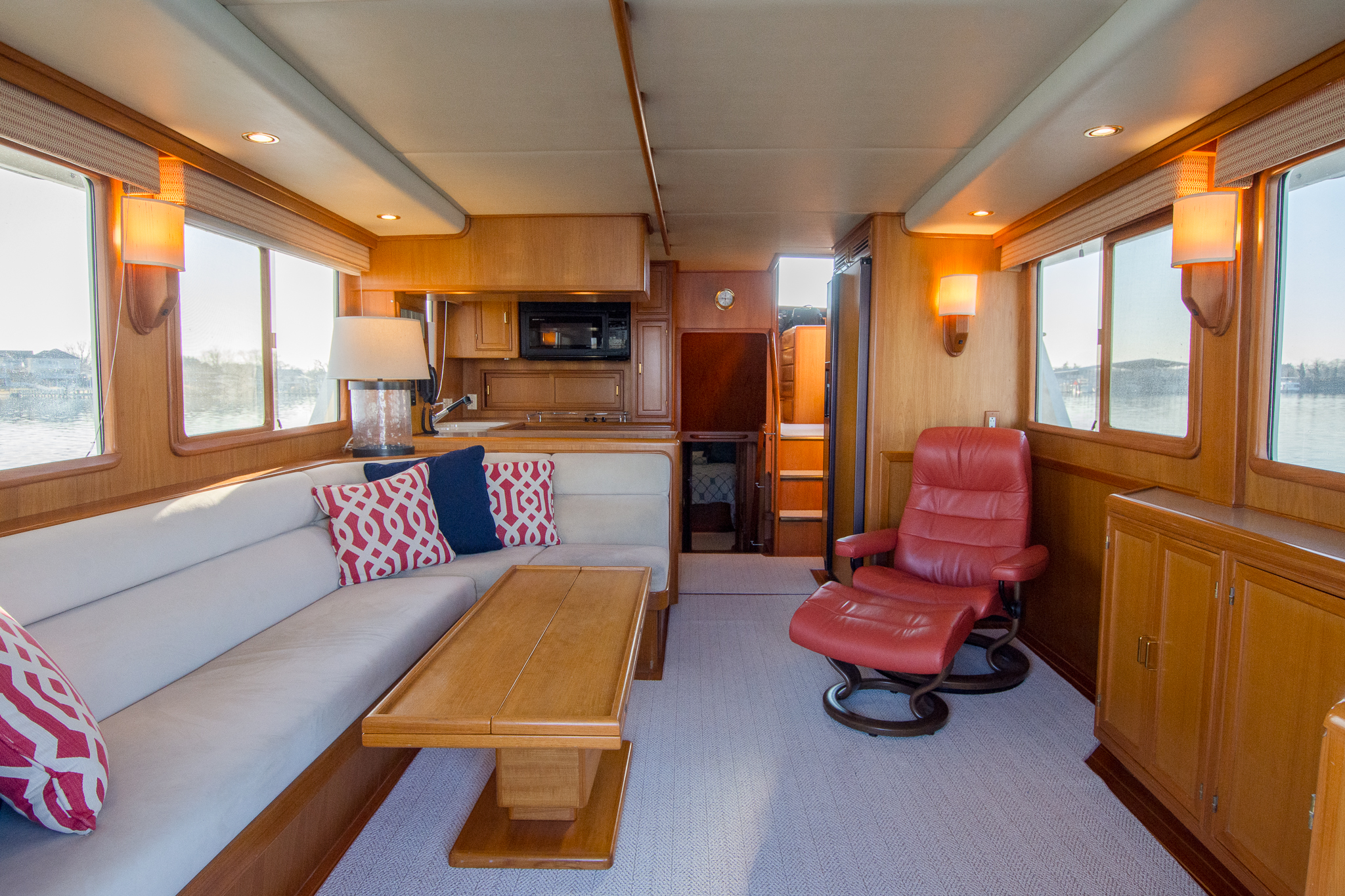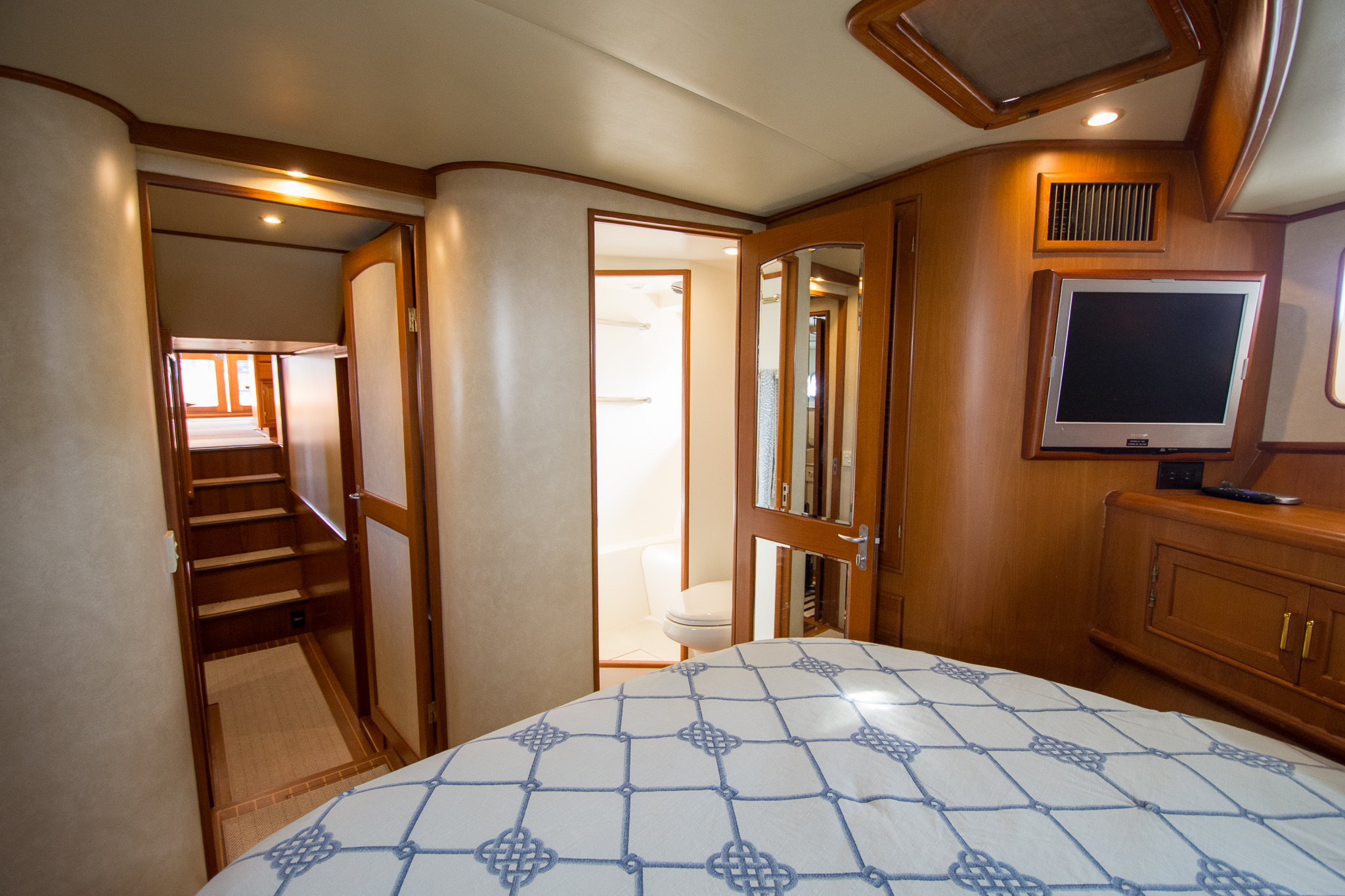 Following the five short steps straight down from the salon will lead you to the central passage of the accommodations. This traditional layout has been a signature mainstay in the Fleming 55 that provides an easy and convenient flow of traffic throughout the boat. This central accommodations passage also makes it possible to appreciate the full length of the vessel from forepeak bulkhead to transom. Once in the passageway you will find a two bunk arrangement at the starboard cabin and a guest stateroom to port featuring a four total berths. Just forward of the starboard side guest stateroom in the passageway is a full-sized 220v washer & separate dryer followed by the guest head. The en-suite master stateroom tops off the accommodations at the forward peak of the vessel.