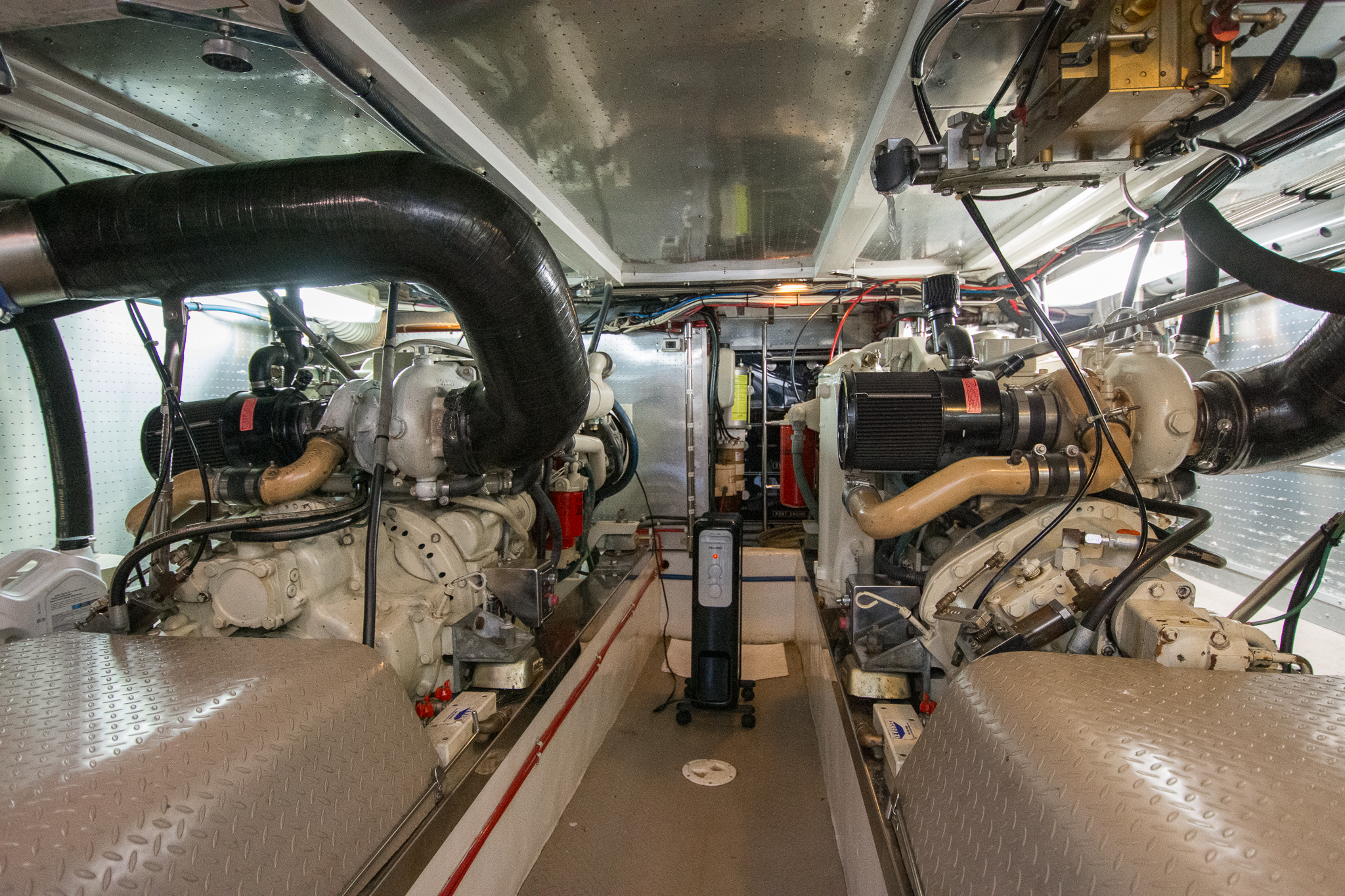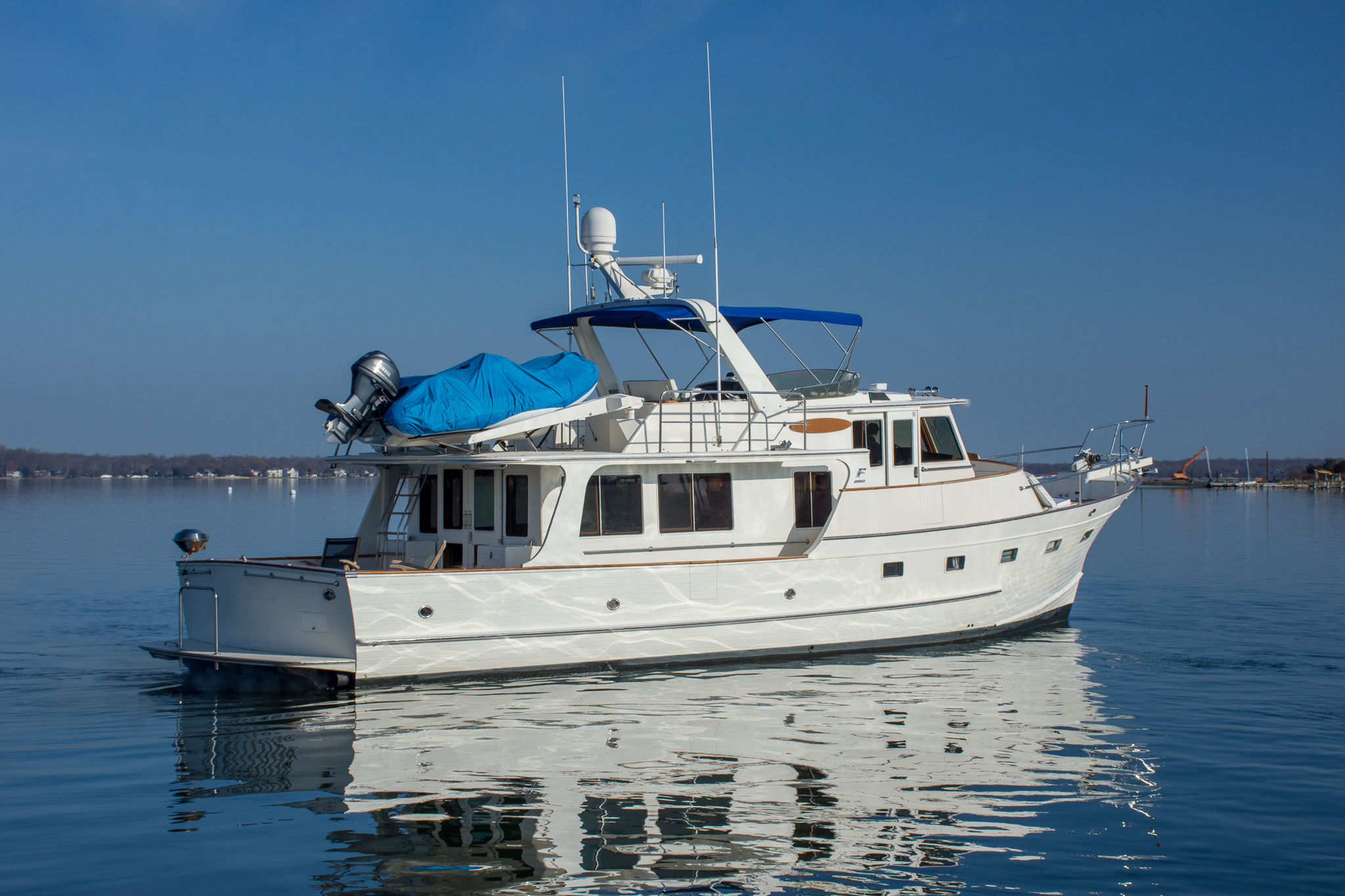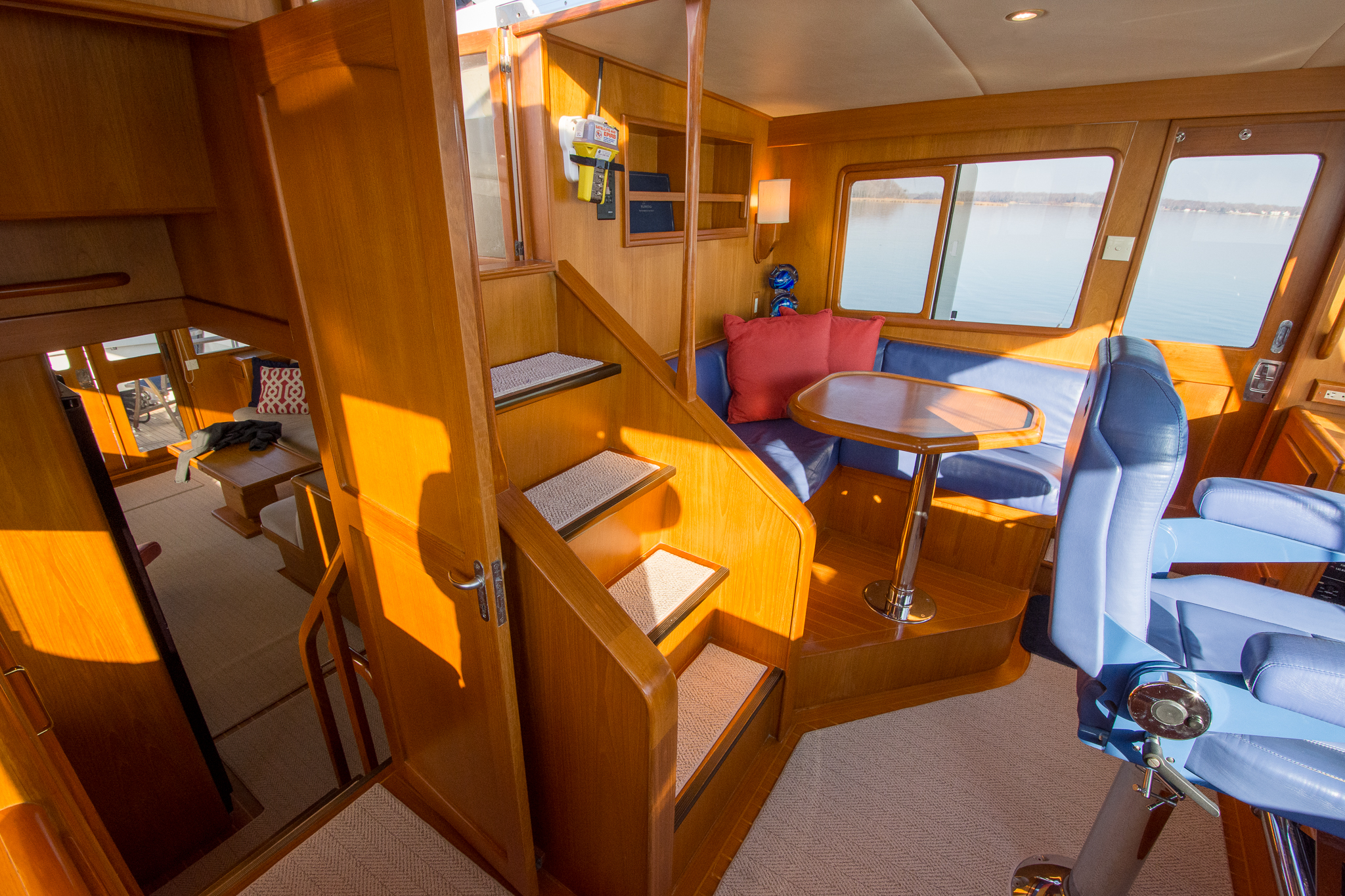 Following the five short steps straight down from the salon will lead you to the central passage of the accommodations. This traditional layout has been a signature mainstay in the Fleming 55 that provides an easy and convenient flow of traffic throughout the boat. This central accommodations passage also makes it possible to appreciate the full length of the vessel from forepeak bulkhead to transom. Once in the passageway you will find a two bunk arrangement at the starboard cabin and a guest stateroom to port featuring a four total berths. Just forward of the starboard side guest stateroom in the passageway is a full-sized 220v washer & separate dryer followed by the guest head. The en-suite master stateroom tops off the accommodations at the forward peak of the vessel.