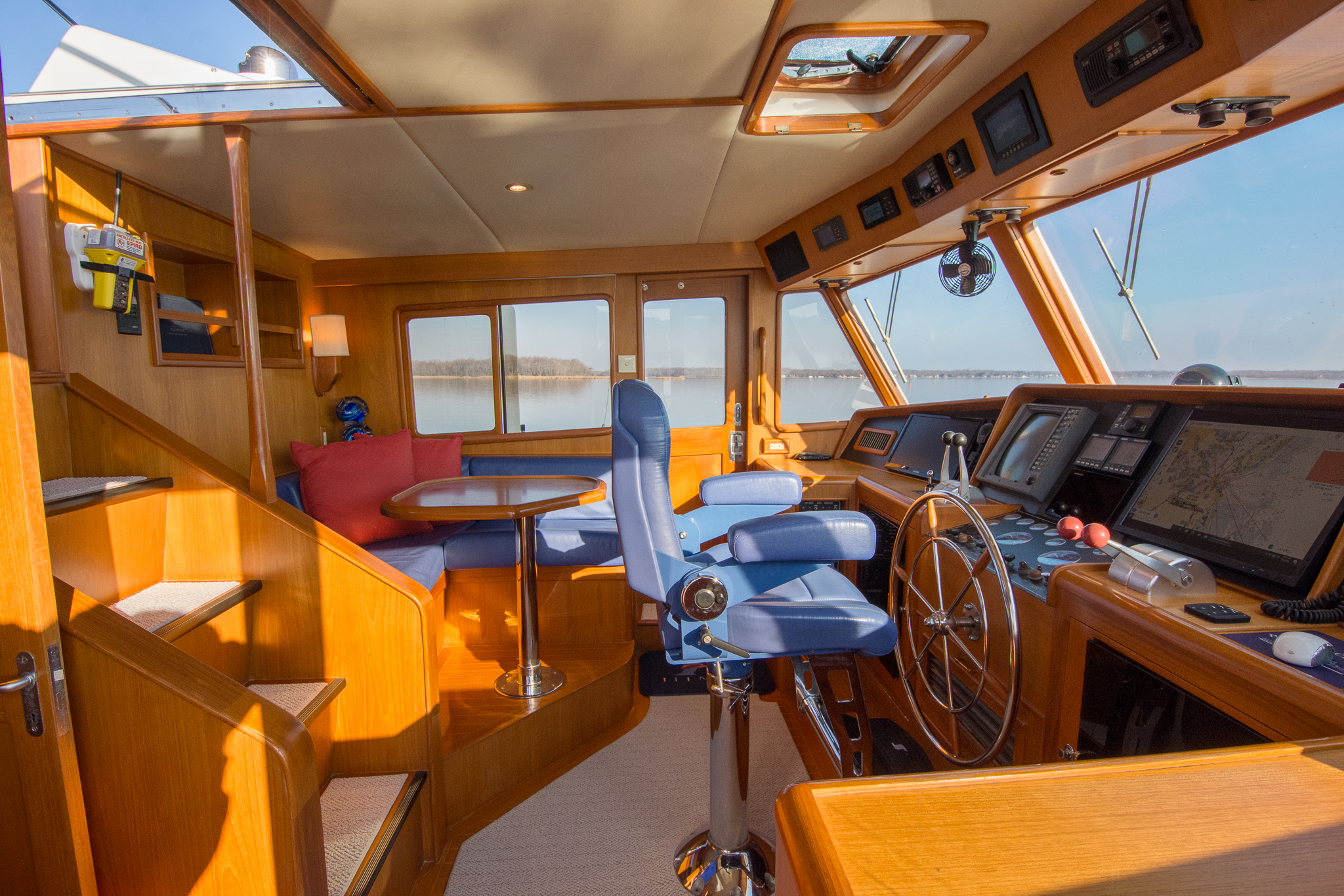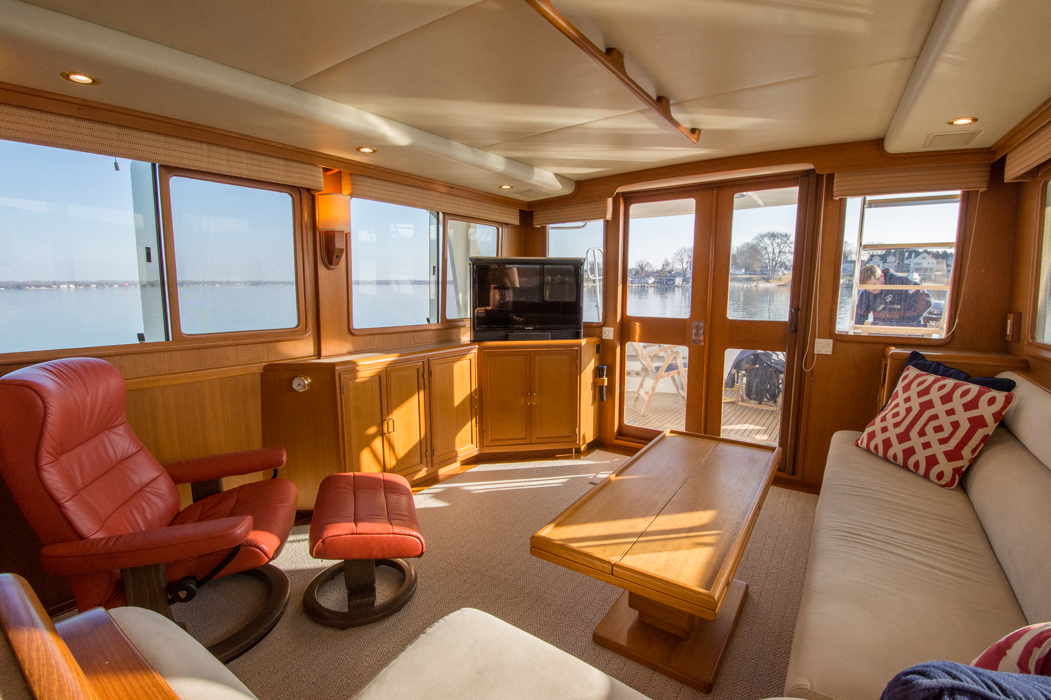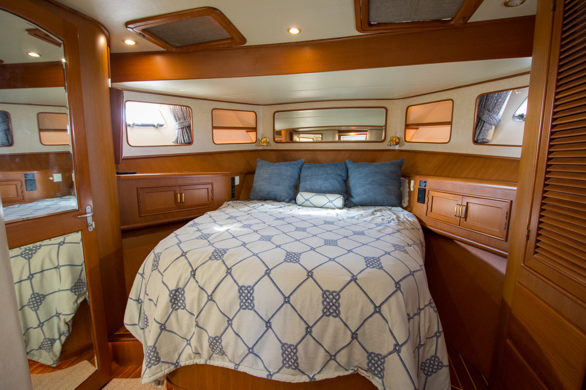 The master stateroom is composed of a queen sized island berth surrounded by shelves, cabinets, drawers, and his & hers hanging lockers to either side. This island berth arrangement allows for access from either side and the berth can be raised via gas-assisted struts to access a large storage cavity underneath. Overhead are two skylights which, along with port holes to each side, provide natural light to the cabin. A Sharp flat-screen TV is wall-mounted to the side of the starboard hanging locker and the en-suite master head resides to port.