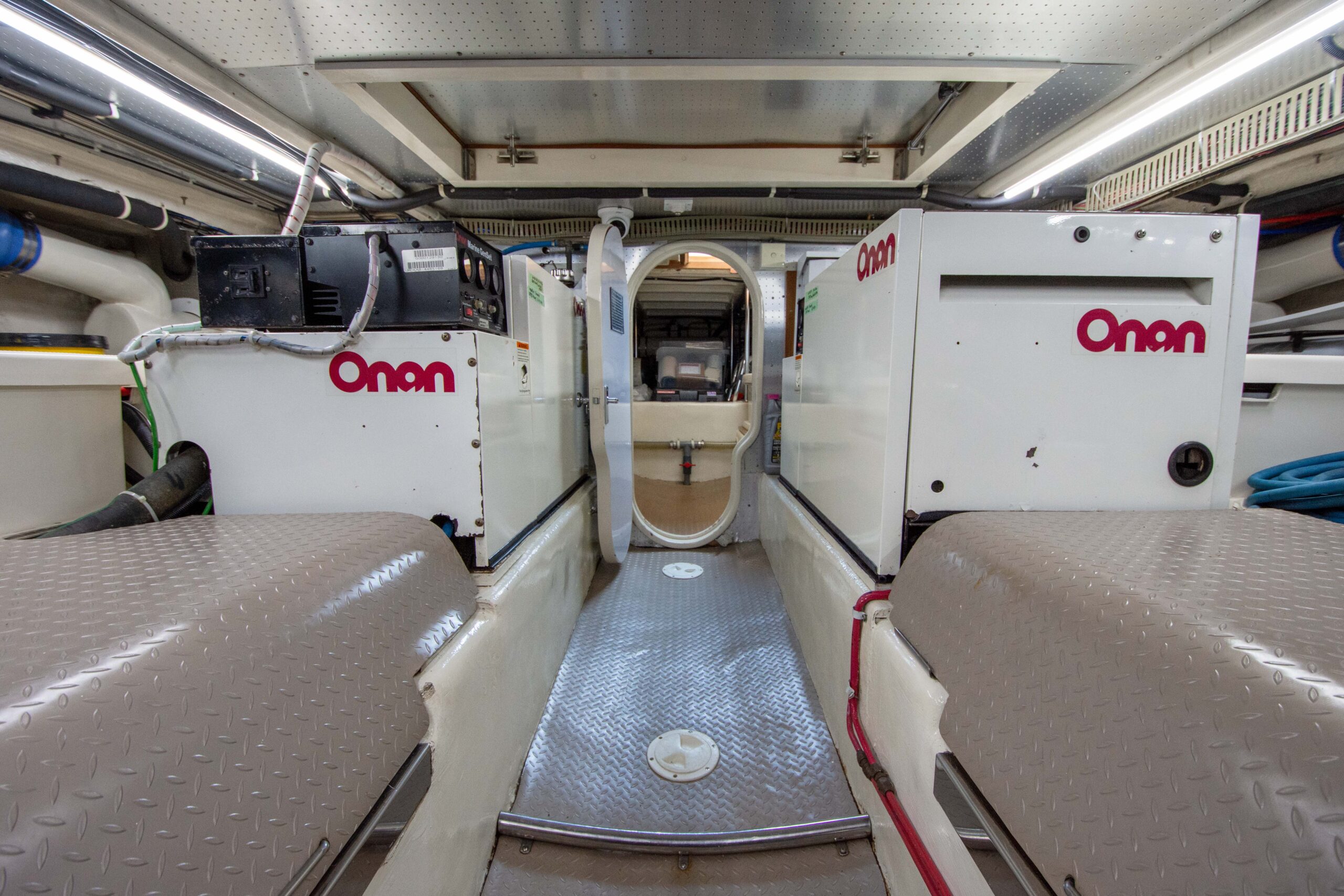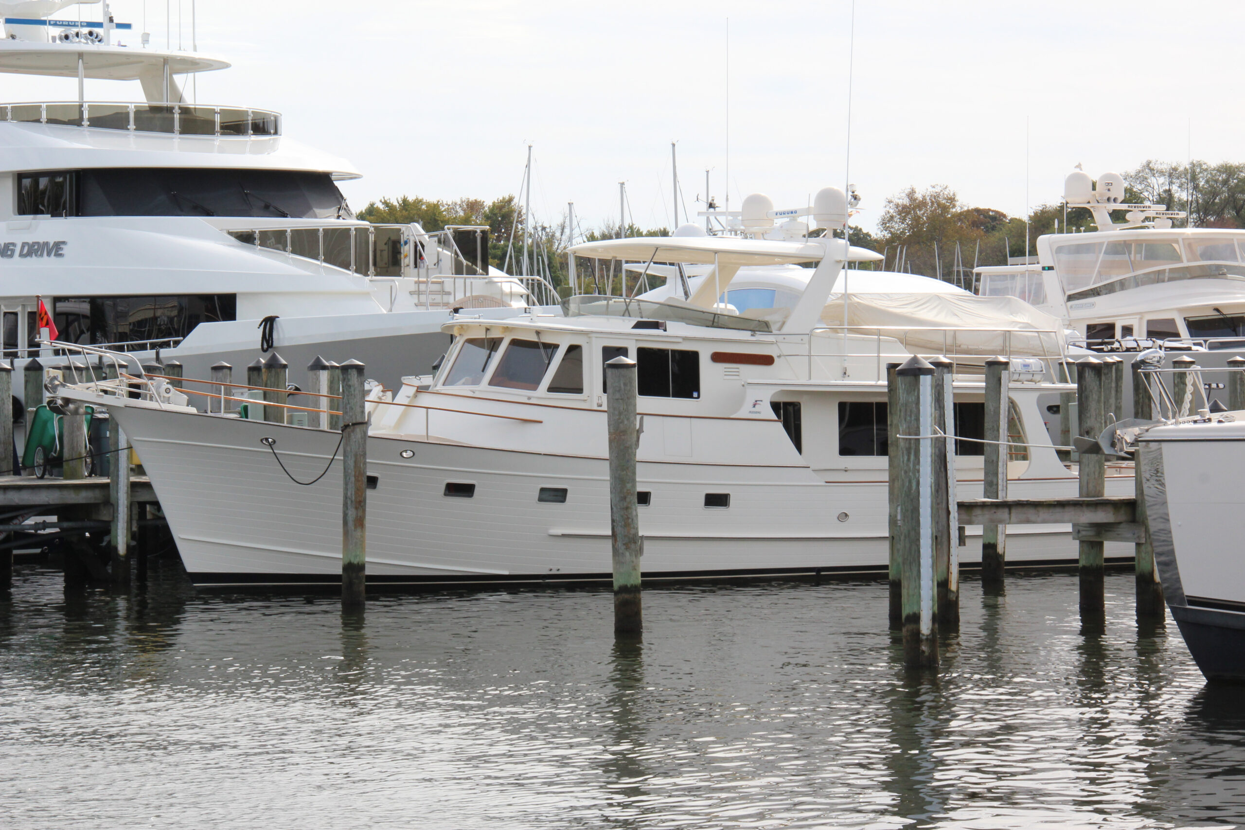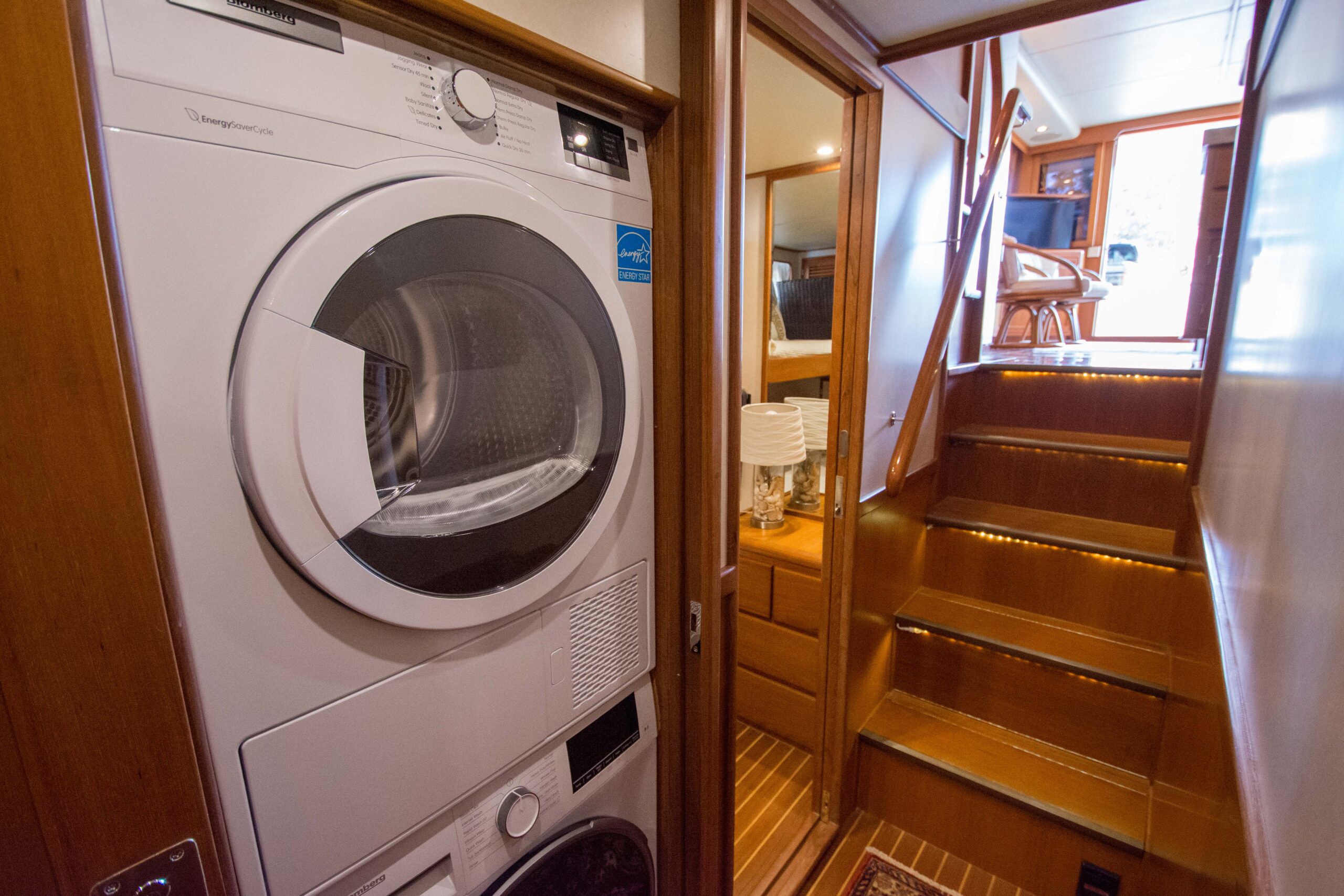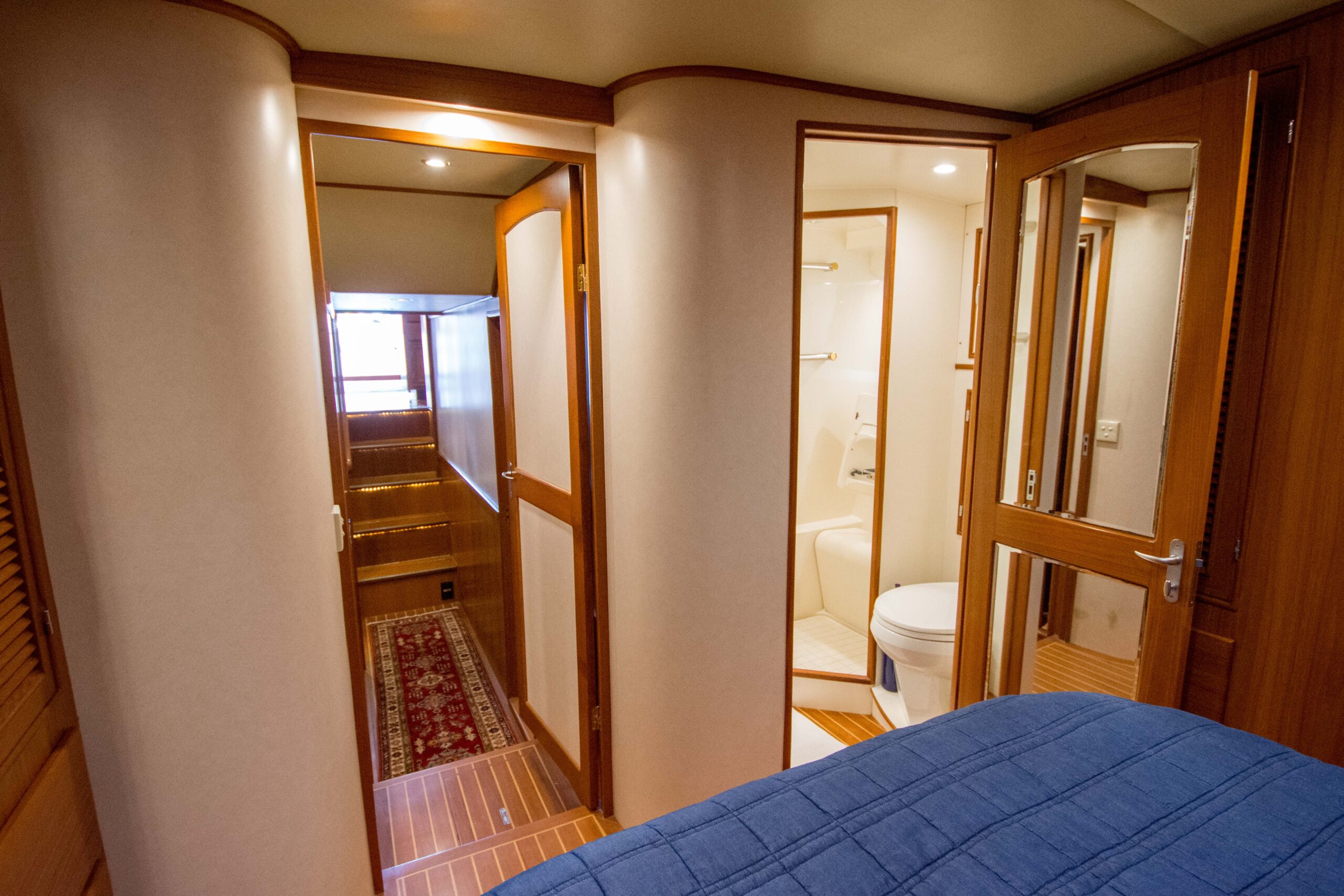 Following the five short steps straight down from the salon and through the companionway door will lead you to the central passage of the accommodations. This traditional layout has been a signature mainstay in the Fleming 55 that provides an easy and convenient flow of traffic throughout the boat. This central accommodations passage also makes it possible to appreciate the full length of the vessel from forepeak bulkhead to transom. Once in the passageway you will find a two bunk arrangement at the starboard cabin and a VIP guest stateroom to port featuring a queen berth. Just forward of the starboard side guest stateroom in the passageway is a full-sized 220v washer & separate dryer (new units installed in 2025) followed by the guest head. The en-suite master stateroom tops off the accommodations at the forward peak of the vessel.