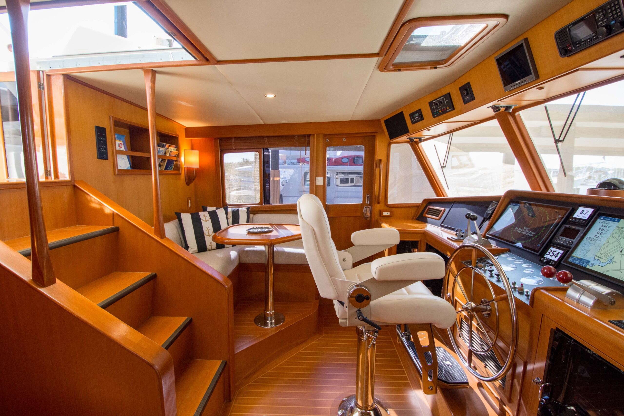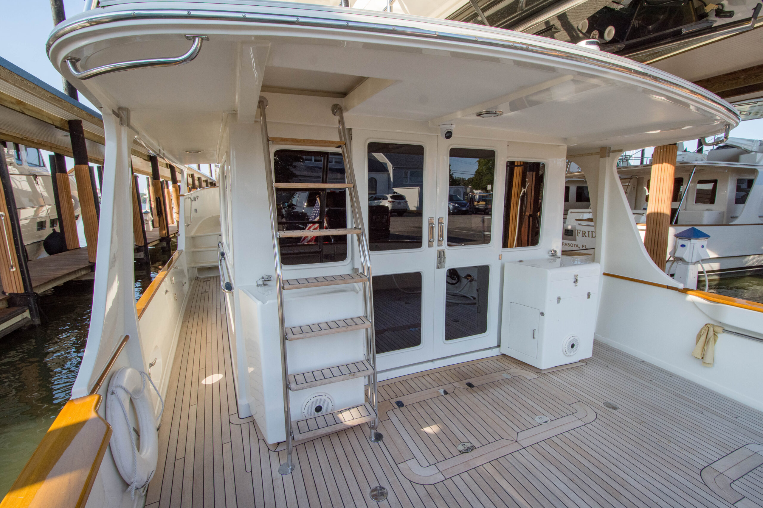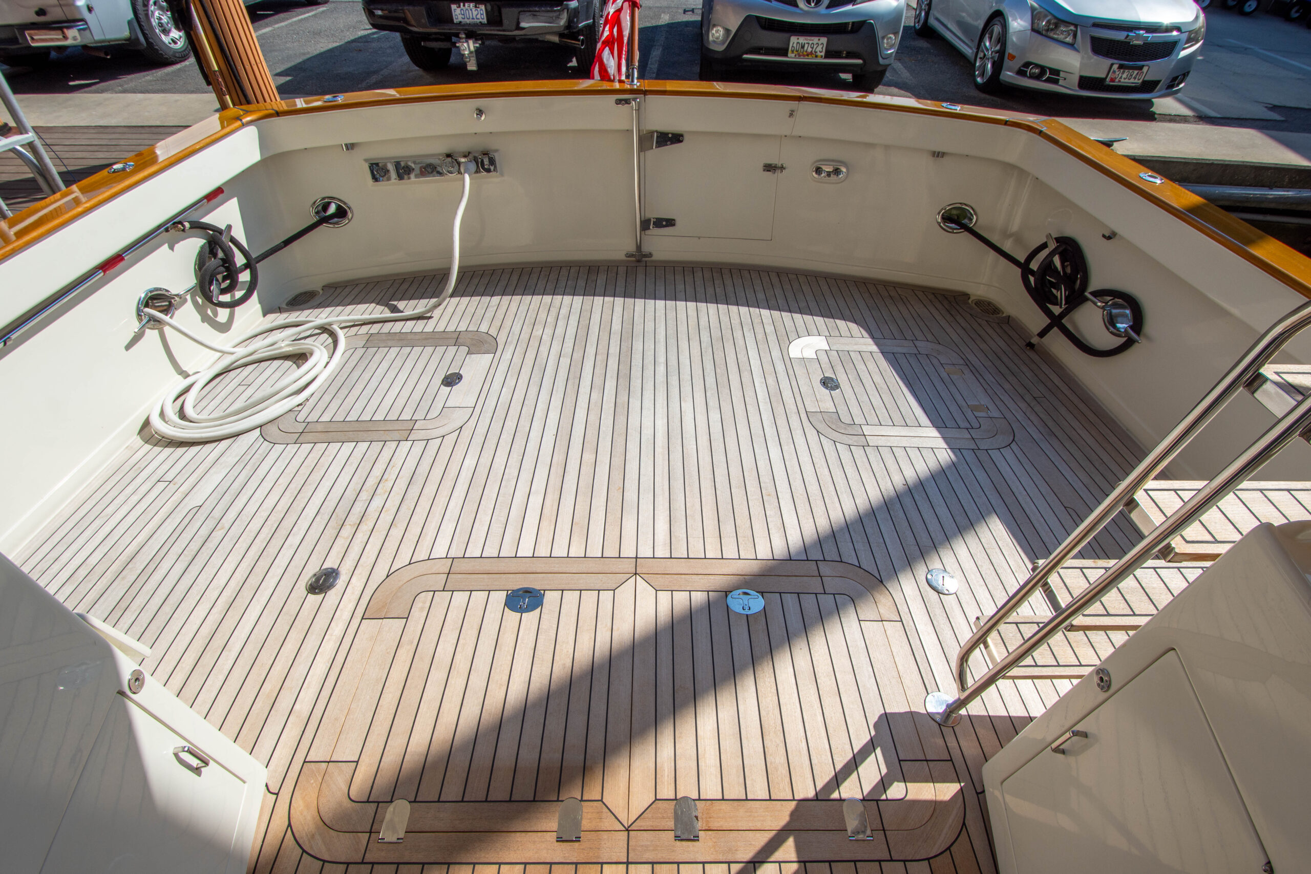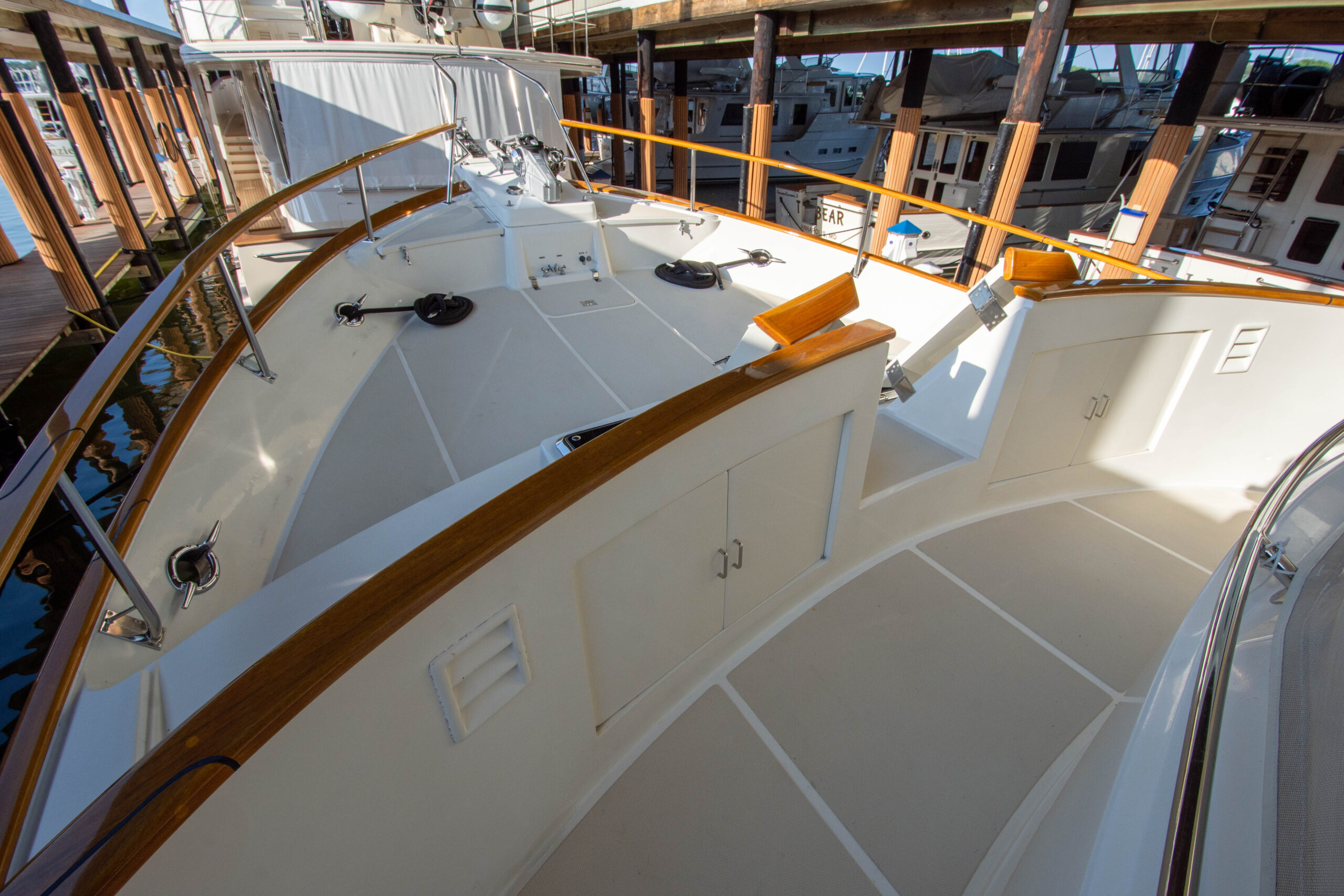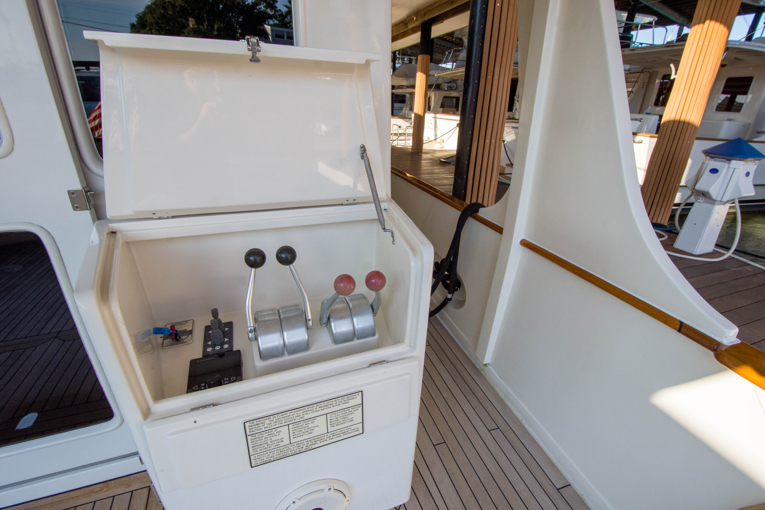 Following the five short steps straight down from the salon and through the companionway door will lead you to the central passage of the accommodations. This traditional layout has been a signature mainstay in the Fleming 55 that provides an easy and convenient flow of traffic throughout the boat. This central accommodations passage also makes it possible to appreciate the full length of the vessel from forepeak bulkhead to transom. Once in the passageway you will find a two bunk arrangement at the starboard cabin and a VIP guest stateroom to port featuring a queen berth. Just forward of the starboard side guest stateroom in the passageway is a full-sized 220v washer & separate dryer (new units installed in 2025) followed by the guest head. The en-suite master stateroom tops off the accommodations at the forward peak of the vessel.