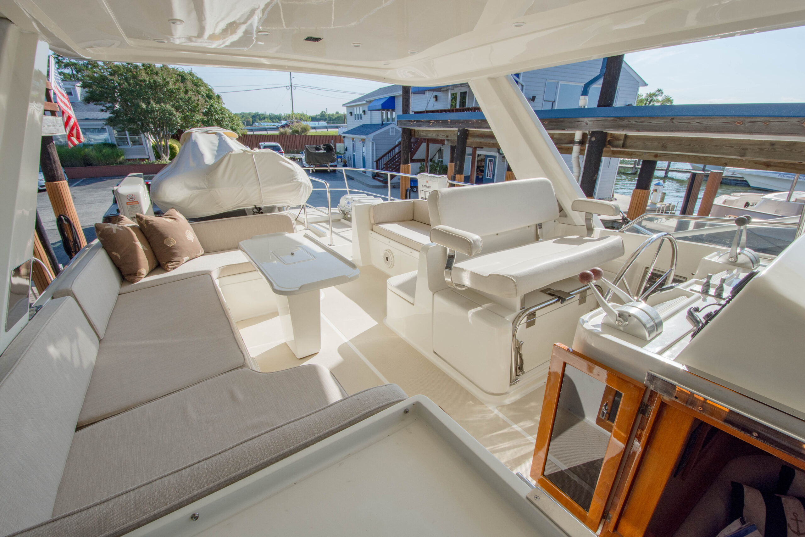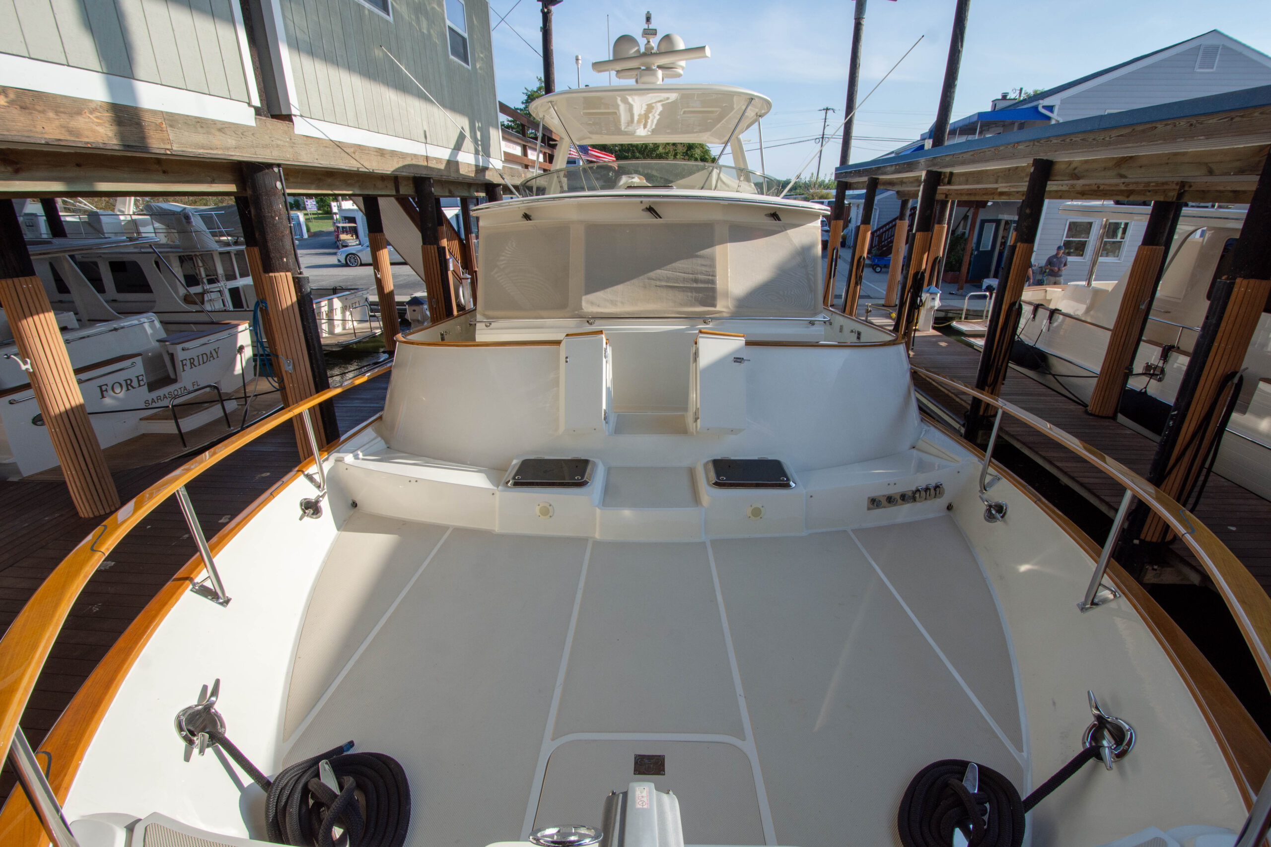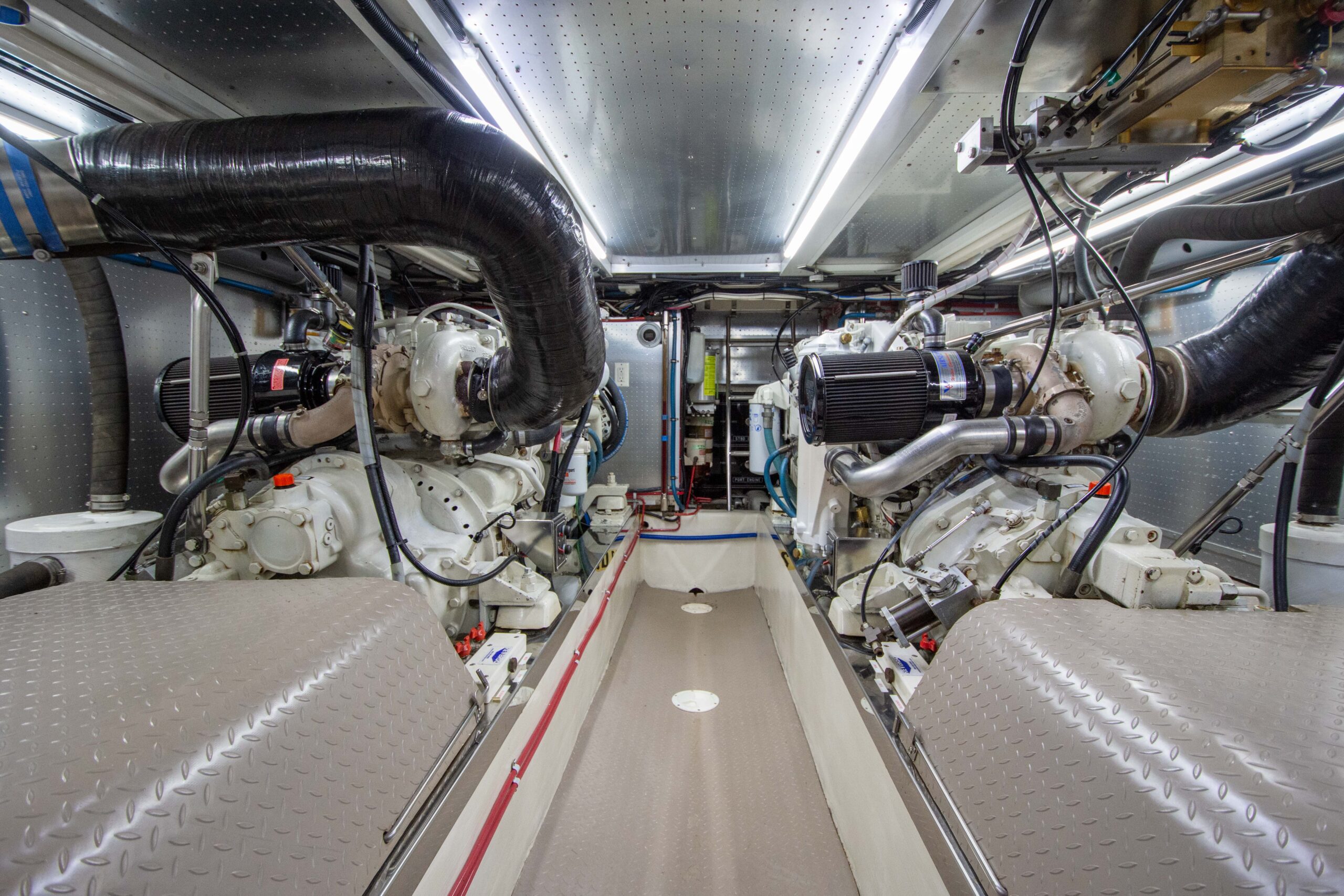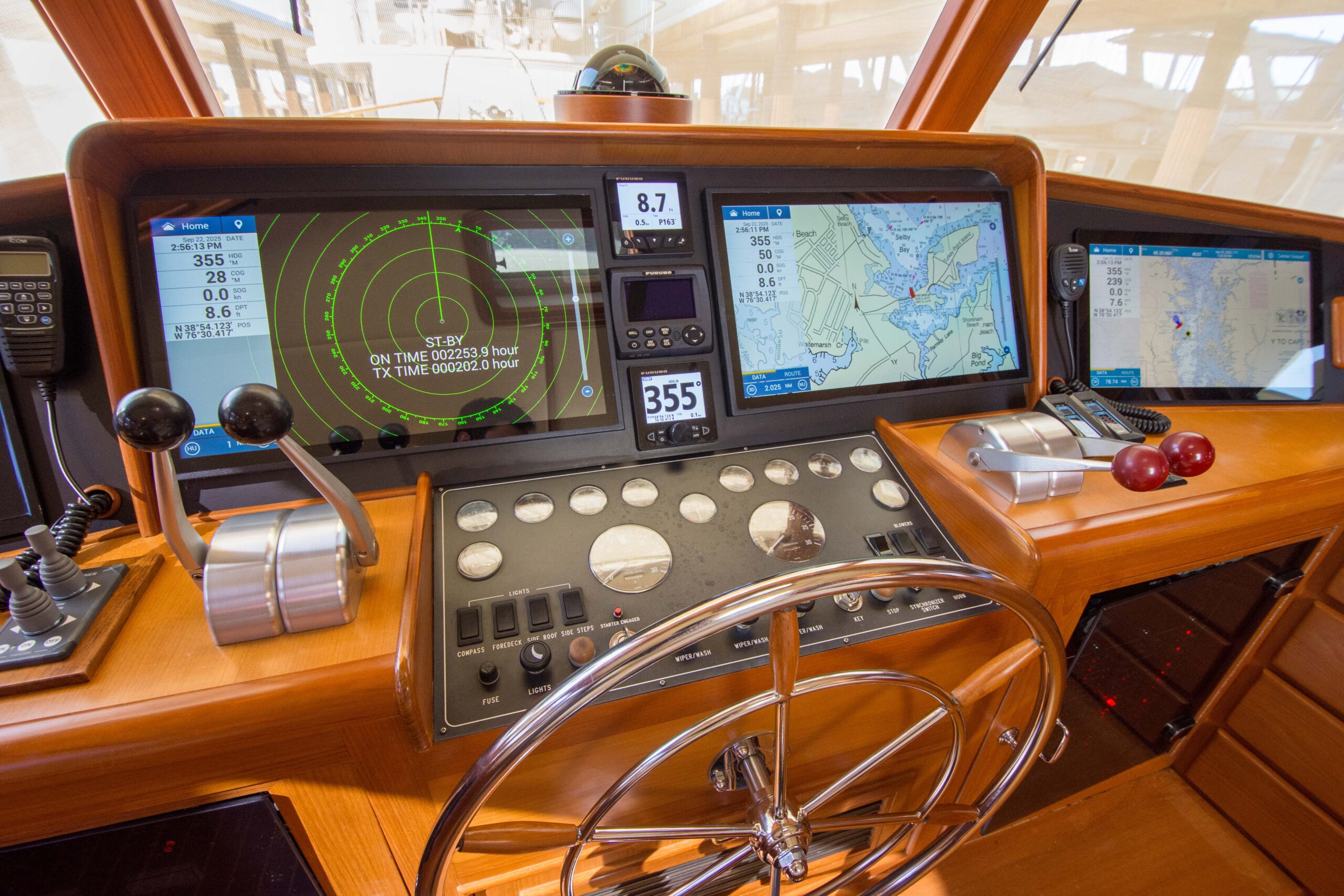 Following the five short steps straight down from the salon and through the companionway door will lead you to the central passage of the accommodations. This traditional layout has been a signature mainstay in the Fleming 55 that provides an easy and convenient flow of traffic throughout the boat. This central accommodations passage also makes it possible to appreciate the full length of the vessel from forepeak bulkhead to transom. Once in the passageway you will find a two bunk arrangement at the starboard cabin and a VIP guest stateroom to port featuring a queen berth. Just forward of the starboard side guest stateroom in the passageway is a full-sized 220v washer & separate dryer (new units installed in 2025) followed by the guest head. The en-suite master stateroom tops off the accommodations at the forward peak of the vessel.
