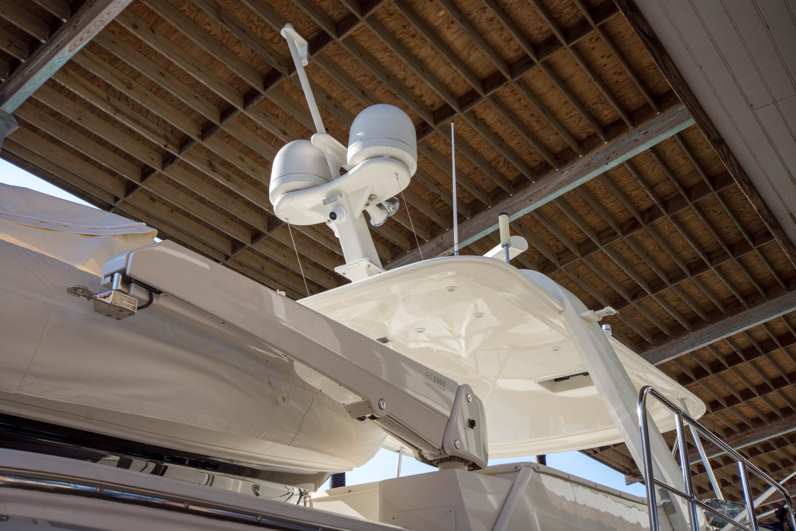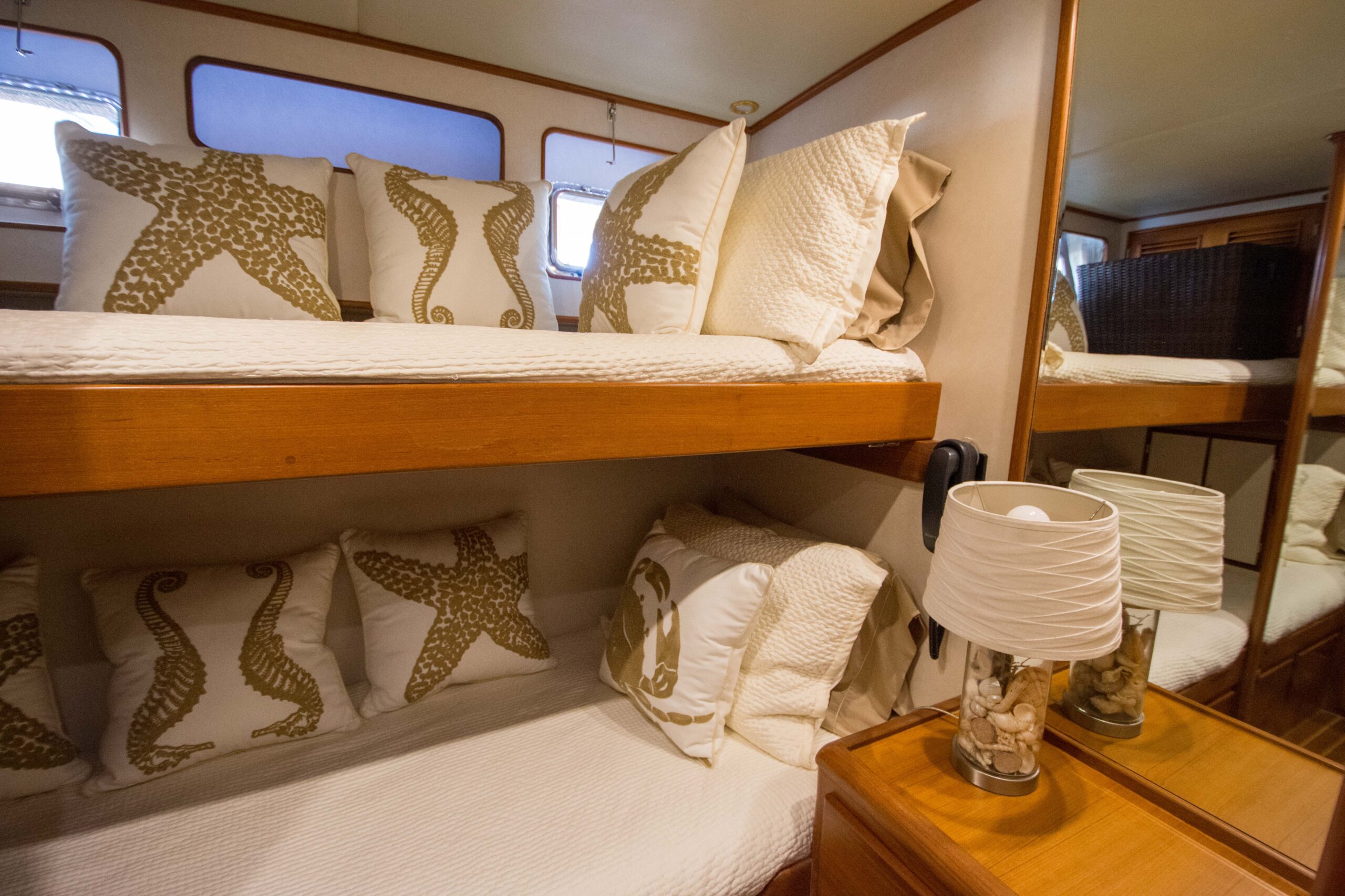 The VIP port stateroom features a queen-sized berth with storage provided by two hanging lockers located inboard and at the foot of the berth. The hanging lockers feature dresser drawers beneath, and drawers can also be found beneath the queen berth. The starboard cabin features a two berth bunk arrangement with the top bunk capable of sliding away to outboard to provide more space in the cabin when not in use. Storage is found via cabinets, a night stand, and shelving, while a full-length mirror is found at the forward wall. A wall-vac system is found at the base of the steps from the salon and can easily reach each of the staterooms.