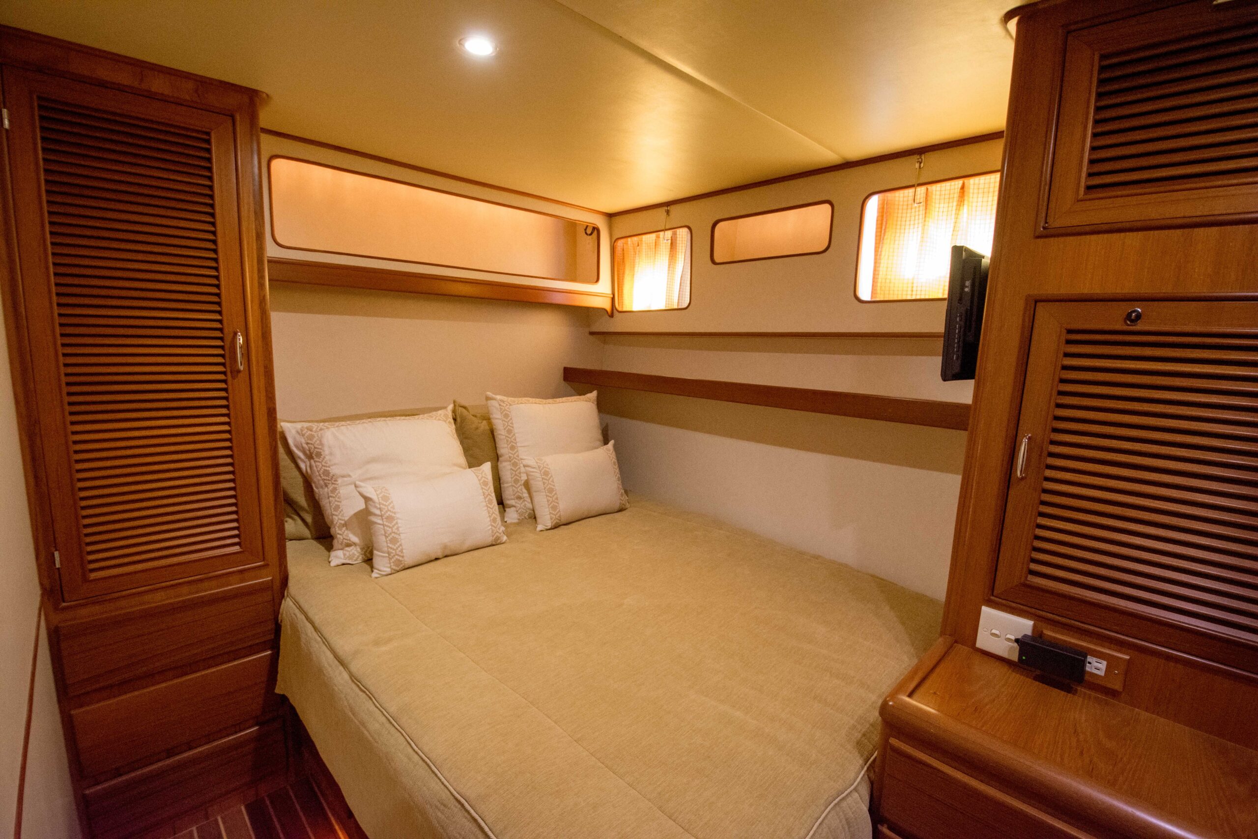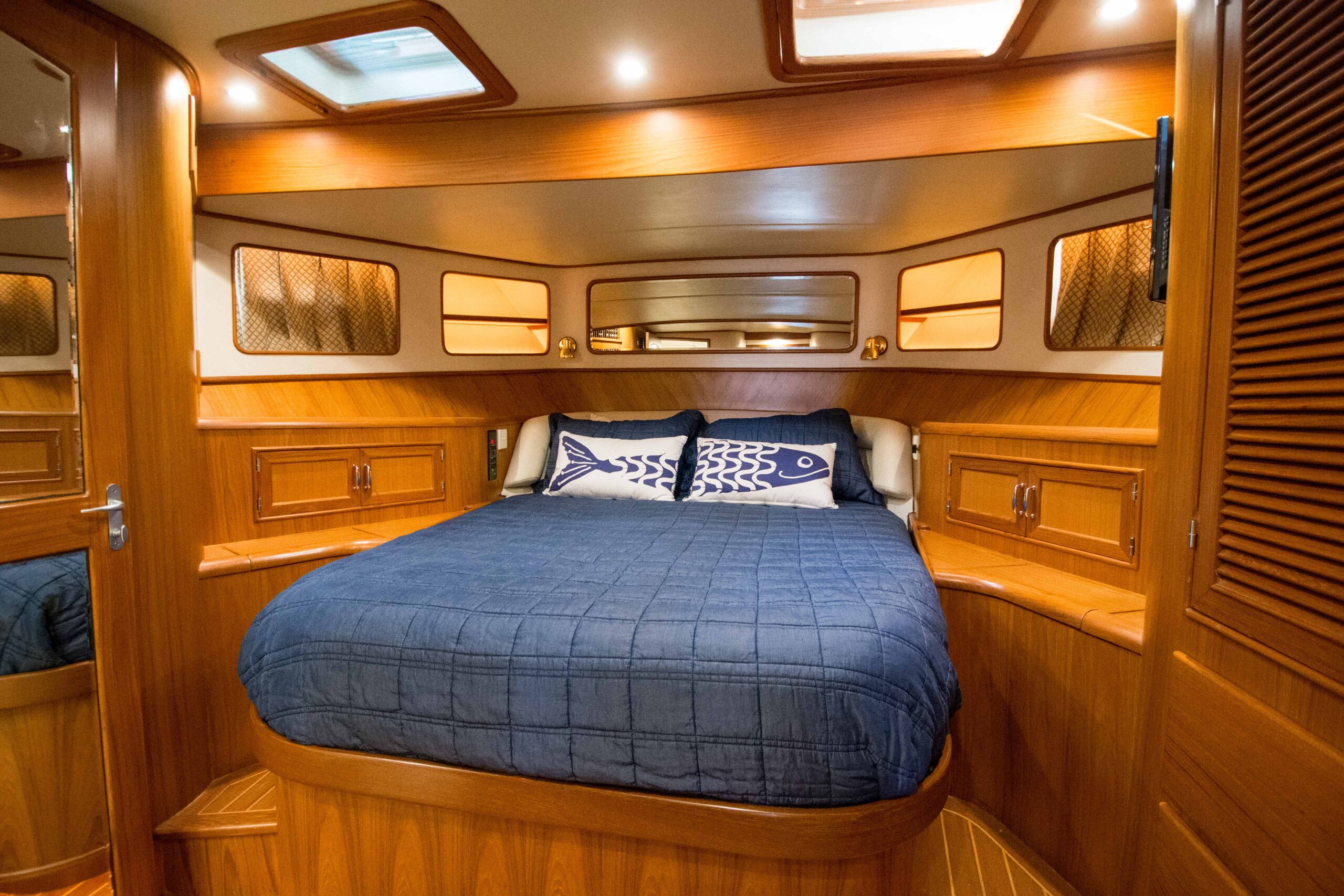 The master stateroom is composed of a queen sized island berth surrounded by shelves, cabinets, drawers, and his & hers hanging lockers to either side. This island berth arrangement allows for access from either side and the berth can be raised via gas-assisted struts to access a large storage cavity underneath. Overhead are two skylights which, along with port holes to each side, provide natural light to the cabin. A Samsung 22” flat-screen TV is wall-mounted to the side of the starboard hanging locker and the en-suite master head resides athwartship to port.