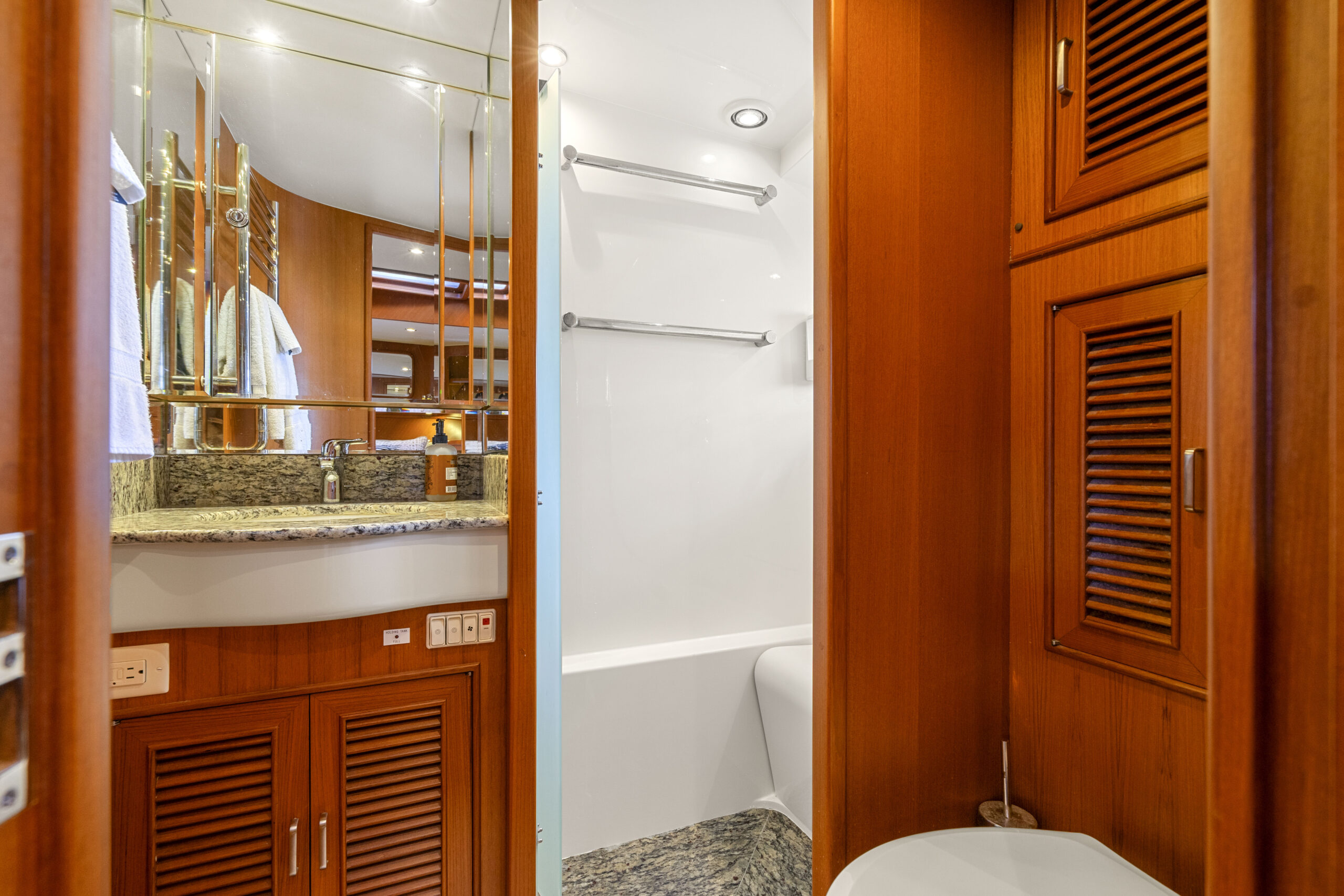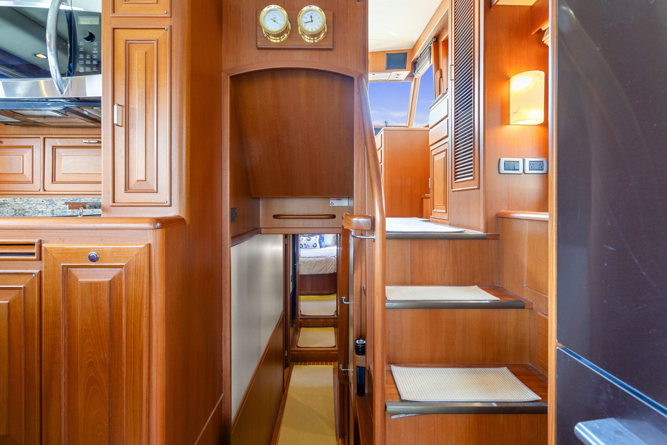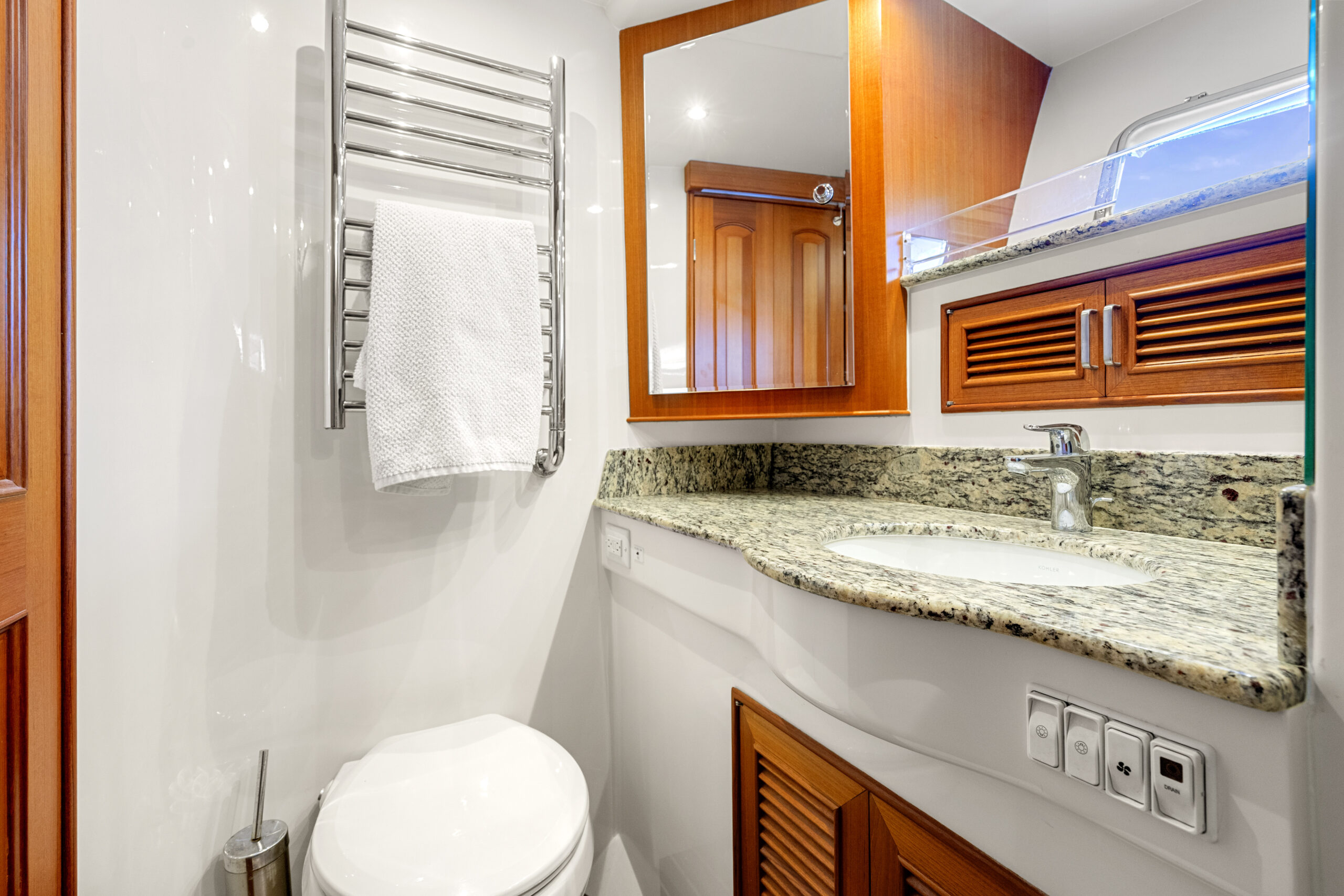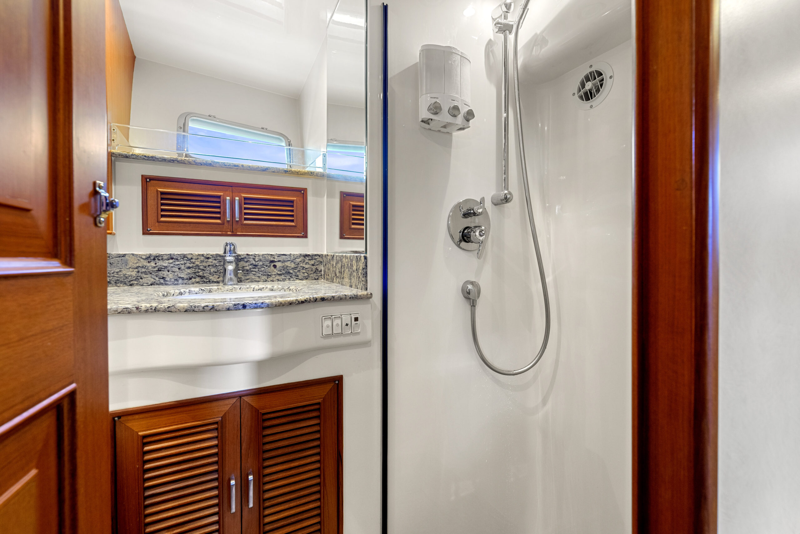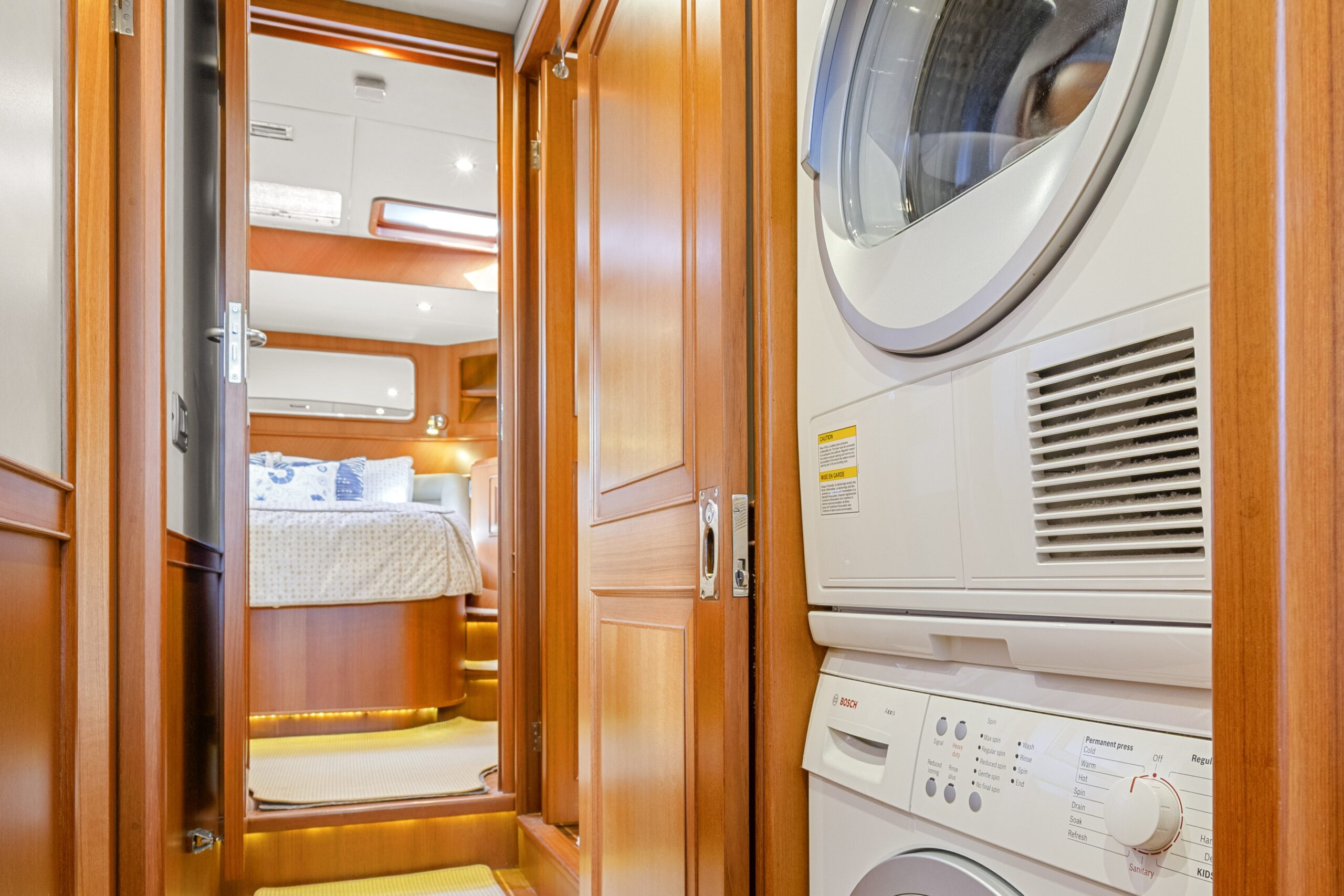 Following the five short steps straight down from the salon will lead you to the central passage of the accommodations. This traditional layout has been a signature mainstay in the Fleming 55 and provides an easy and convenient flow of traffic throughout the boat. The central accommodations passage also makes it possible to appreciate the full length of the vessel from forepeak bulkhead to transom. Once in the passageway you will find a two-berth bunk arrangement in the guest cabin to starboard and a VIP guest stateroom to port with a two-berth convertible queen arrangement. Just forward of the starboard side guest stateroom in the passageway is a full-sized Bosch Axxis 220v washer & separate dryer followed by the guest head. The en-suite master stateroom tops off the accommodations at the forward peak.