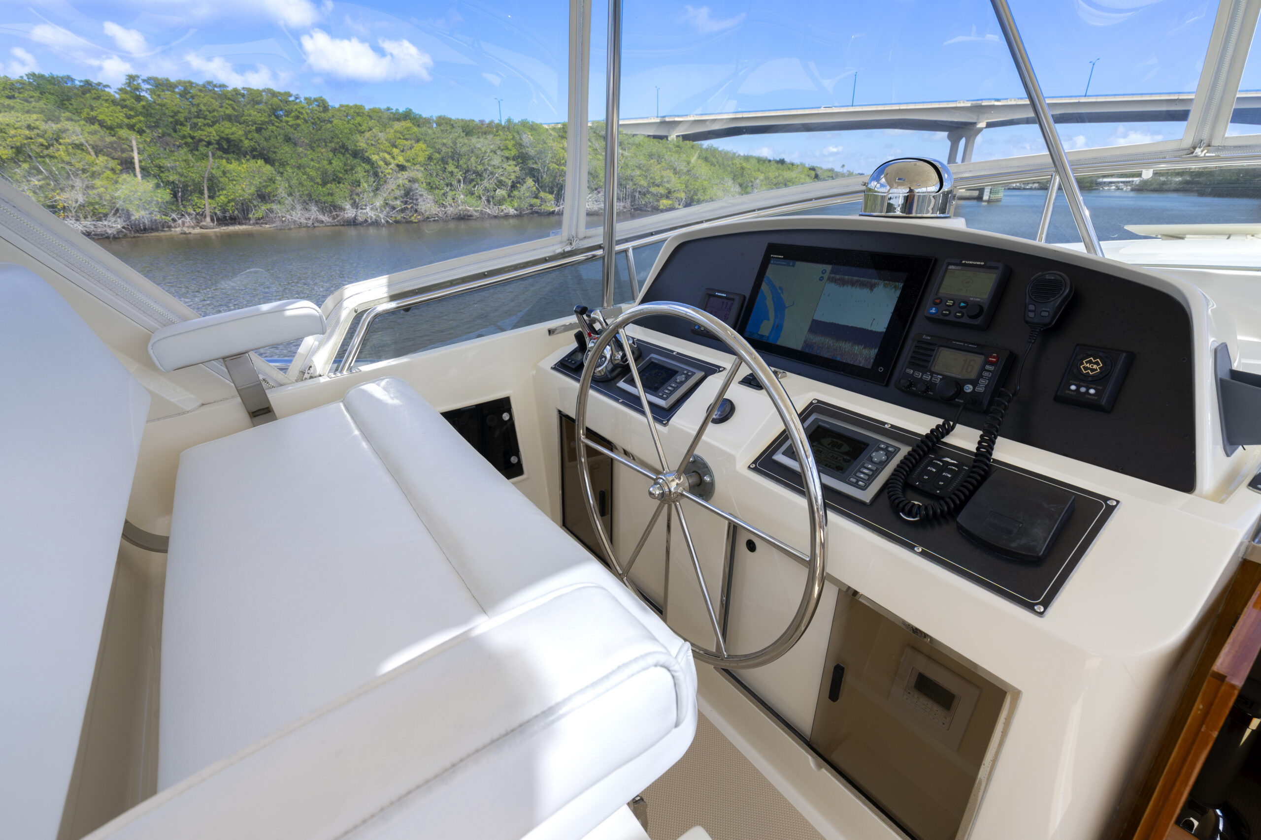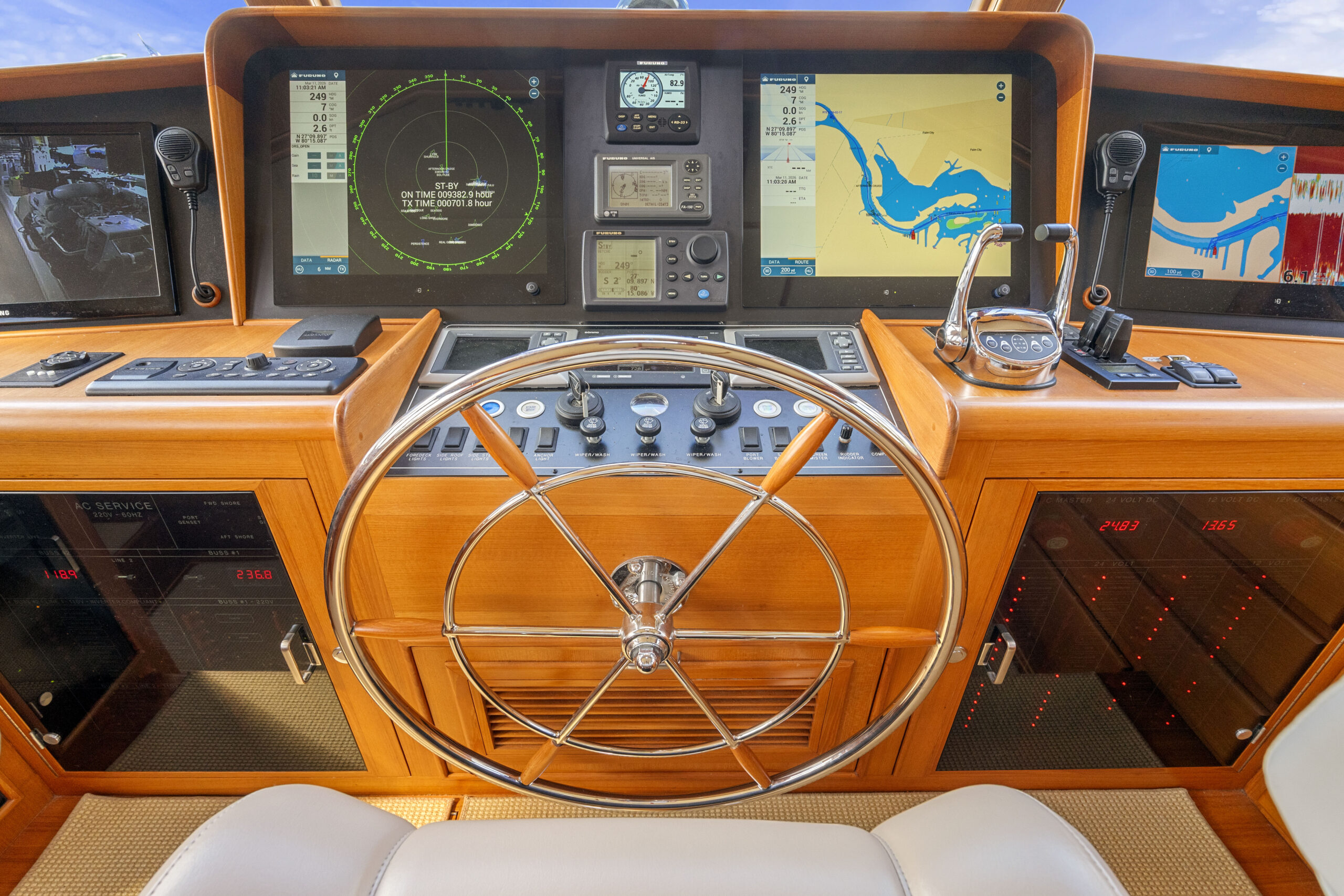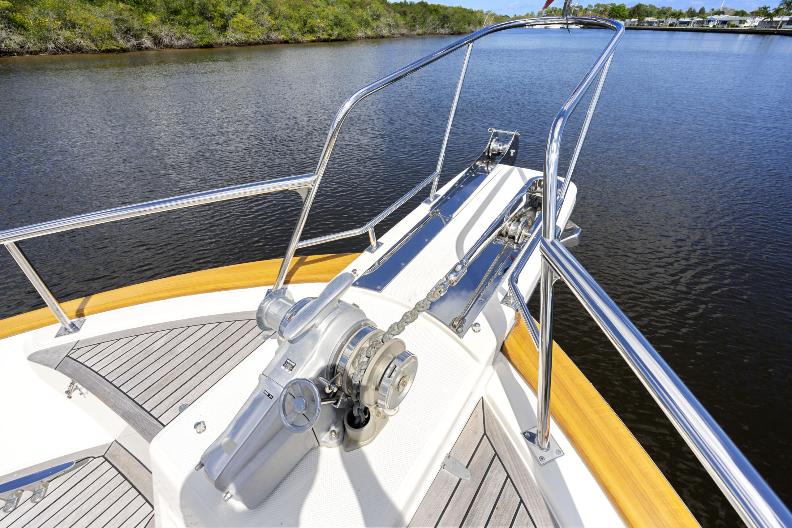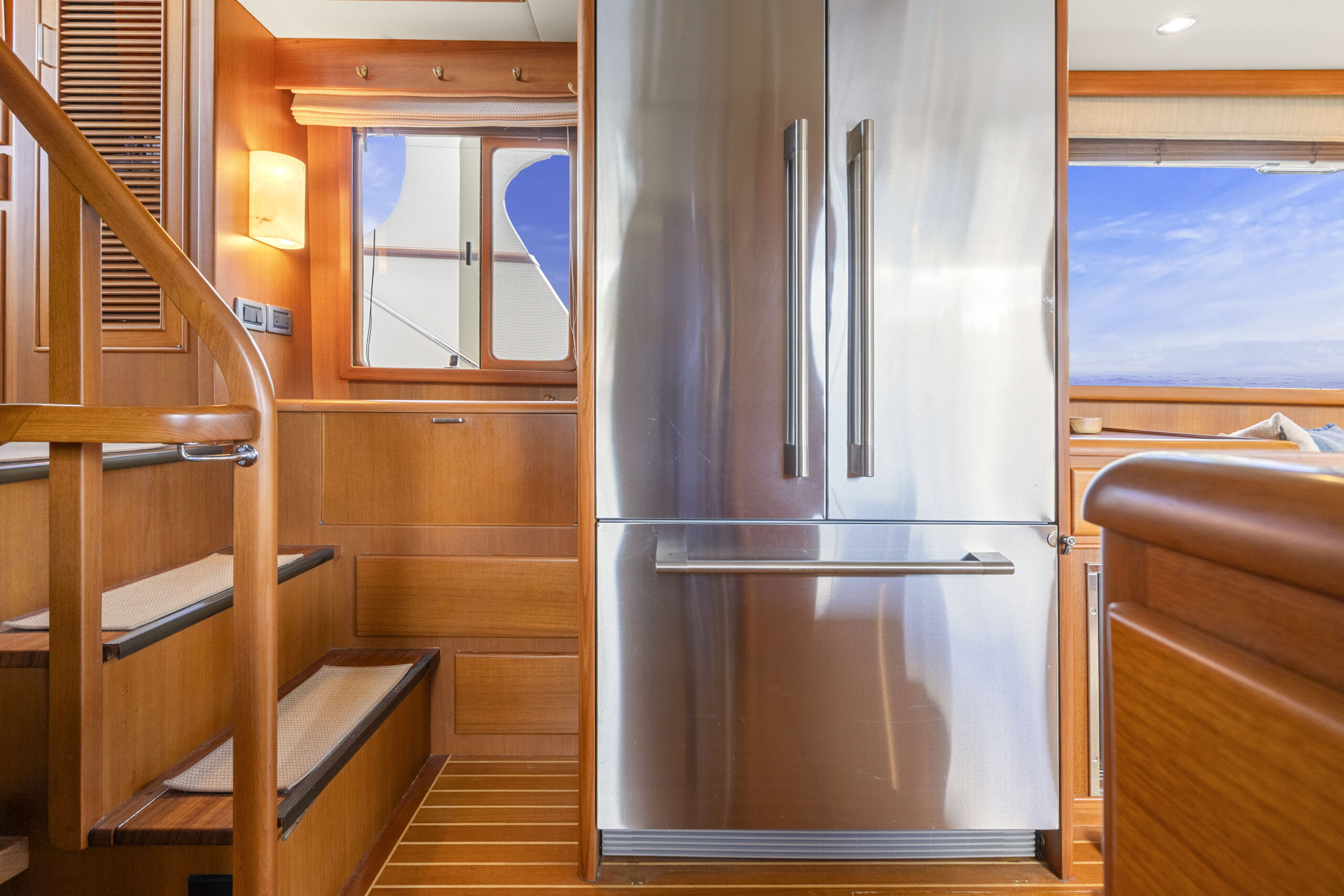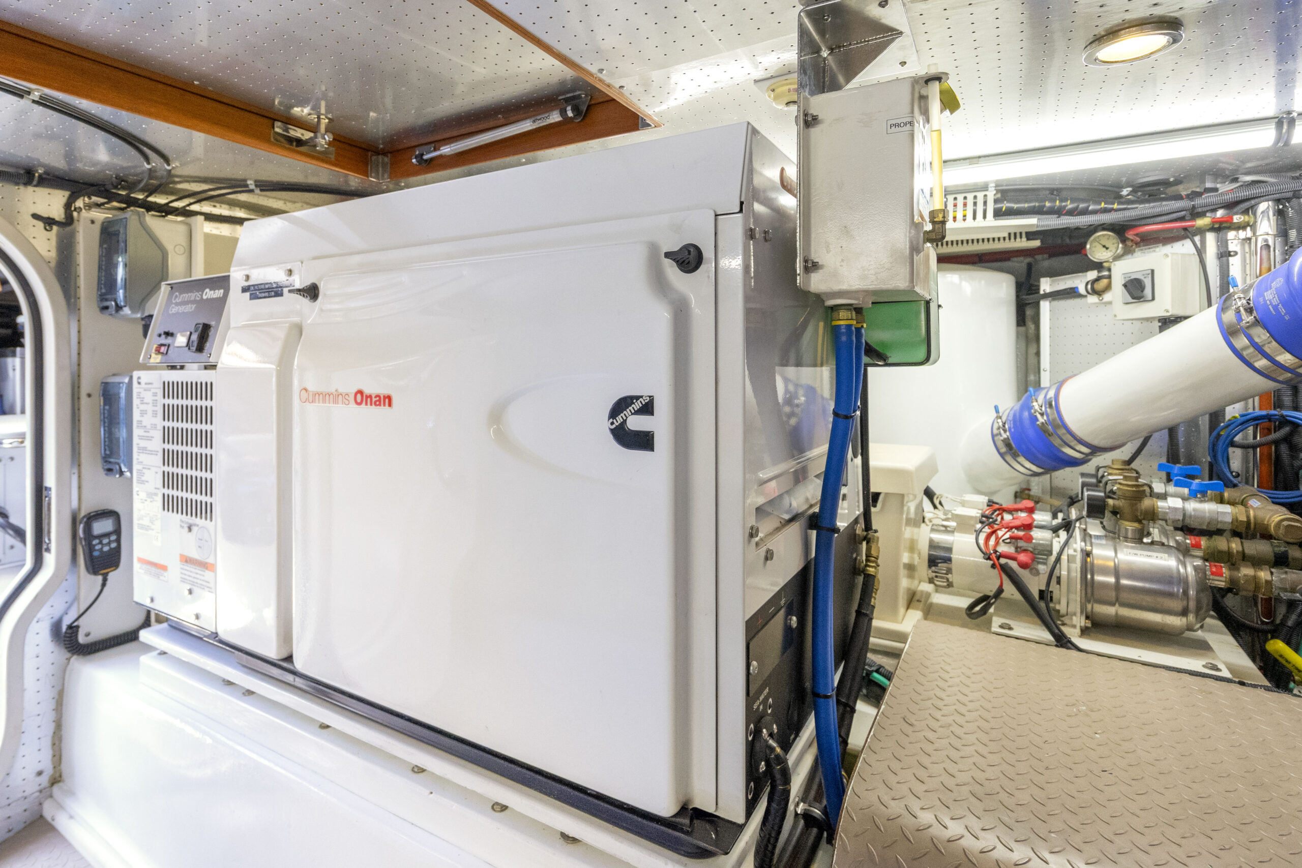 Following the five short steps straight down from the salon will lead you to the central passage of the accommodations. This traditional layout has been a signature mainstay in the Fleming 55 and provides an easy and convenient flow of traffic throughout the boat. The central accommodations passage also makes it possible to appreciate the full length of the vessel from forepeak bulkhead to transom. Once in the passageway you will find a two-berth bunk arrangement in the guest cabin to starboard and a VIP guest stateroom to port with a two-berth convertible queen arrangement. Just forward of the starboard side guest stateroom in the passageway is a full-sized Bosch Axxis 220v washer & separate dryer followed by the guest head. The en-suite master stateroom tops off the accommodations at the forward peak.