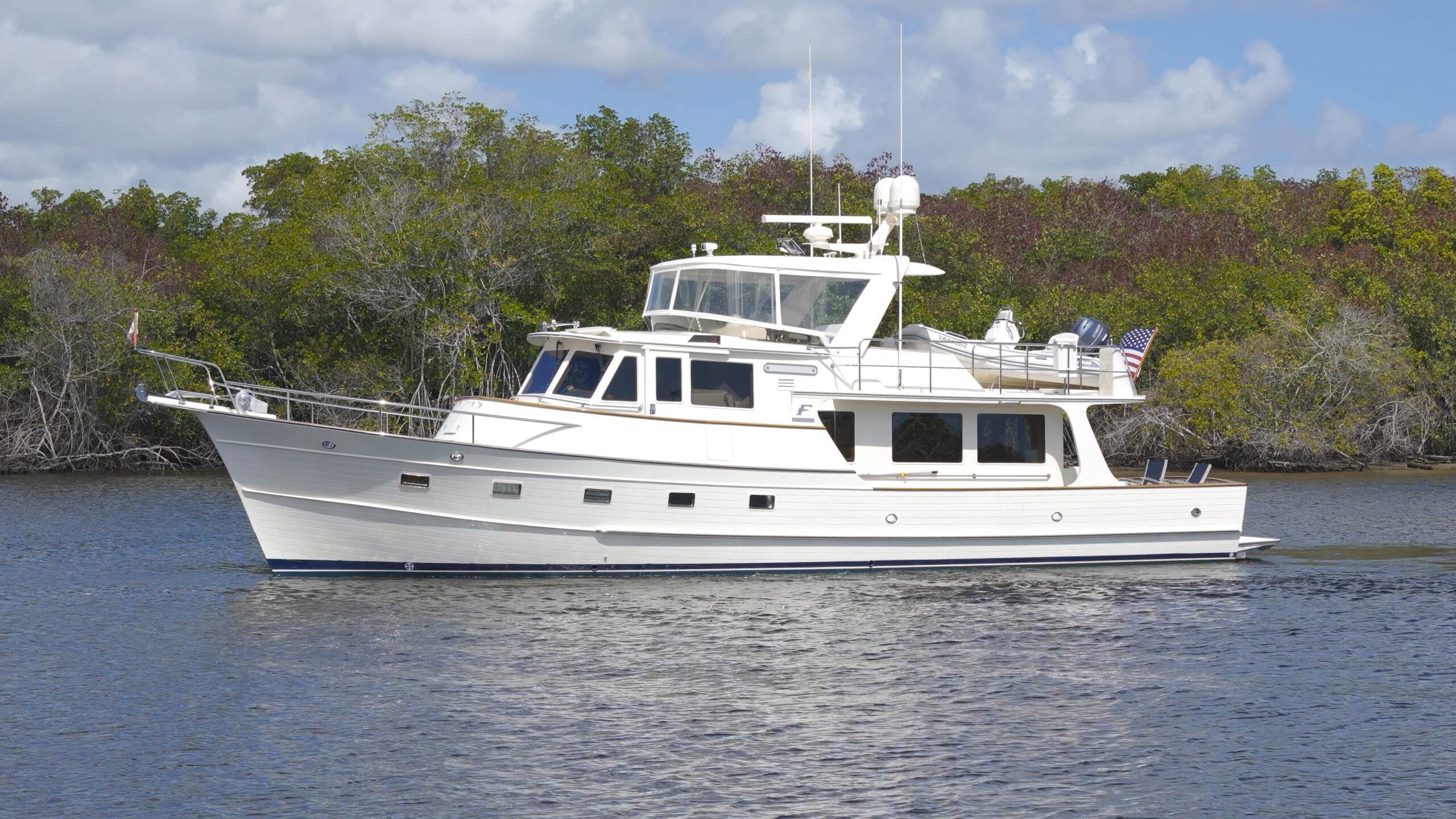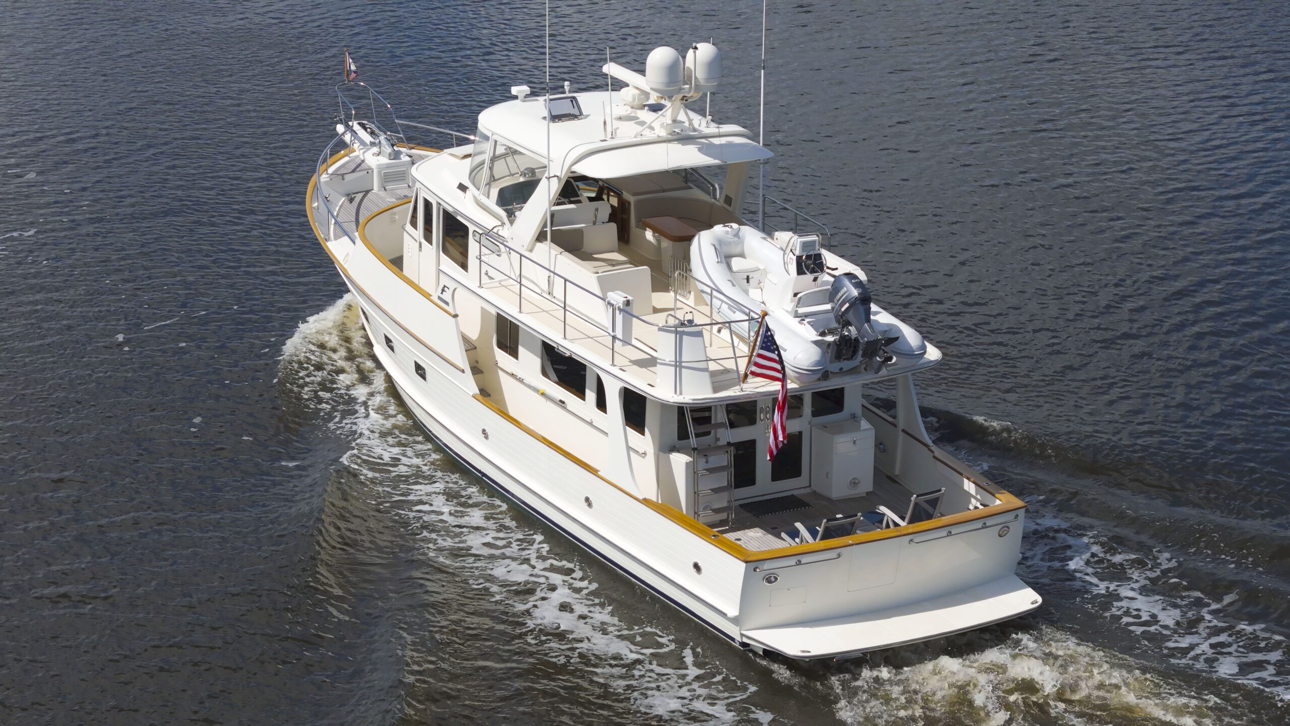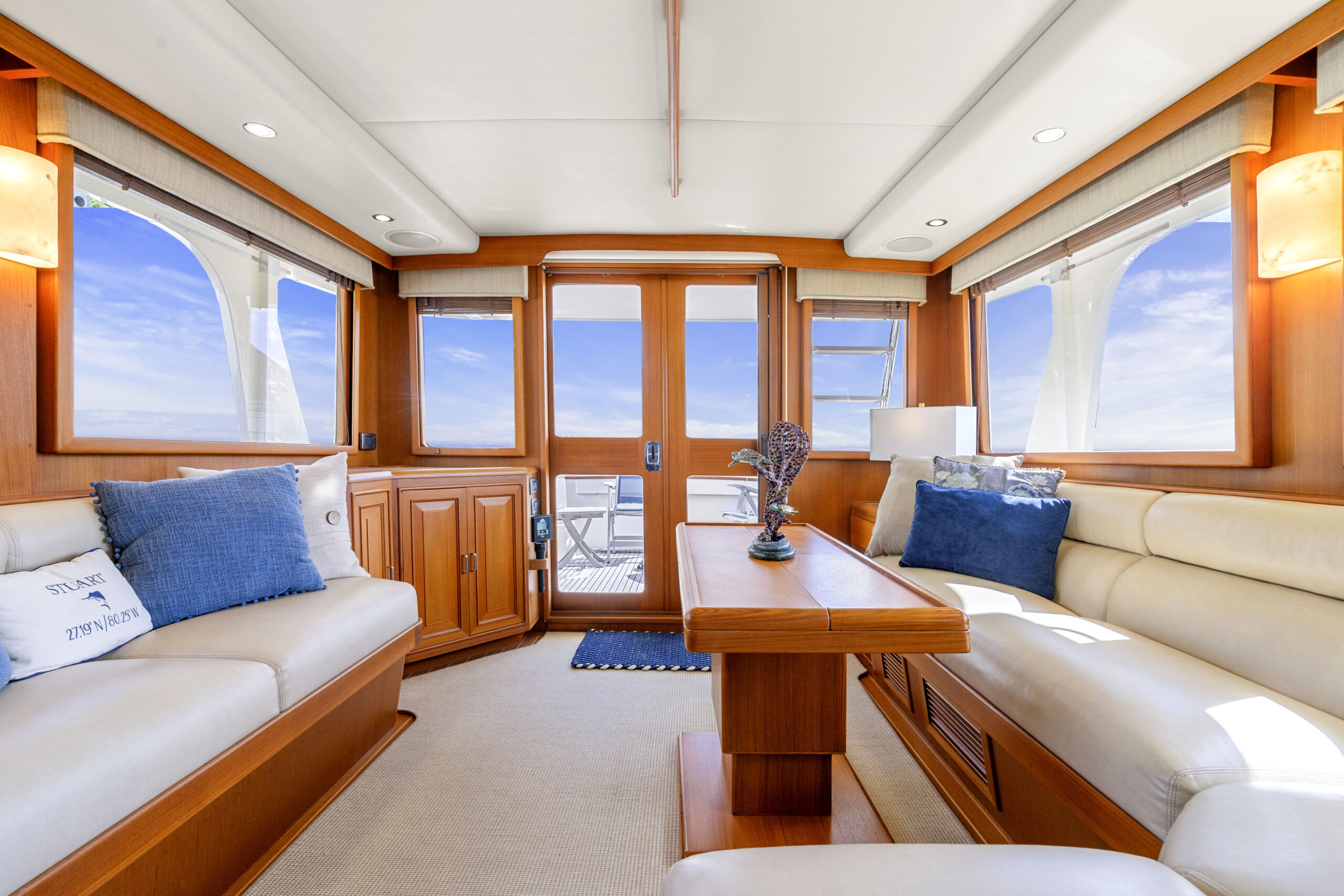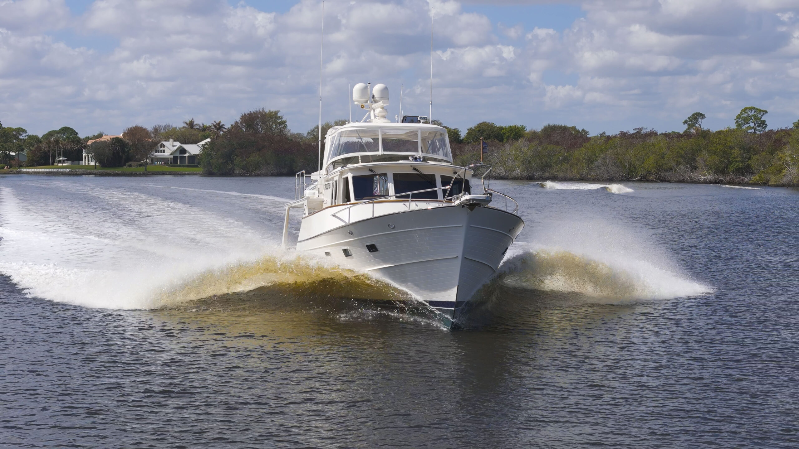 Following the five short steps straight down from the salon will lead you to the central passage of the accommodations. This traditional layout has been a signature mainstay in the Fleming 55 and provides an easy and convenient flow of traffic throughout the boat. The central accommodations passage also makes it possible to appreciate the full length of the vessel from forepeak bulkhead to transom. Once in the passageway you will find a two-berth bunk arrangement in the guest cabin to starboard and a VIP guest stateroom to port with a two-berth convertible queen arrangement. Just forward of the starboard side guest stateroom in the passageway is a full-sized Bosch Axxis 220v washer & separate dryer followed by the guest head. The en-suite master stateroom tops off the accommodations at the forward peak.