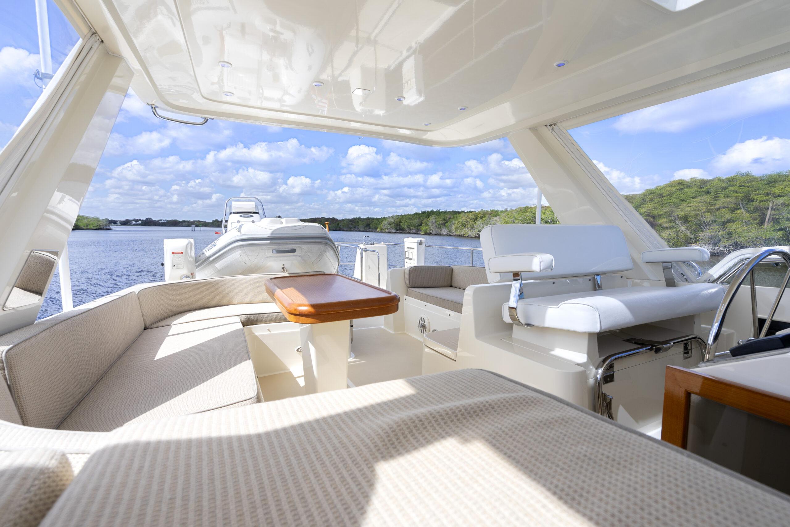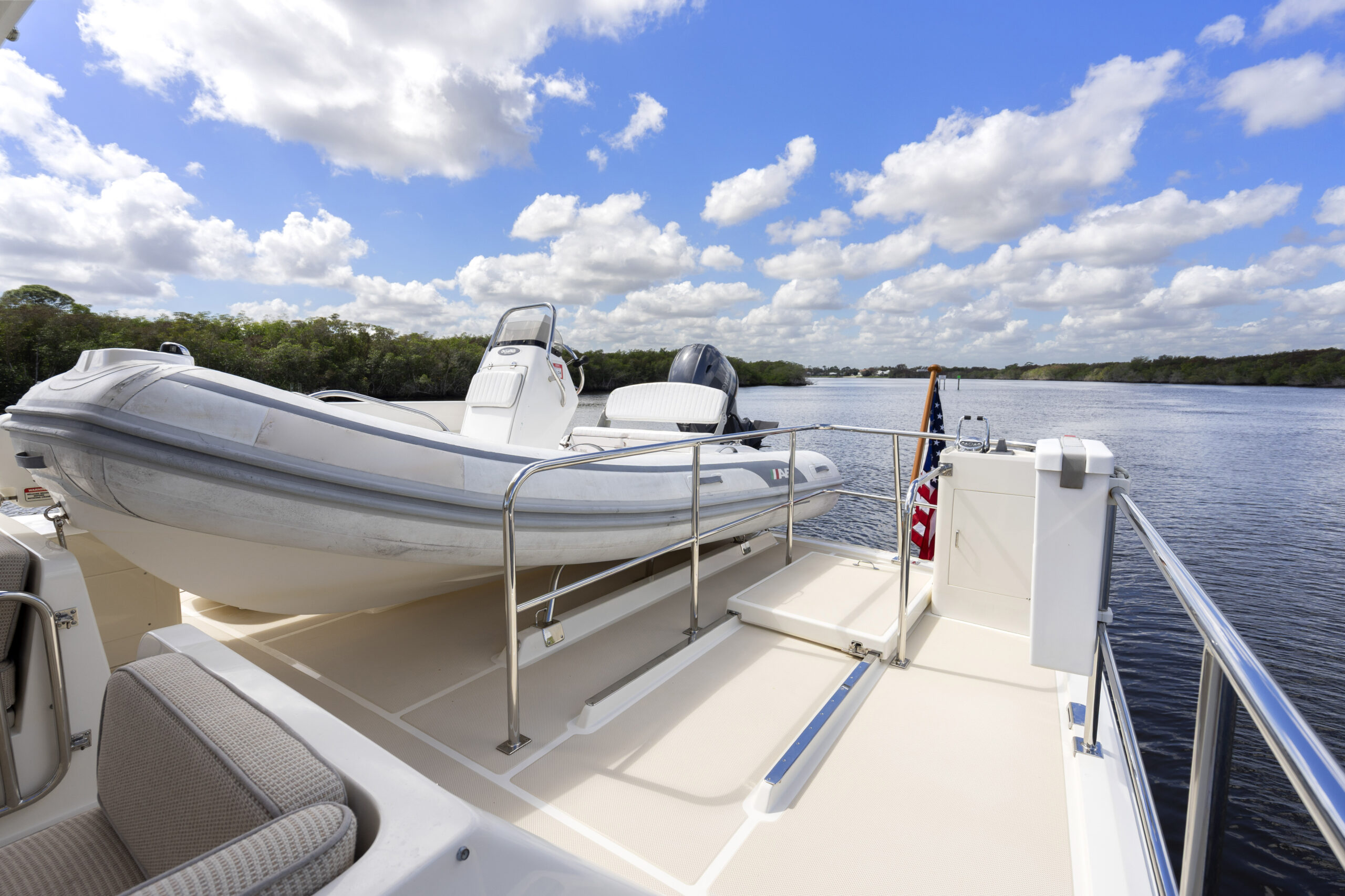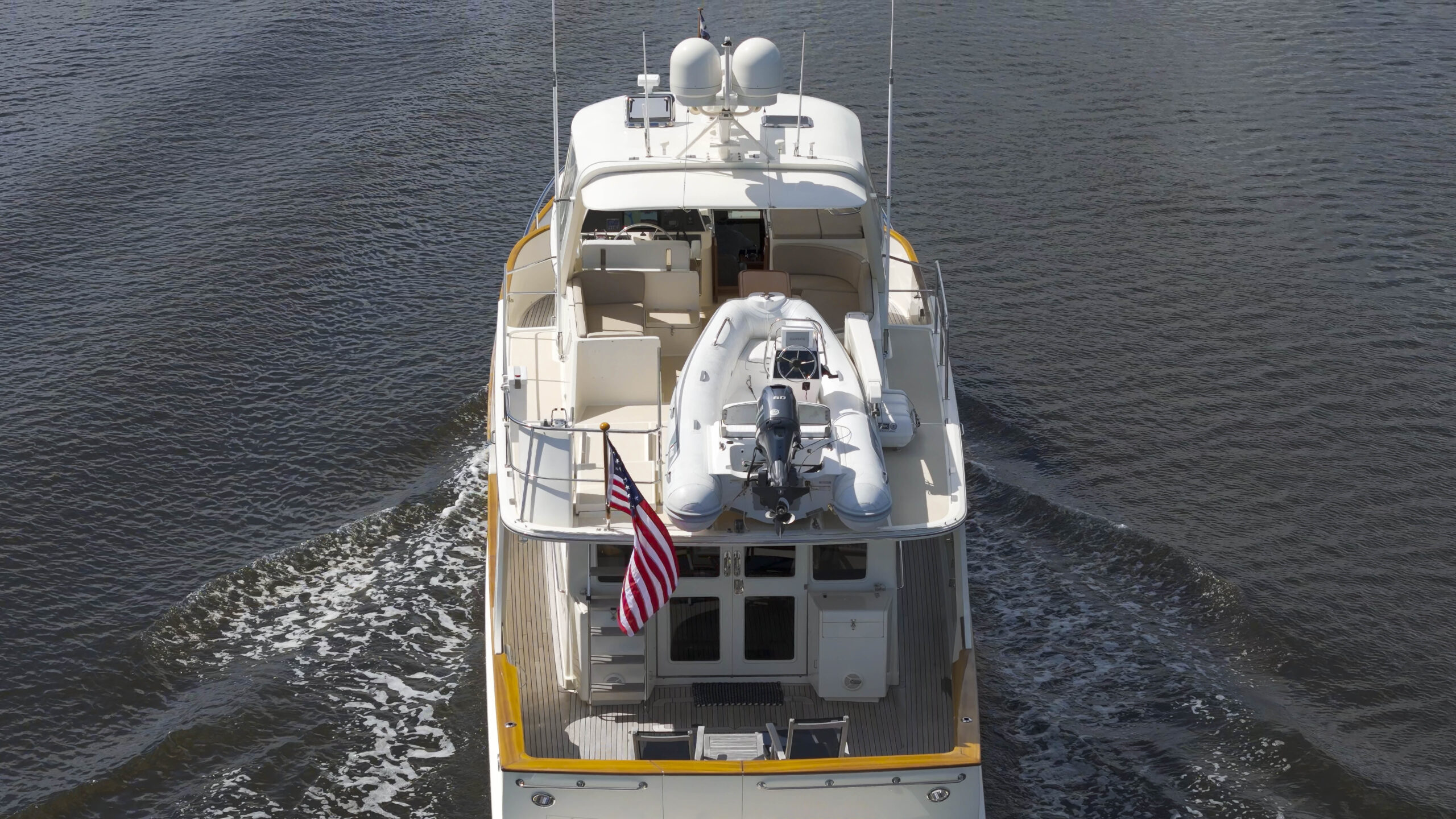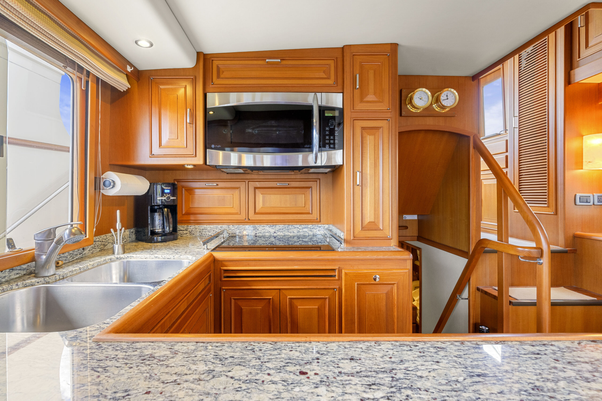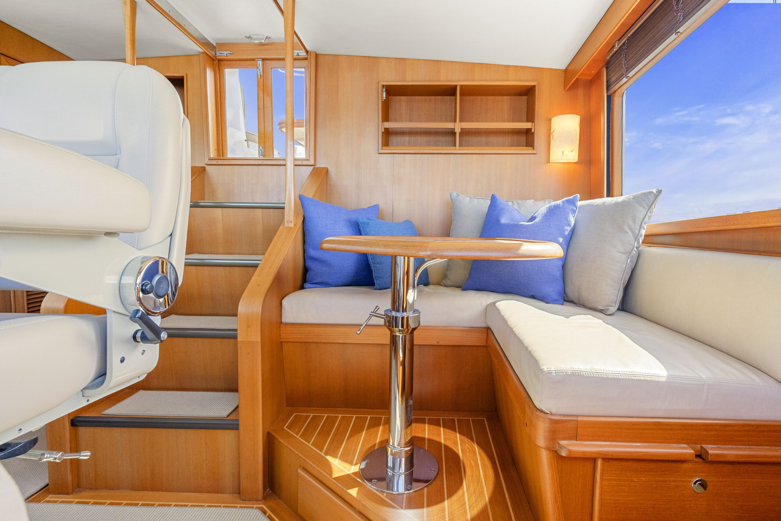 Following the five short steps straight down from the salon will lead you to the central passage of the accommodations. This traditional layout has been a signature mainstay in the Fleming 55 and provides an easy and convenient flow of traffic throughout the boat. The central accommodations passage also makes it possible to appreciate the full length of the vessel from forepeak bulkhead to transom. Once in the passageway you will find a two-berth bunk arrangement in the guest cabin to starboard and a VIP guest stateroom to port with a two-berth convertible queen arrangement. Just forward of the starboard side guest stateroom in the passageway is a full-sized Bosch Axxis 220v washer & separate dryer followed by the guest head. The en-suite master stateroom tops off the accommodations at the forward peak.
