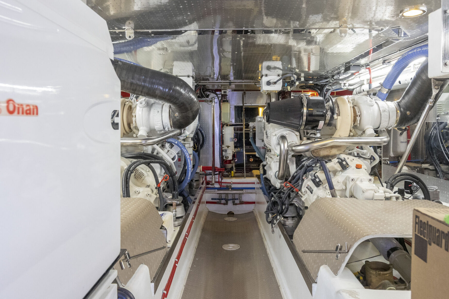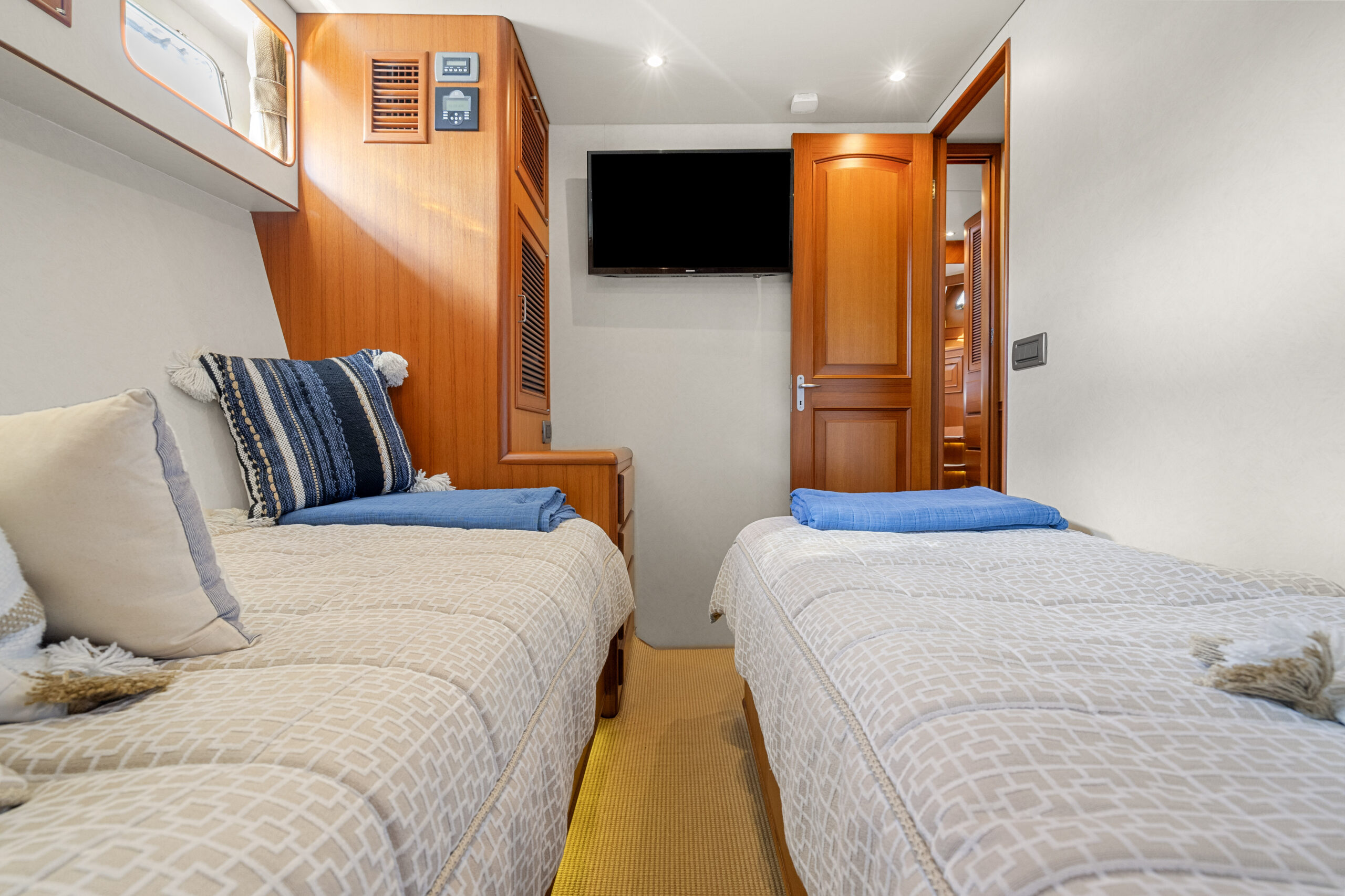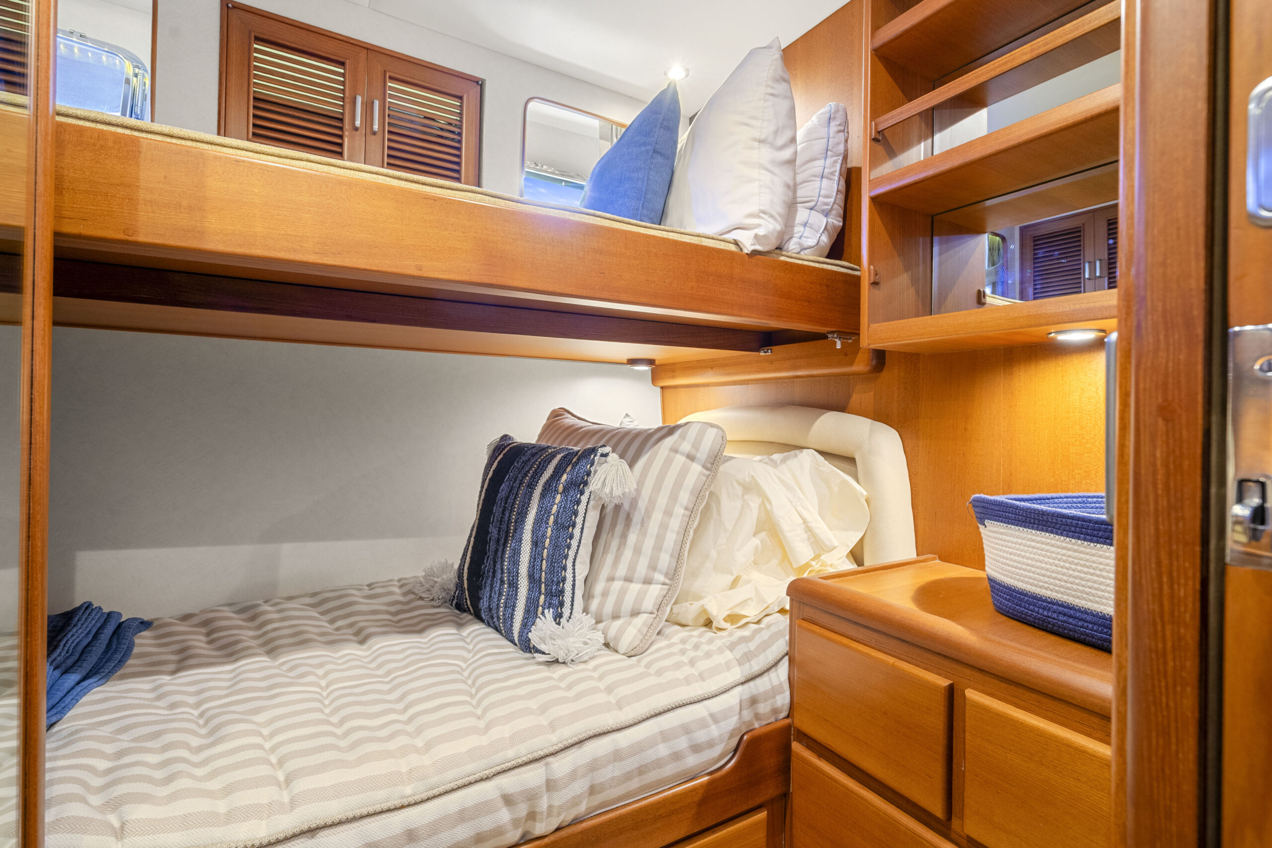 The port stateroom features two twin berths with a nightstand separating them. The nightstand can be removed and placed to the outboard corner to allow the twin berths to slide together in order to create a “convertible” queen when needed. Along the forward wall of the stateroom is a hanging locker with drawers below, a wall-mounted 32” flat screen Samsung HD TV (2024), and a full length mirror. Additional storage is found through shelving above and drawers below the berths. The starboard stateroom features twin berths in a bunk arrangement with the top bunk capable of sliding in towards the outboard wall to provide more space for a single guest. There is a full length mirror on the forward wall and storage is provided via drawers, shelving, and a nightstand. All berths feature new custom bedding (2025).