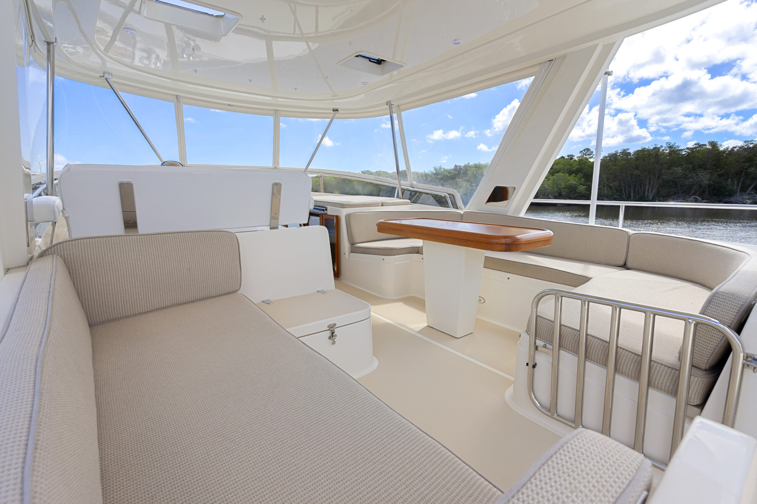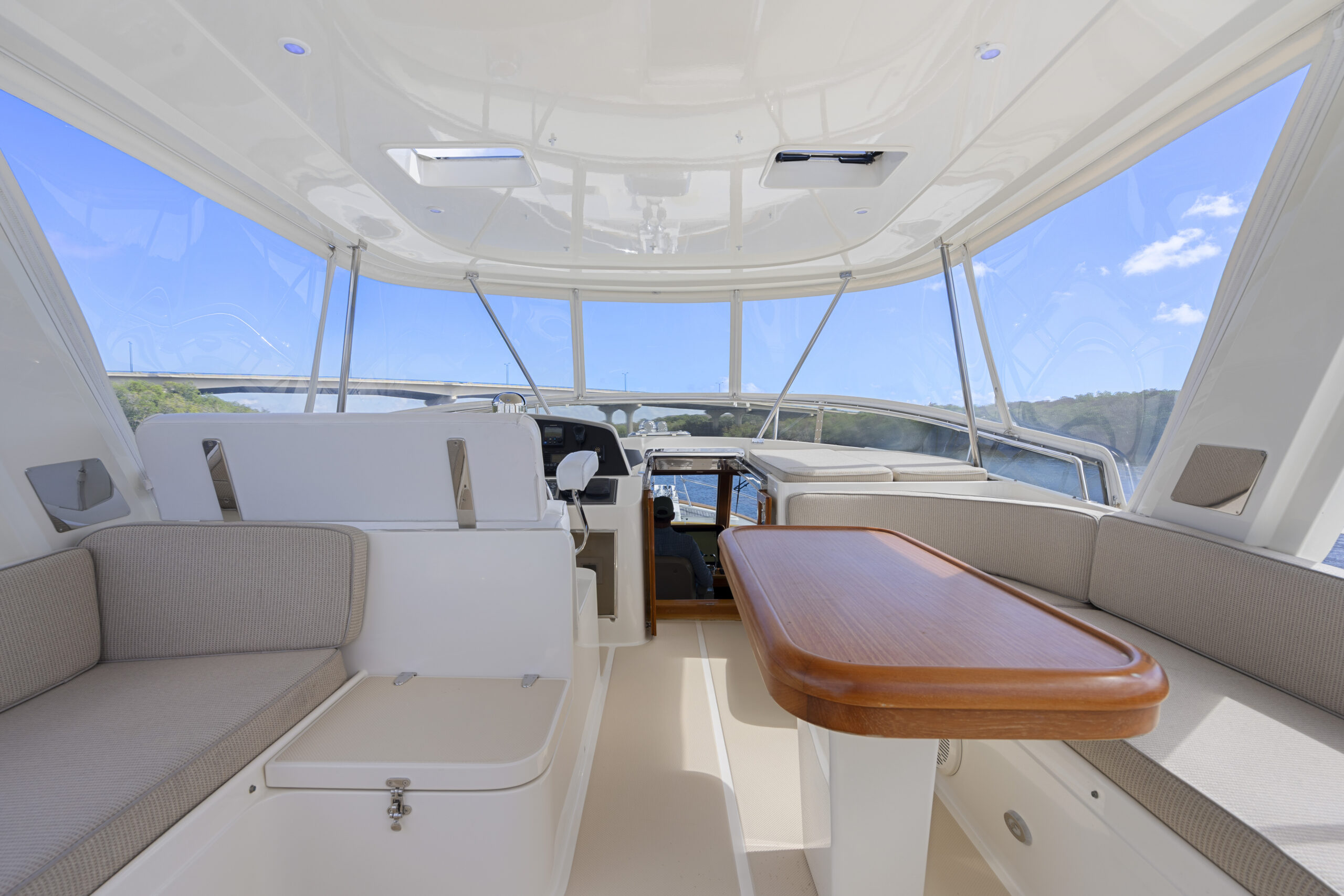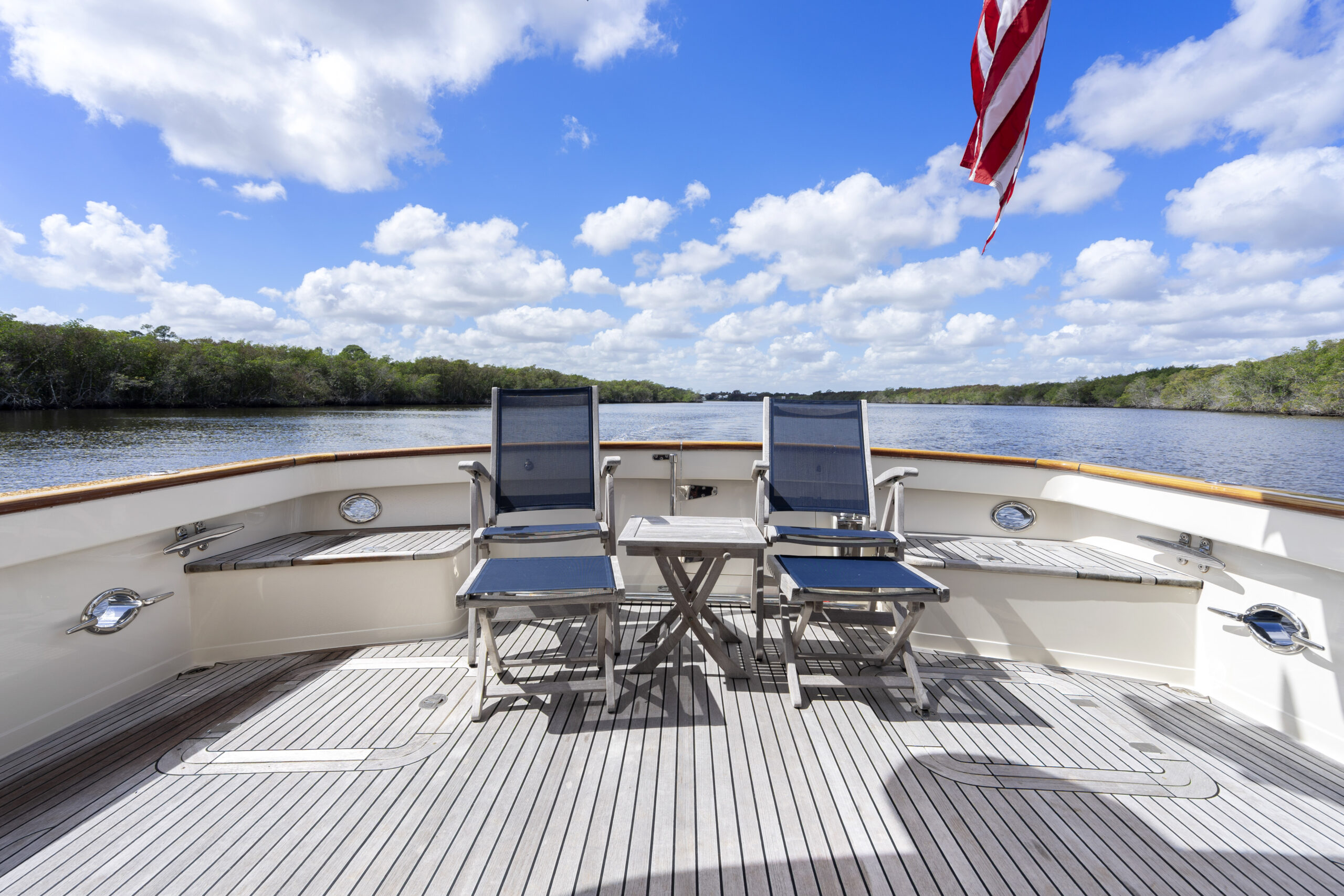 The port stateroom features two twin berths with a nightstand separating them. The nightstand can be removed and placed to the outboard corner to allow the twin berths to slide together in order to create a “convertible” queen when needed. Along the forward wall of the stateroom is a hanging locker with drawers below, a wall-mounted 32” flat screen Samsung HD TV (2024), and a full length mirror. Additional storage is found through shelving above and drawers below the berths. The starboard stateroom features twin berths in a bunk arrangement with the top bunk capable of sliding in towards the outboard wall to provide more space for a single guest. There is a full length mirror on the forward wall and storage is provided via drawers, shelving, and a nightstand. All berths feature new custom bedding (2025).