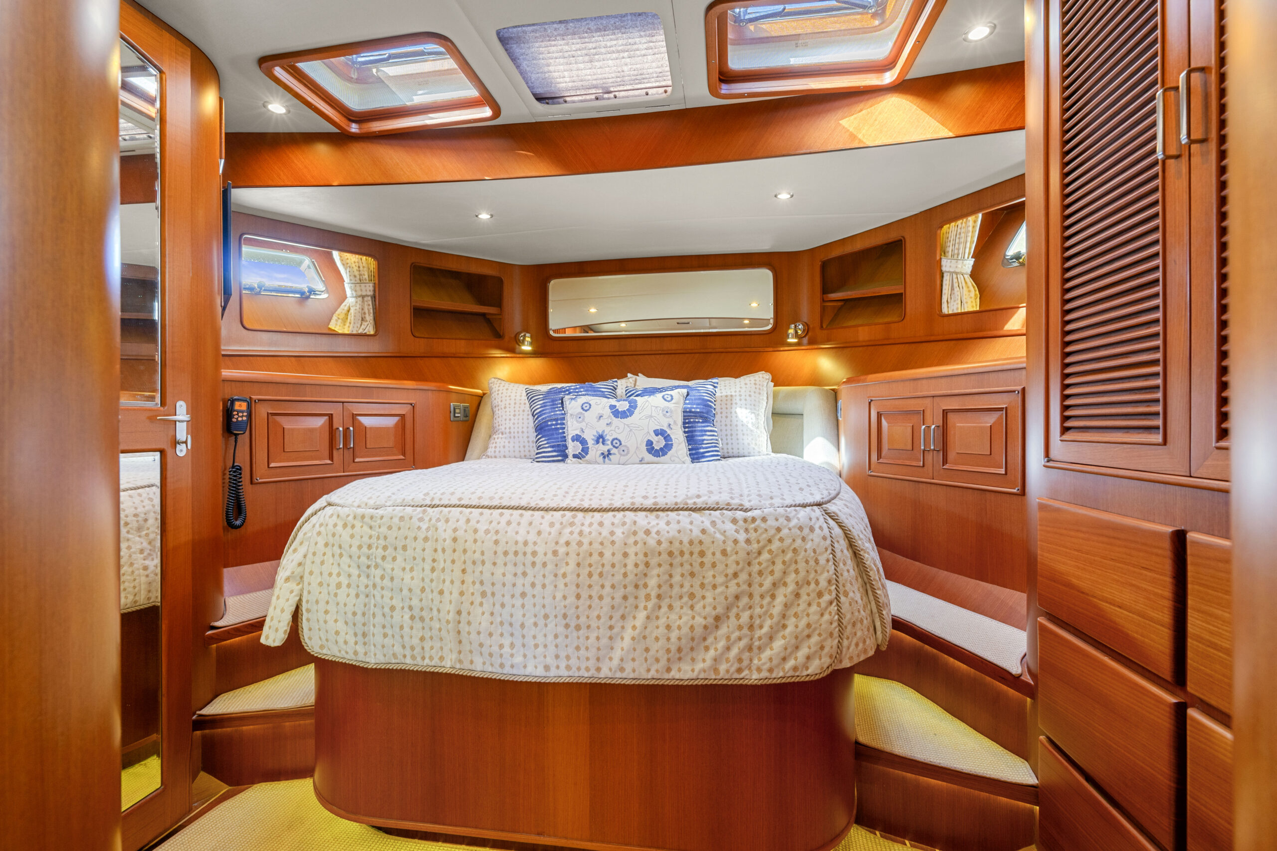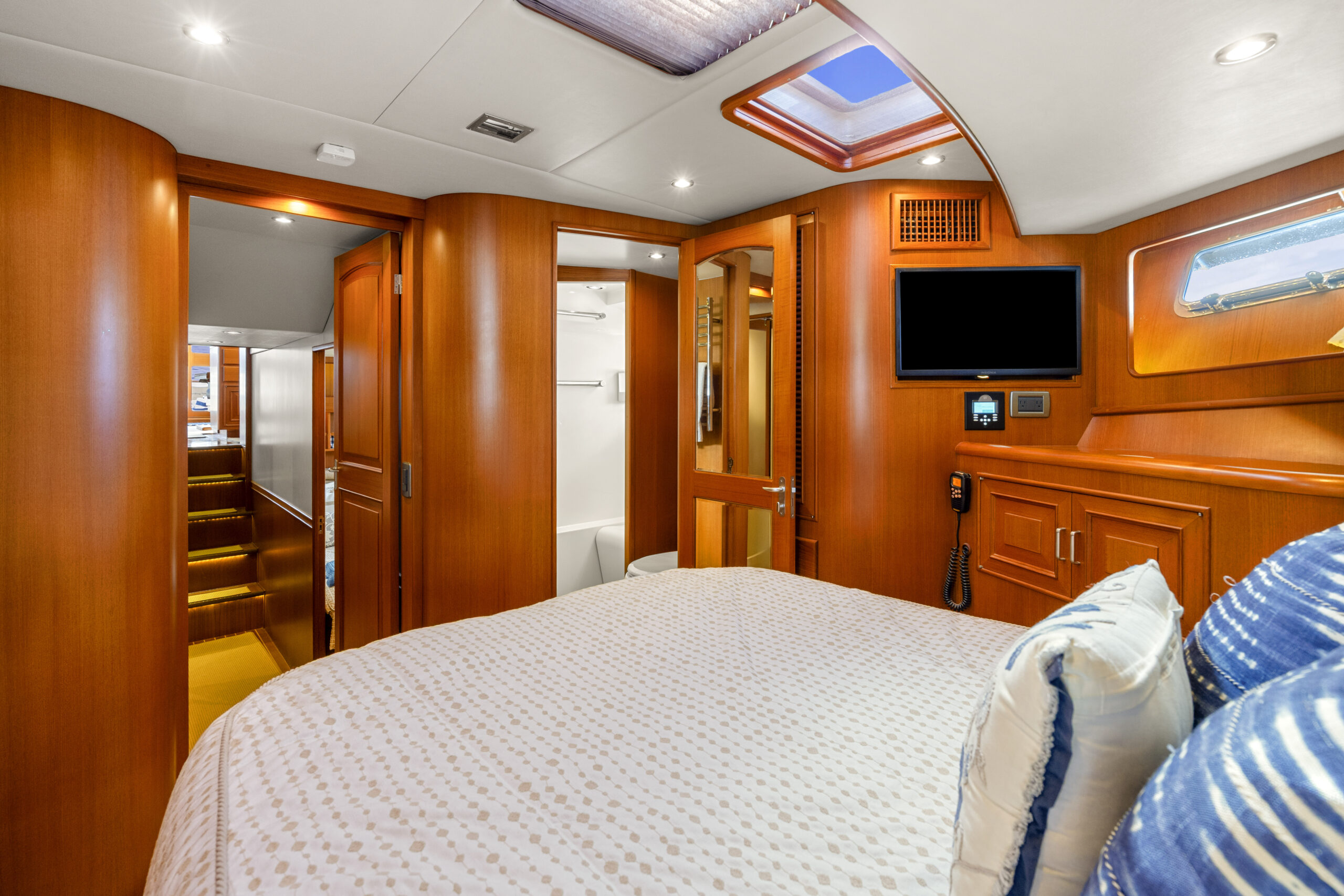 The master stateroom is composed of a queen sized island berth surrounded by shelves, cabinets, drawers, and his & hers hanging lockers to each side. The island berth arrangement allows for access from either side and the berth can be raised with a hydraulic lift to access a large storage cavity underneath, perfect for storing extra bed linens or keeping valuables out of sight. Over head are two skylights and a escape hatch which, along with port holes to each side, provide natural light to the cabin. To the port side aft wall is a mounted 24” Insignia HD TV (2024) facing the berth, also to the port side of the stateroom is access to the master head. A Piezo horn drift alarm is installed within the master closet, connected to the TZTBB and AIS.