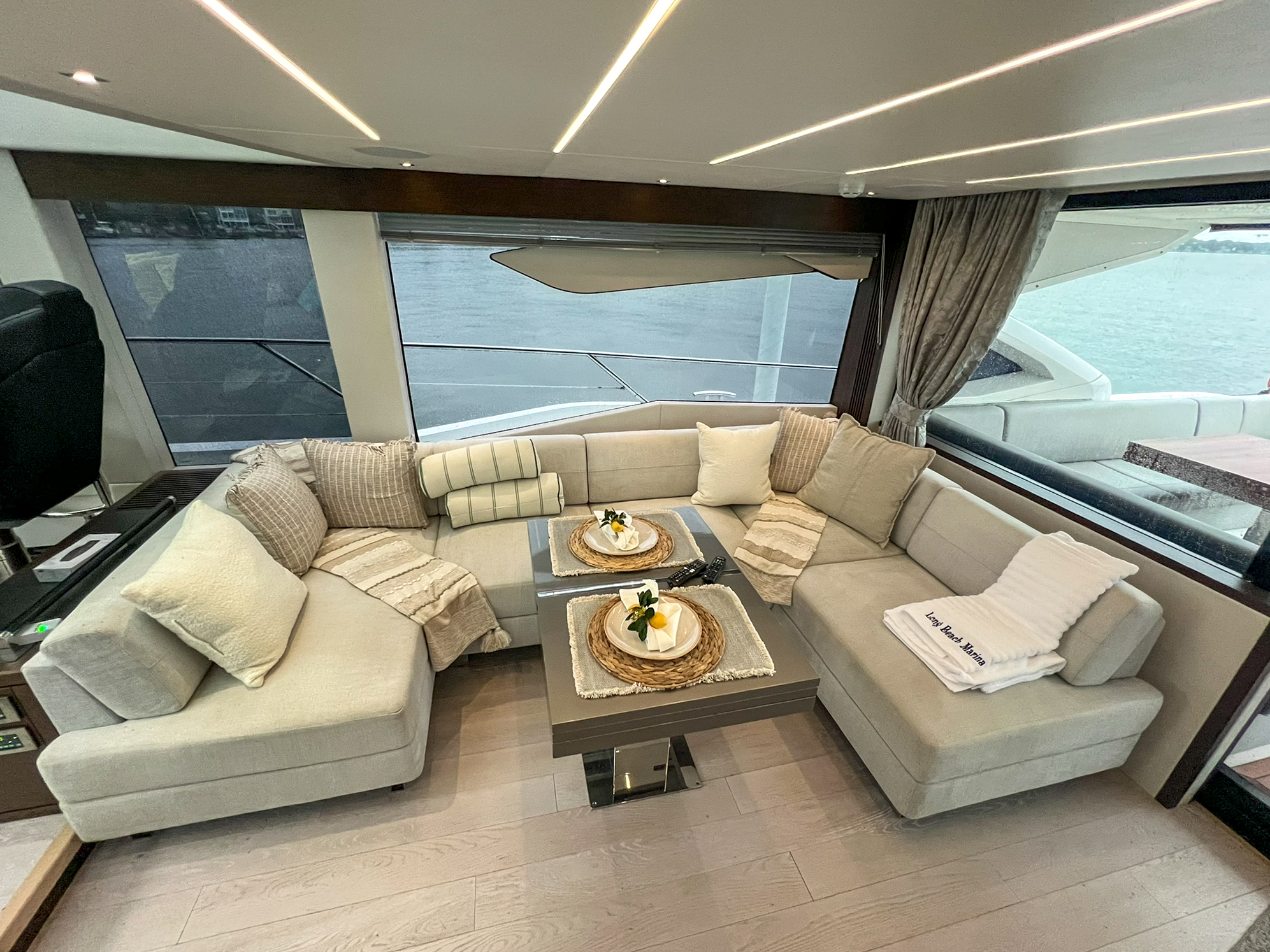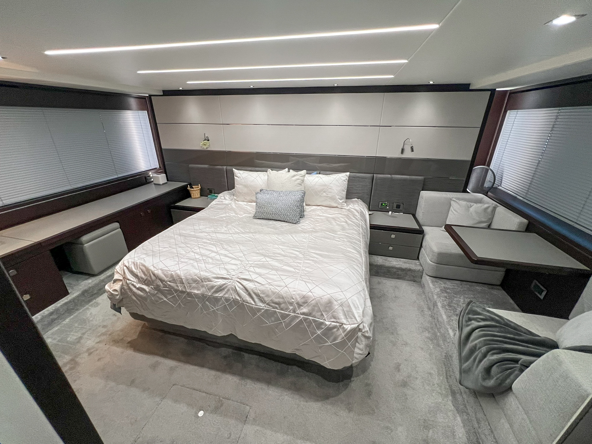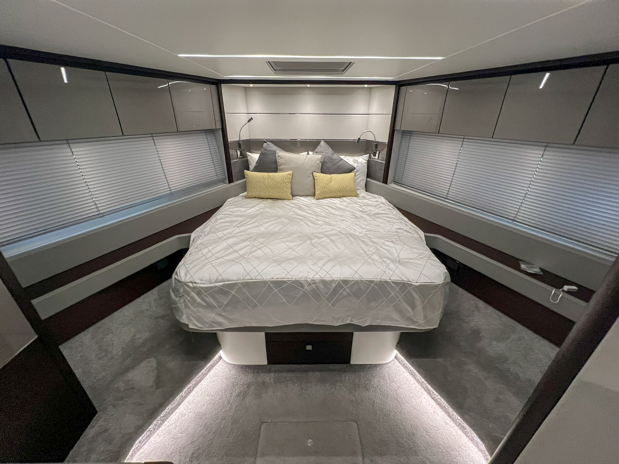 The new Predator 74 has all the hallmarks of greatness. Striking style, remarkable power and an innovative use of light and space. This latest Sunseeker can accommodate whatever your lifestyle desires. Lazy afternoons soaking up the sun on her spacious exterior decks or putting her through her paces at speeds up to 40 knots across the blue waters. The new Predator 74 has been built without compromise and without equal. Perhaps most breathtaking is the exterior, with sleek yet oversized pillarless windows down to the side deck. Providing uninterrupted views of your surroundings and letting natural light completely flood the interior. On top of this, you’ll find a cleverly engineered cockpit door mechanism which opens conventionally, or lowers itself completely into the sole of the yacht – all at the simple flick of a switch. So offering the best of both worlds; to suit you and the environment you’re travelling in. Inside, the generous saloon proves to be the perfect spot for entertaining, with a sumptuous seating area, ample storage and comprehensive port-side bar console; all below an extraordinary panoramic glass sliding roof. Every cabin is equipped with state of the art entertainment and the attention to detail is flawless. Guests will feel truly pampered in whichever one of the guest cabins they dwell with the master stateroom offering exceptional space and the flexibility of a walk-in wardrobe.